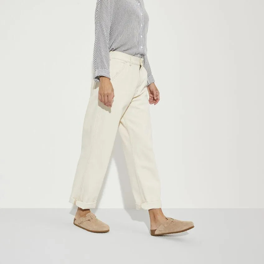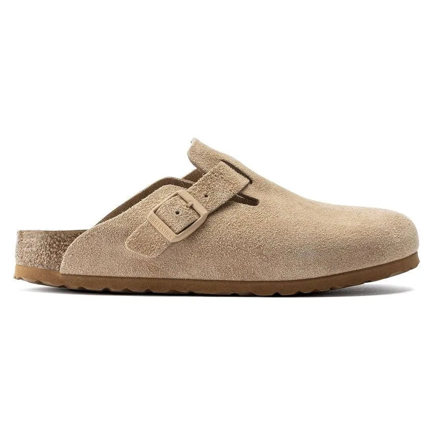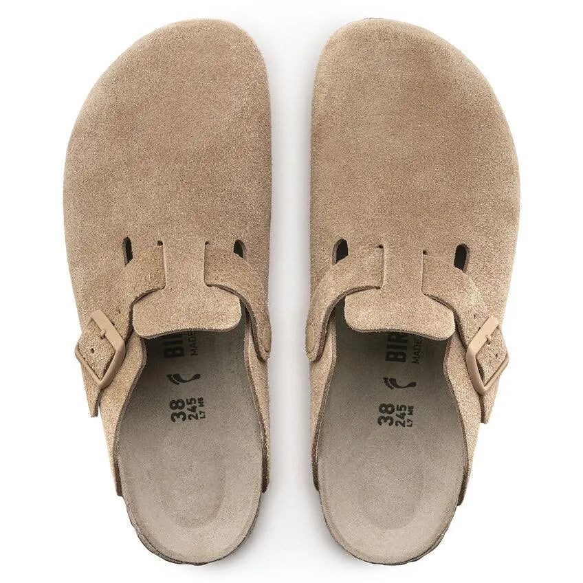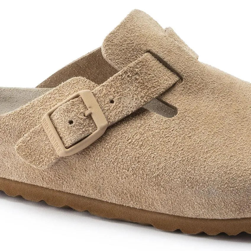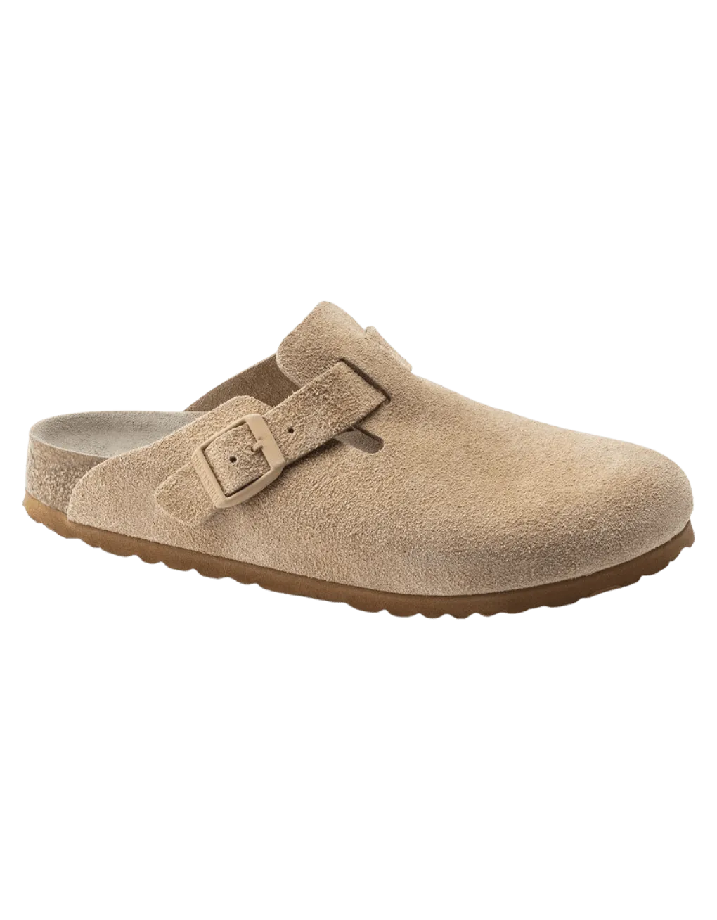 El zueco Boston de BIRKENSTOCK es un auténtico clásico que se puede llevar sin problema durante todo el año. Las hebillas en color a juego con tacto de tela y diseño mate, así como la suela en color a juego, son otros de los elementos destacados. El material superior está compuesto por suave ante.