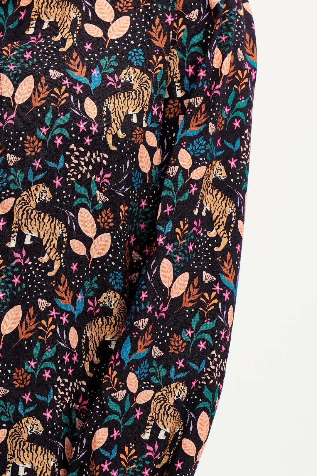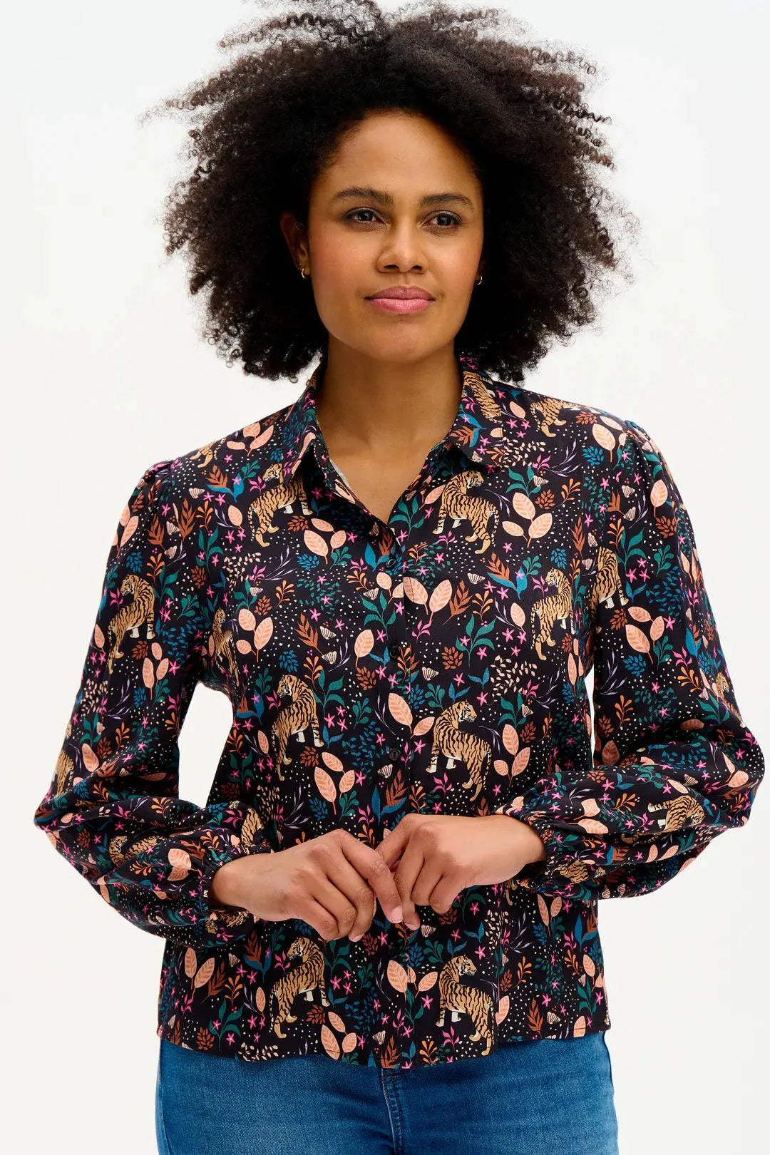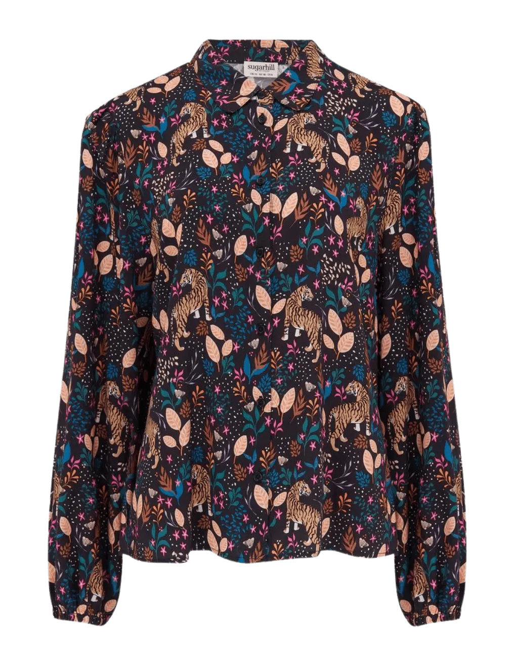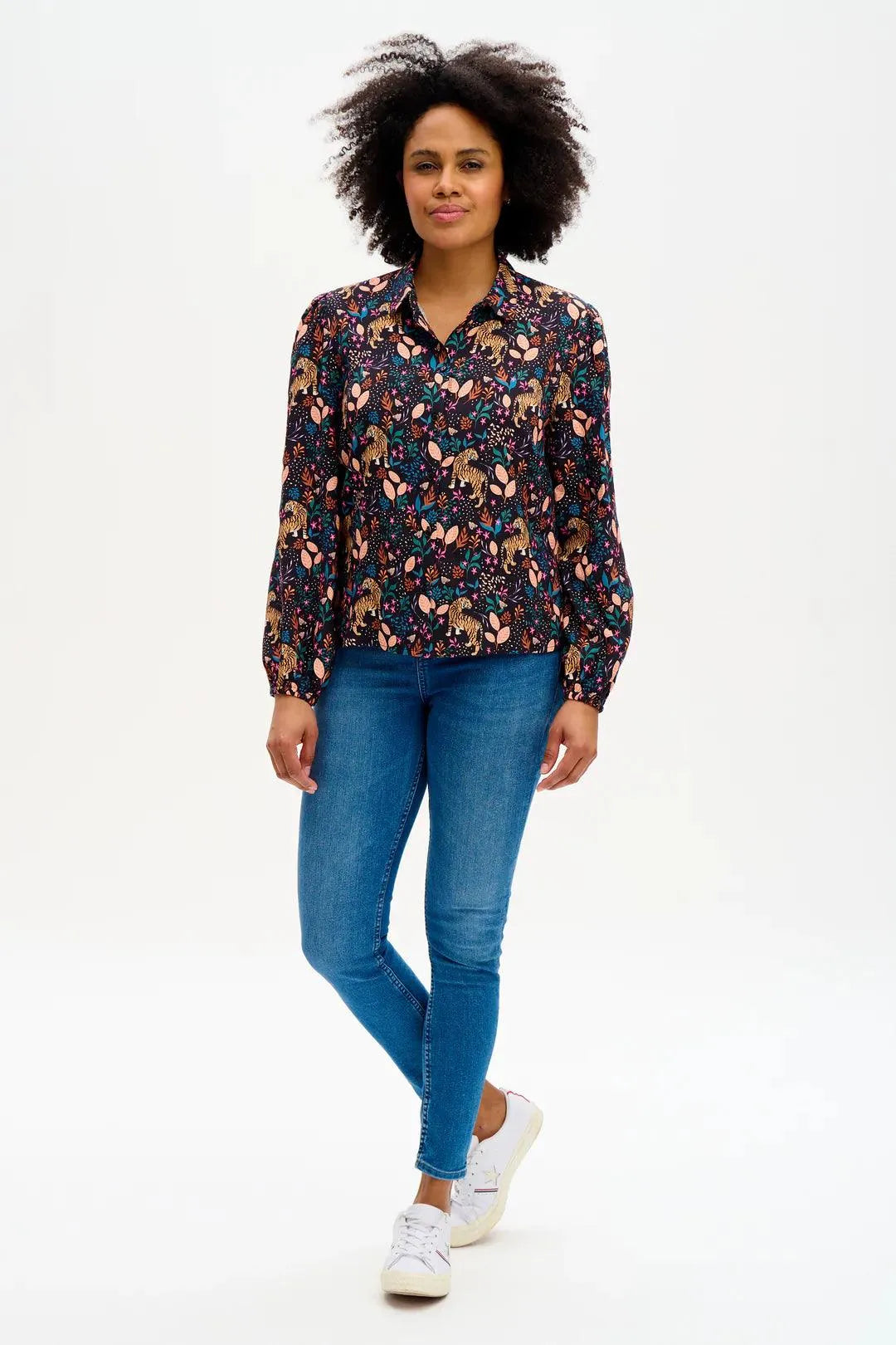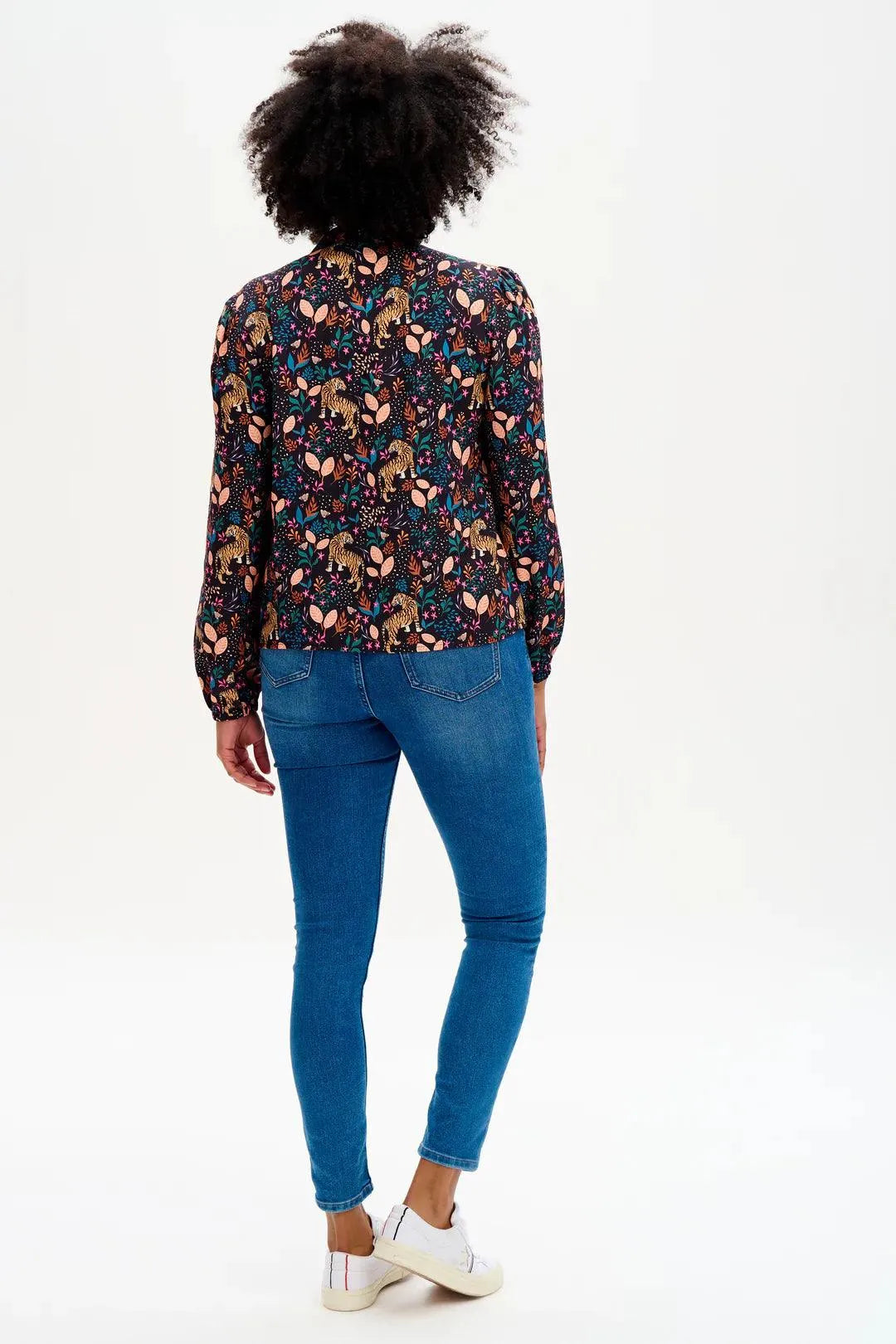 Das Liza ist eine neue, feminine Hemdform und hat ein klares Retro-Feeling. Der halb taillierte Schnitt mit Puffschulternähten, Blousonärmeln und elastischen Bündchen stiehlt vor allem dem süßen runden Kragen die Show. Der Jungle Tigers-Druck wurde von unserer Designerin Olivia handgezeichnet und hat eine magische Ausstrahlung: Tiger streifen durch juwelenfarbenes Blattwerk auf schwarzem Hintergrund.