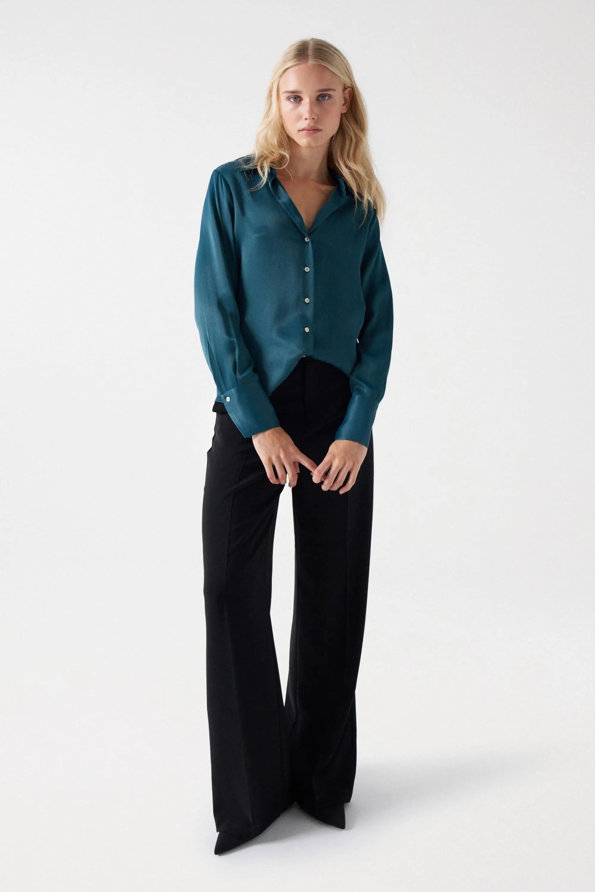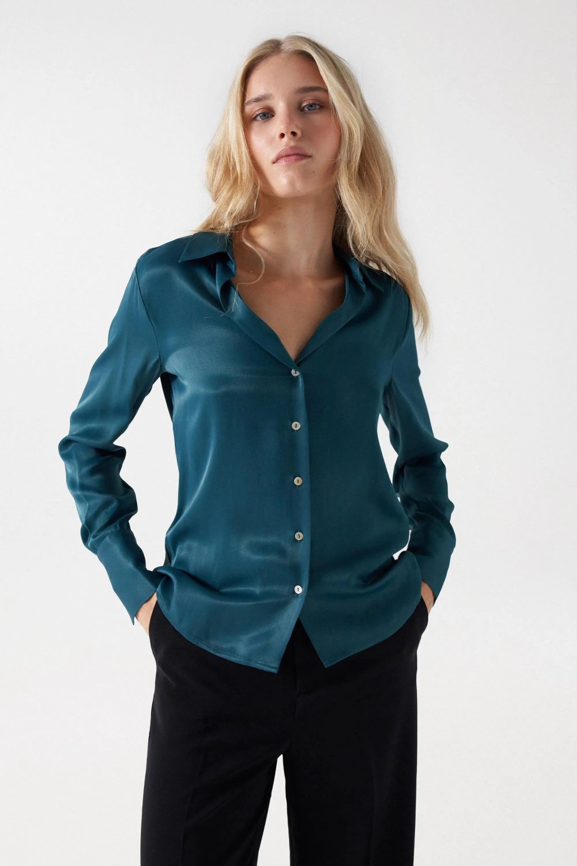 Satinhemd. Grünes Öl. Normaler Schnitt. V-Ausschnitt mit Revers. Lange Ärmel mit Knöpfen. Knopfverschluss.