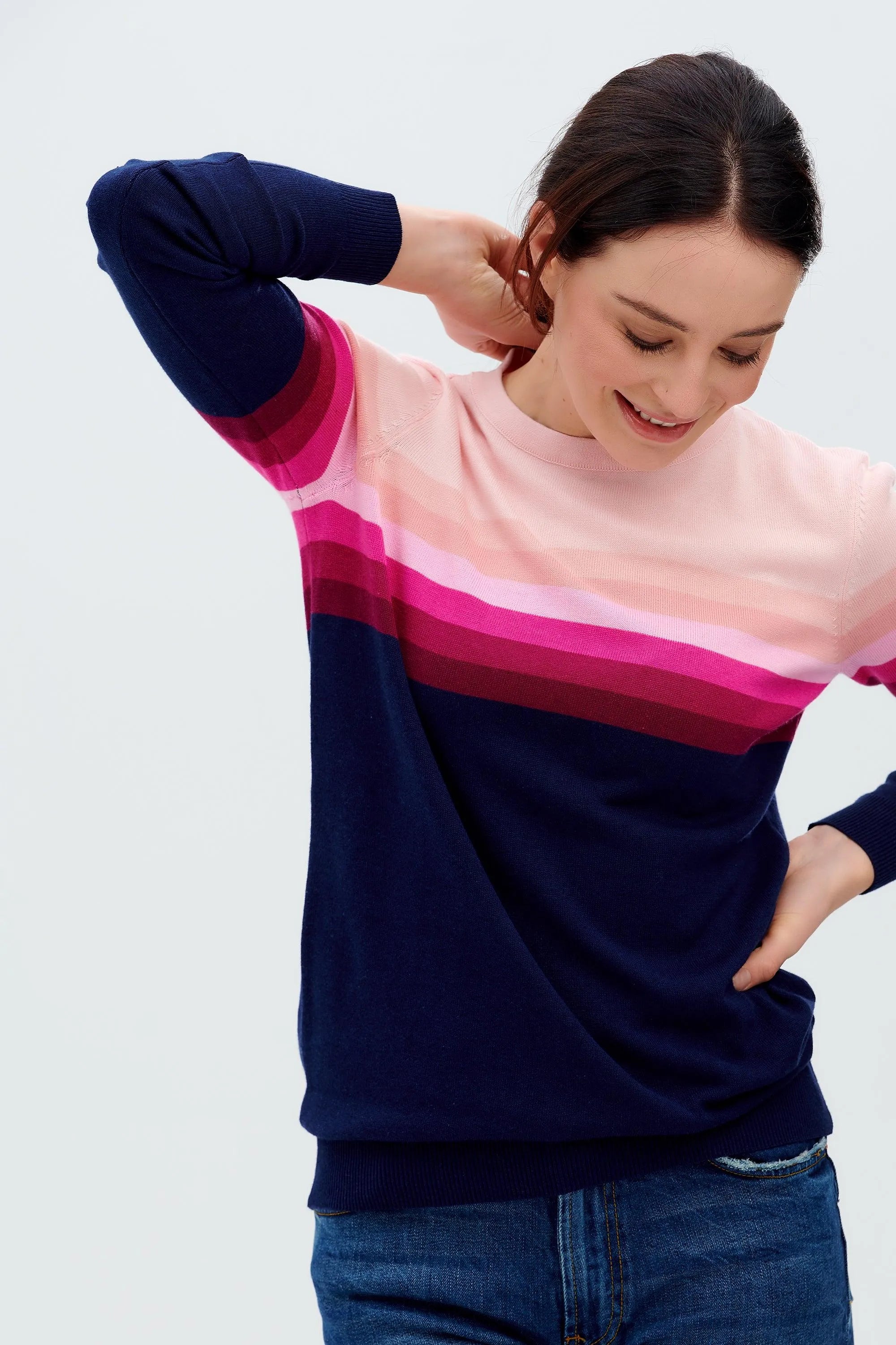 Unser meistverkaufter halb taillierter Rita-Pullover hat eine leichte Baumwollmischung, einen Rundhalsausschnitt und endet in der Mitte der Hüfte. Unsere Auswahl an Designs bietet eine einfache Möglichkeit, Ihrer Garderobe etwas Spaß und Farbe zu verleihen. Das Verlaufsstreifen-Design ist verspielt farbenfroh und kombiniert rosa Ombre-Streifen auf einer klassischen marineblauen Basis.