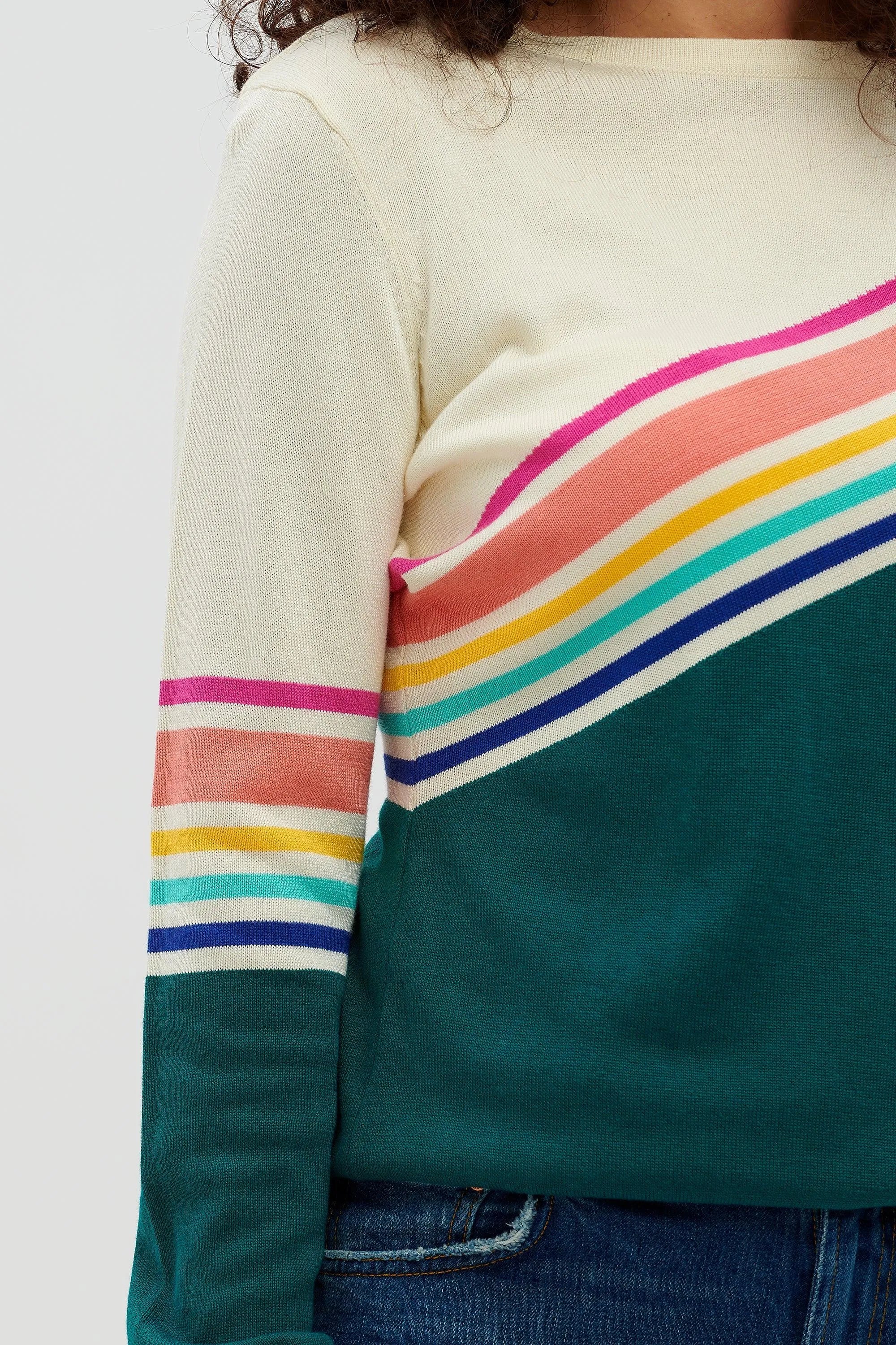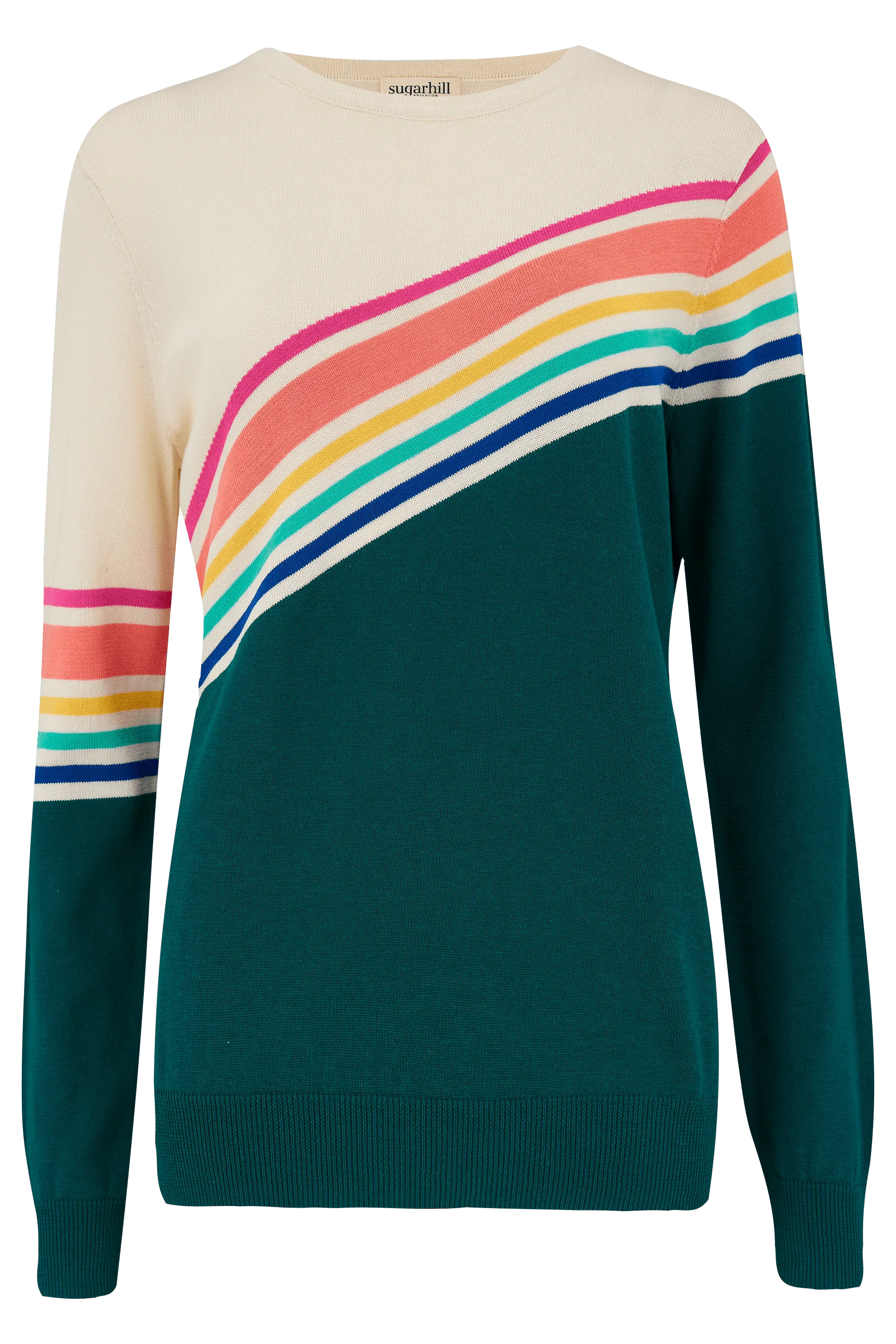 Unser meistverkaufter halb taillierter Rita-Pullover hat eine leichte Baumwollmischung, einen Rundhalsausschnitt und endet in der Mitte der Hüfte. Unsere Auswahl an Designs bietet eine einfache Möglichkeit, Ihrer Garderobe etwas Spaß und Farbe zu verleihen. Das Design von Fracture Spectrum ist verspielt farbenfroh und kombiniert Petrol und Creme, die von farbigen Streifen durchzogen sind.
