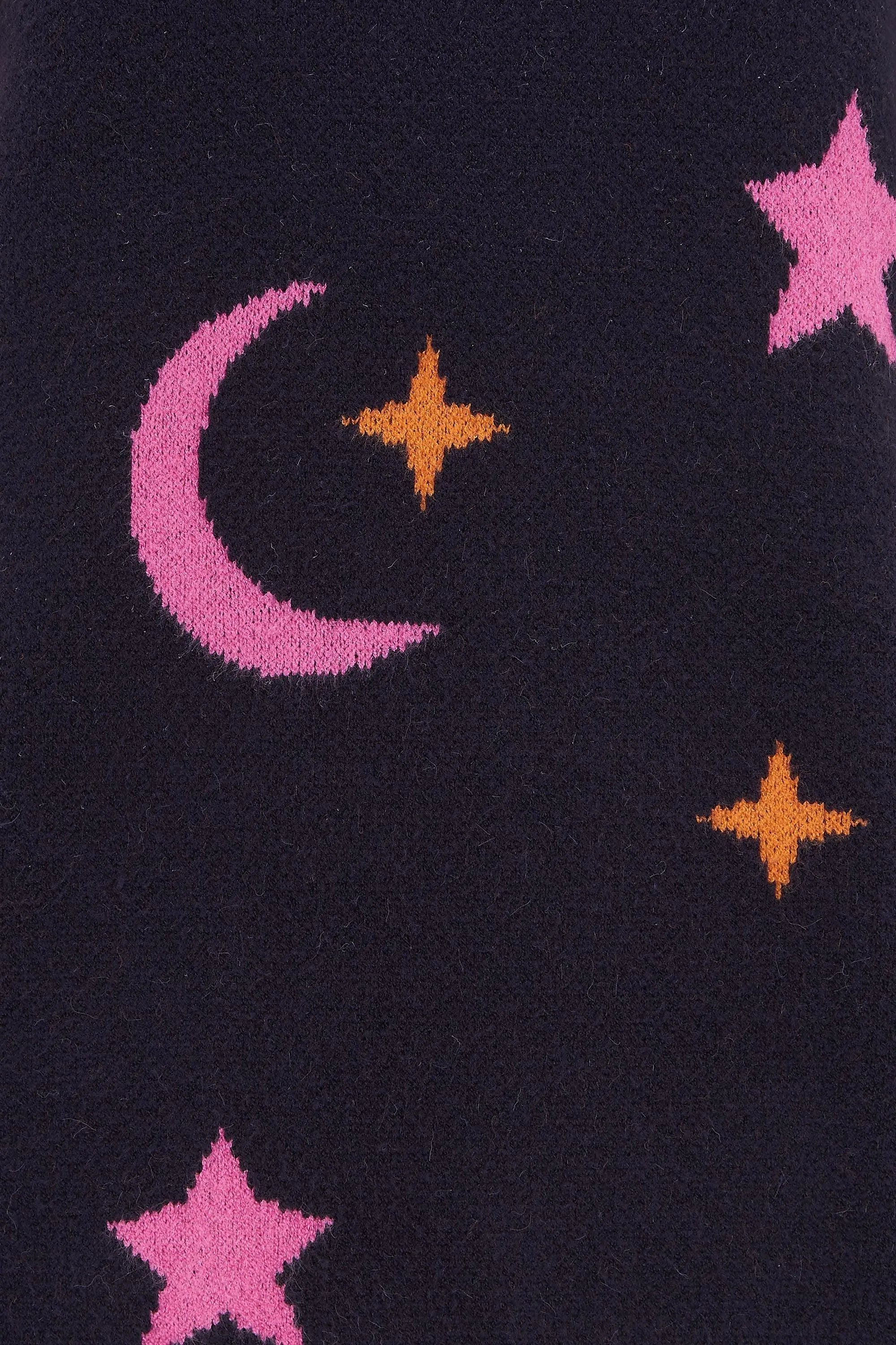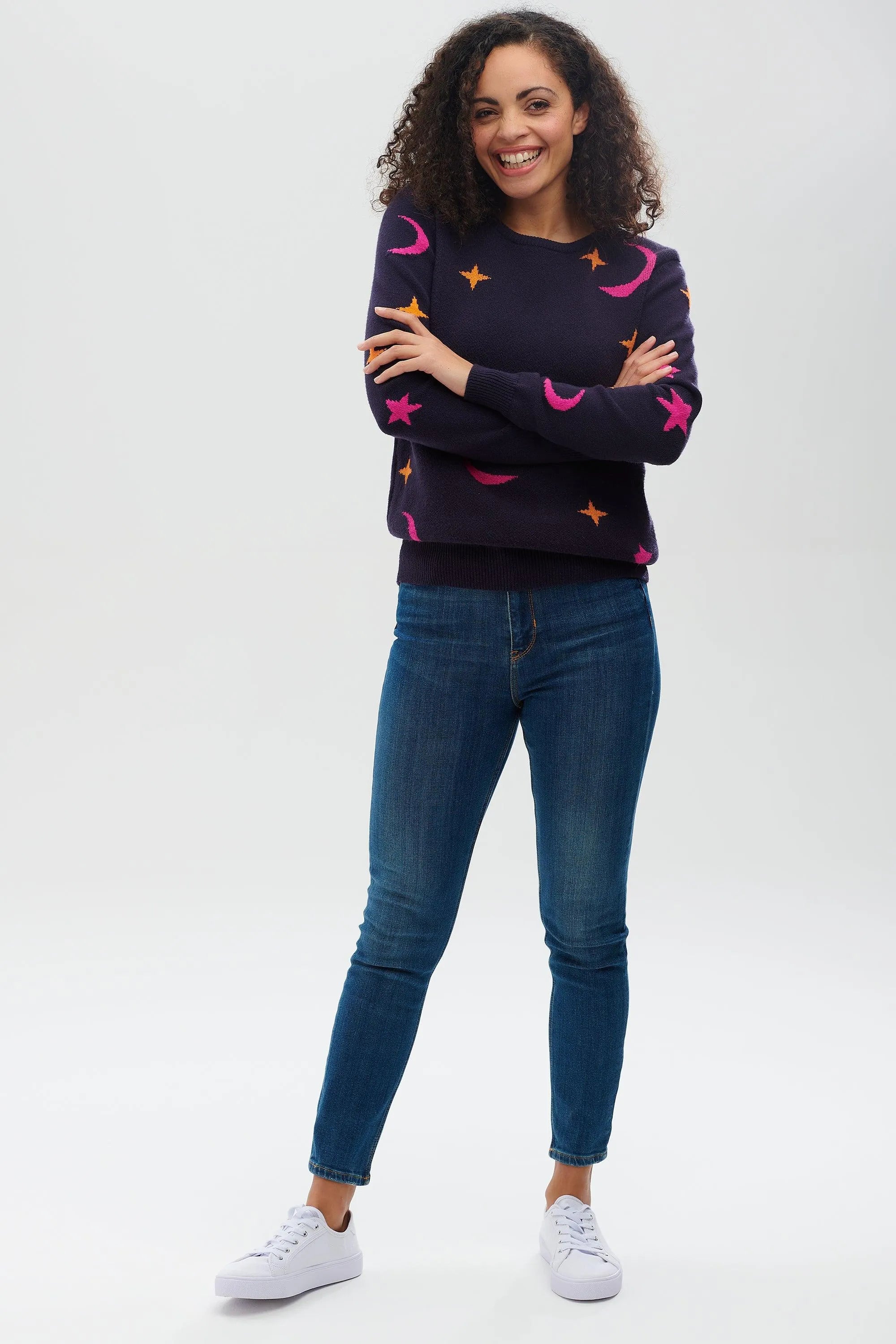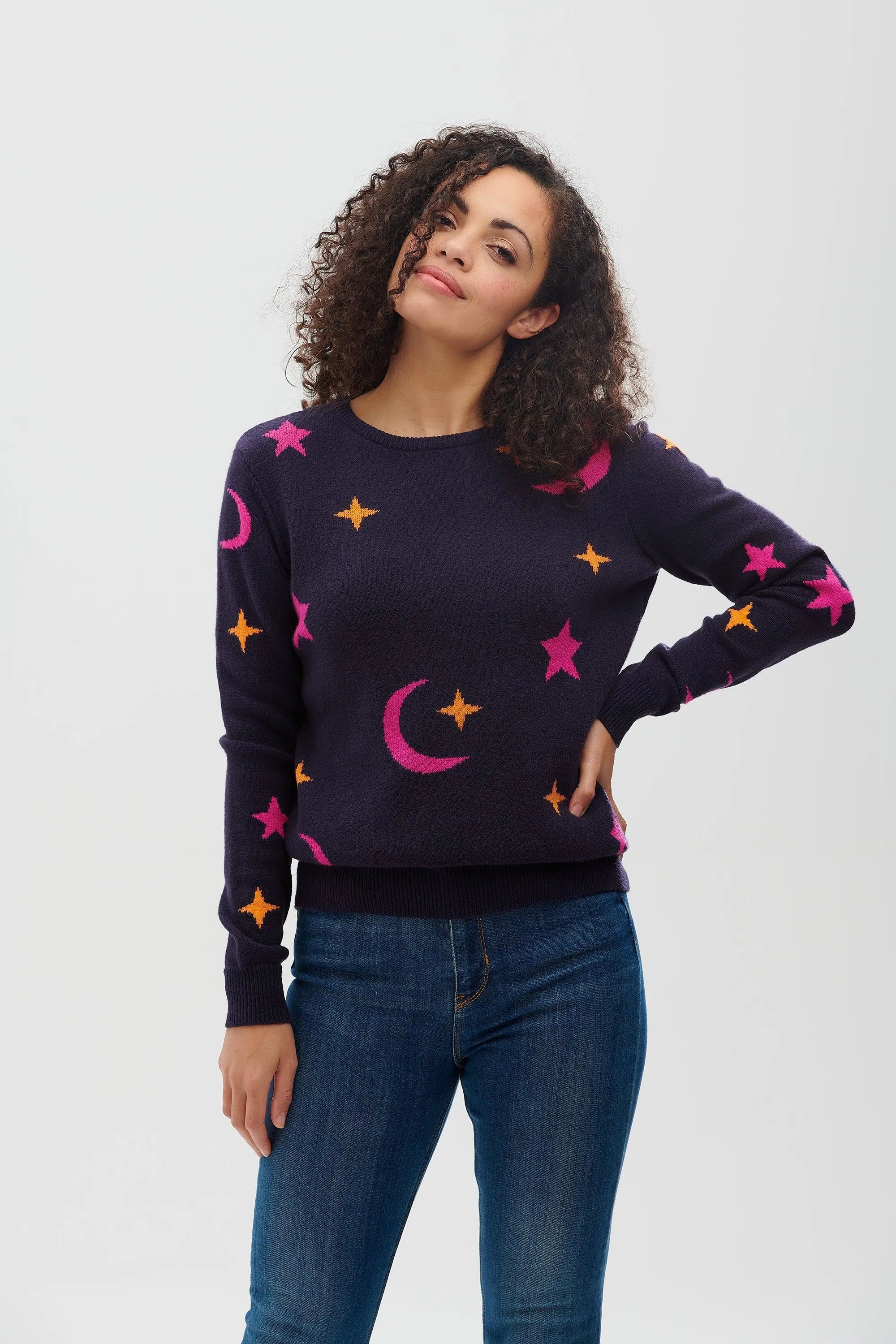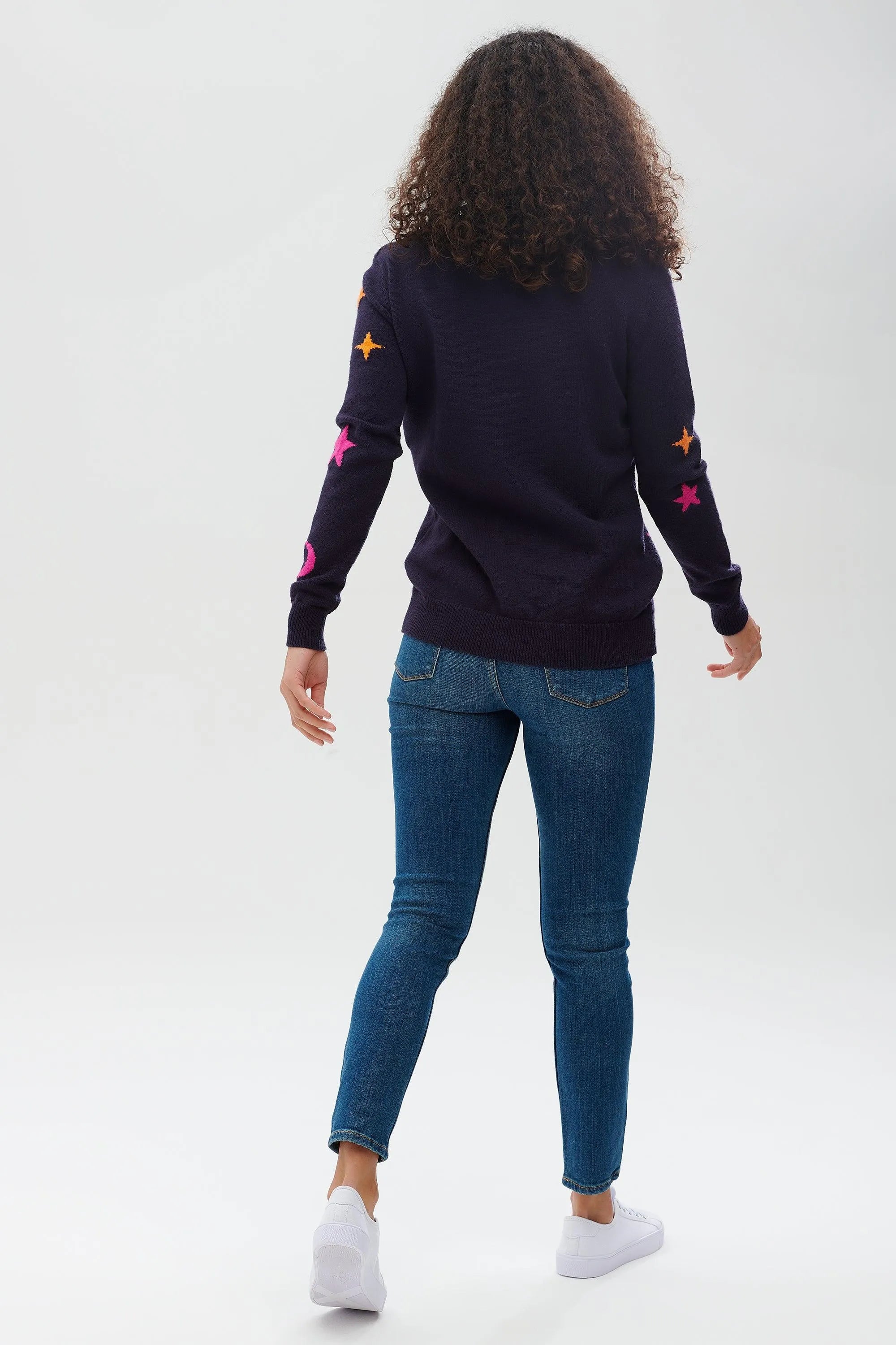 Wir lieben einen Throwback-Pullover und Staceys mehrfarbige Stern- und Mond-Intarsien in Magenta und Orange auf einem lockeren, grob gestrickten marineblauen Pullover ist die perfekte Kombination aus Komfort und Stil.