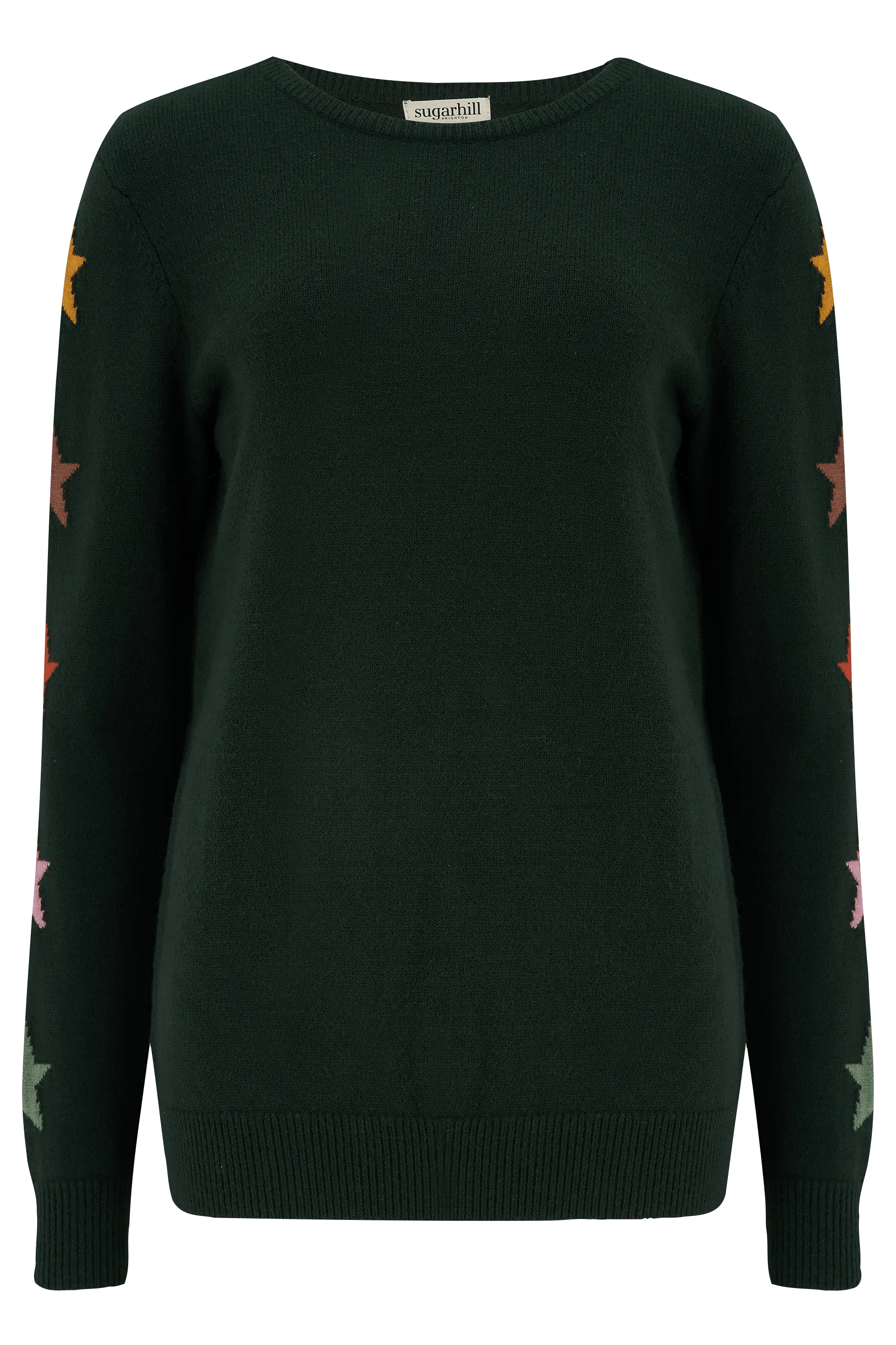 Ein schmal geschnittener Pullover mit Rundhalsausschnitt und vertikalen Sternen an jedem Arm. Wir lieben einen Throwback-Pullover, und Staceys herbstfarbene Stern-Intarsien auf einem lockeren, grob gestrickten dunkelgrünen Pullover sind die perfekte Mischung aus Komfort und Stil.