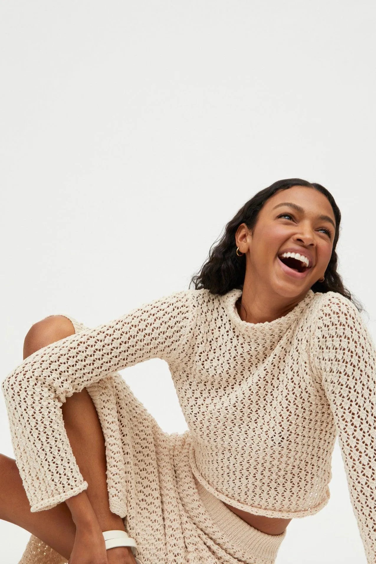 Beiges, durchbrochenes Strickoberteil. Mit hohem Ausschnitt und leicht ausgestellten langen Ärmeln. Das Model ist 174 cm groß und trägt Größe S.