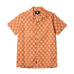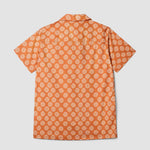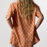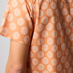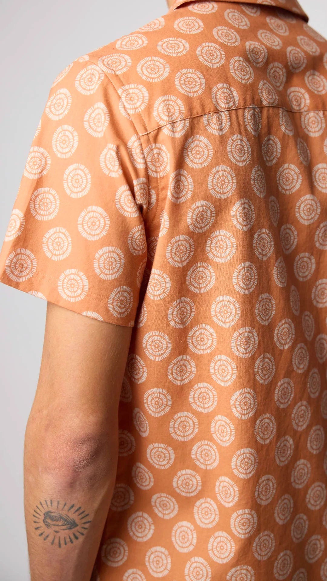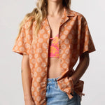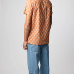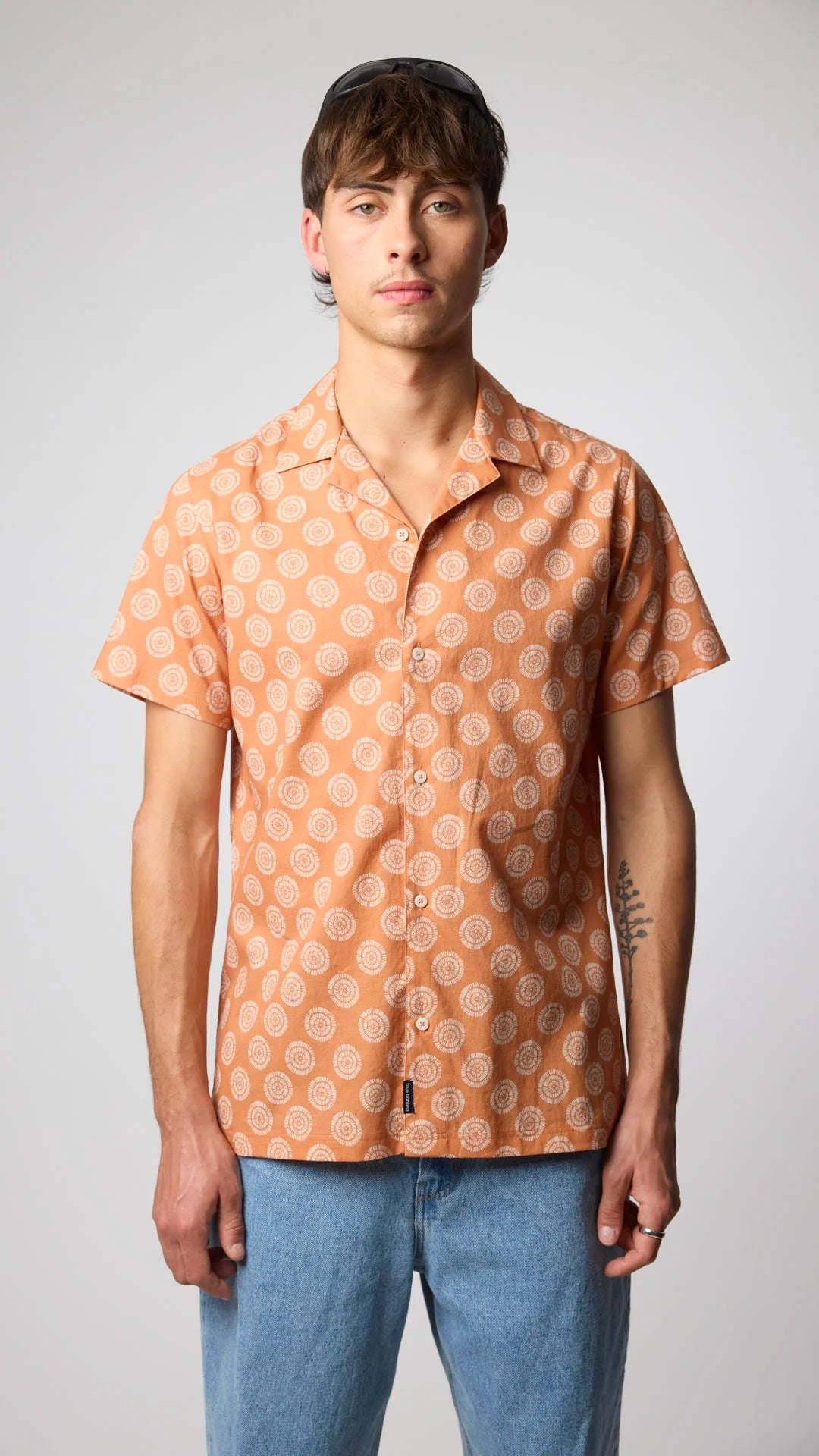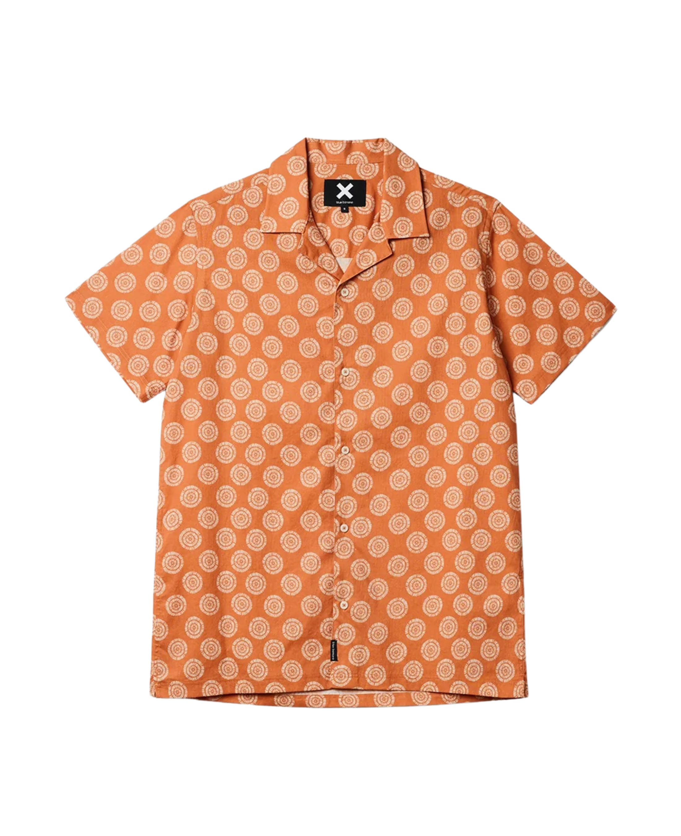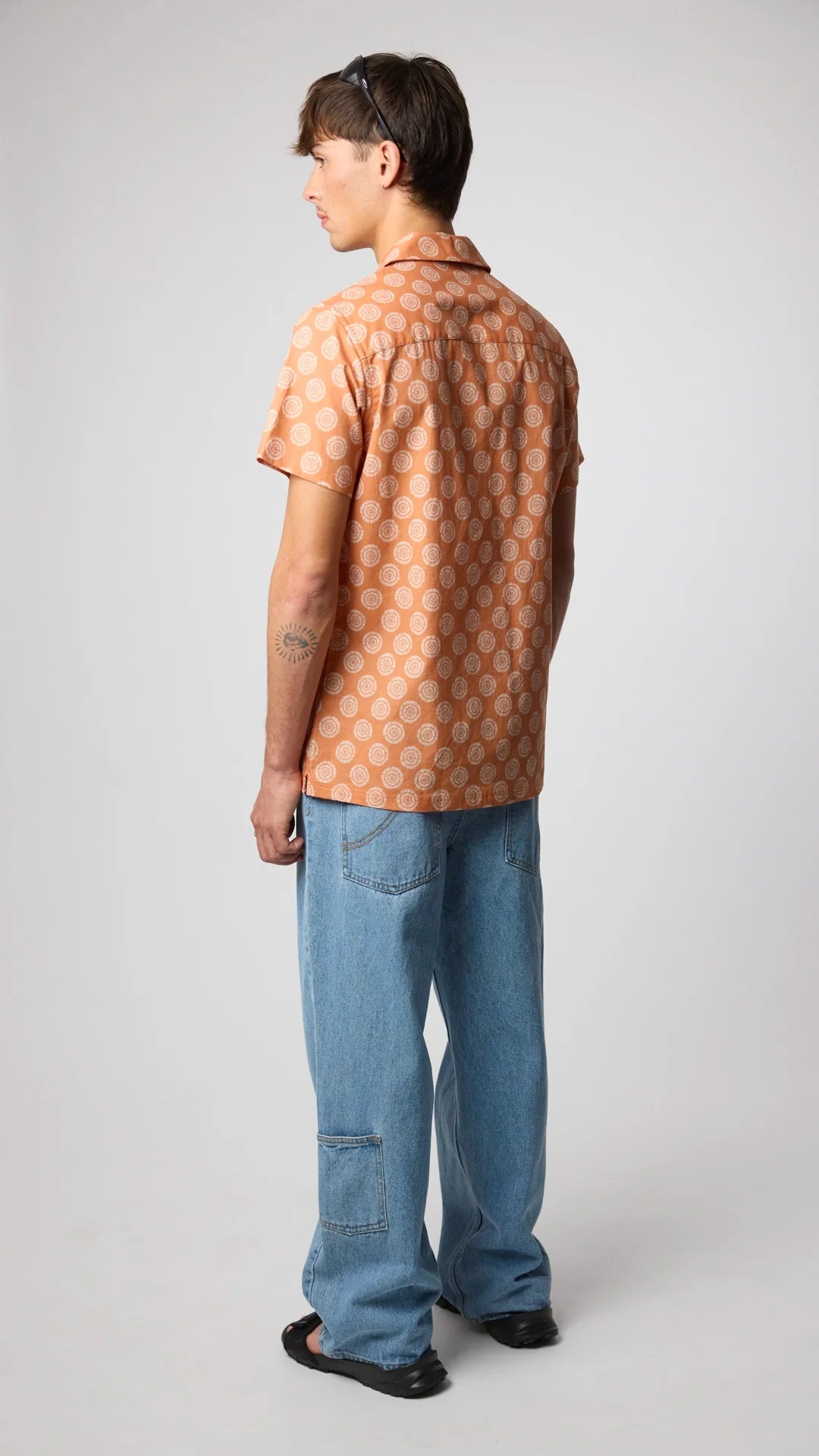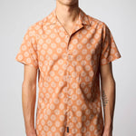 Bedrucktes Kurzarmhemd aus Leinen und Baumwolle. Camp-Kragen mit durchgehender Doppelnaht und gesticktem Etikett am Saum.