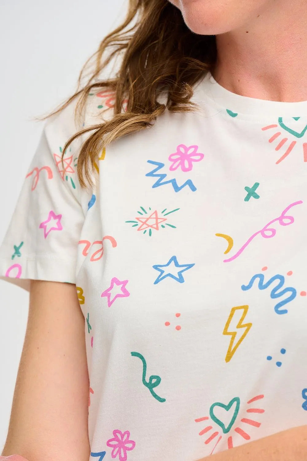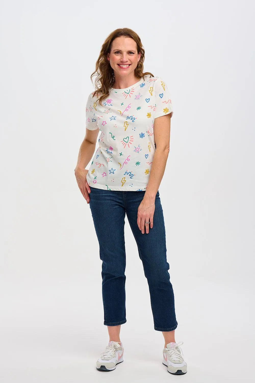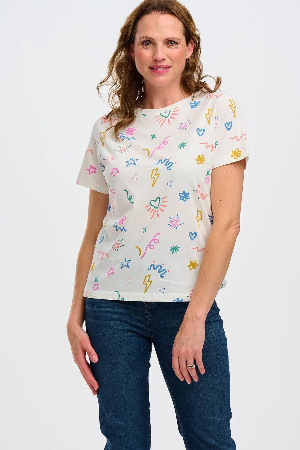 Ein fröhliches und leicht zu tragendes T-Shirt, bedruckt auf gebrochenem Weiß. Die Maggie hat gerade Seitennähte und einen geraden Rücken für eine klassische Passform. Wir lieben das Design, aber es ist die weiche Basis aus 100 % Bio-Baumwolle, die dieses T-Shirt zu etwas ganz Besonderem macht.