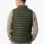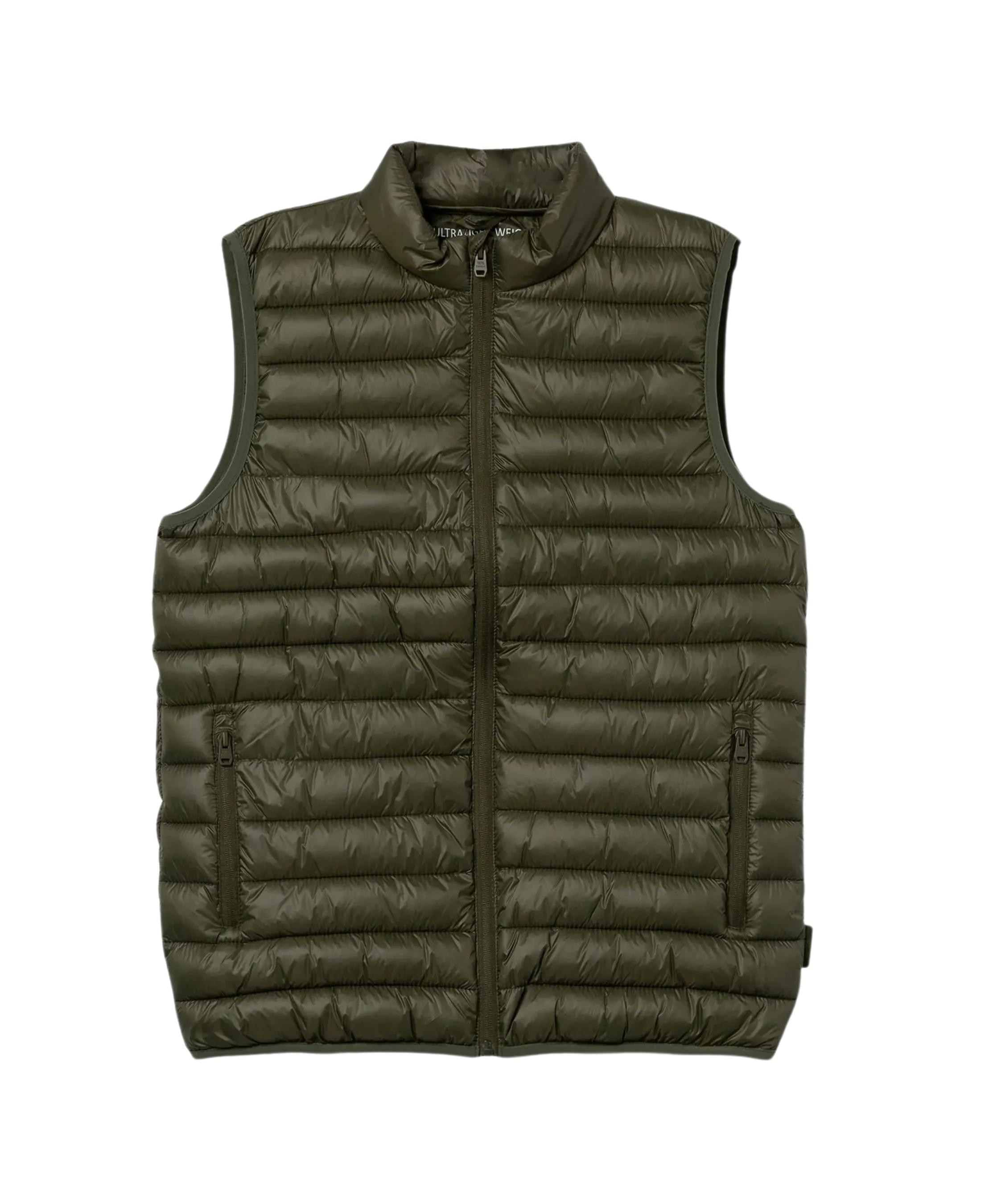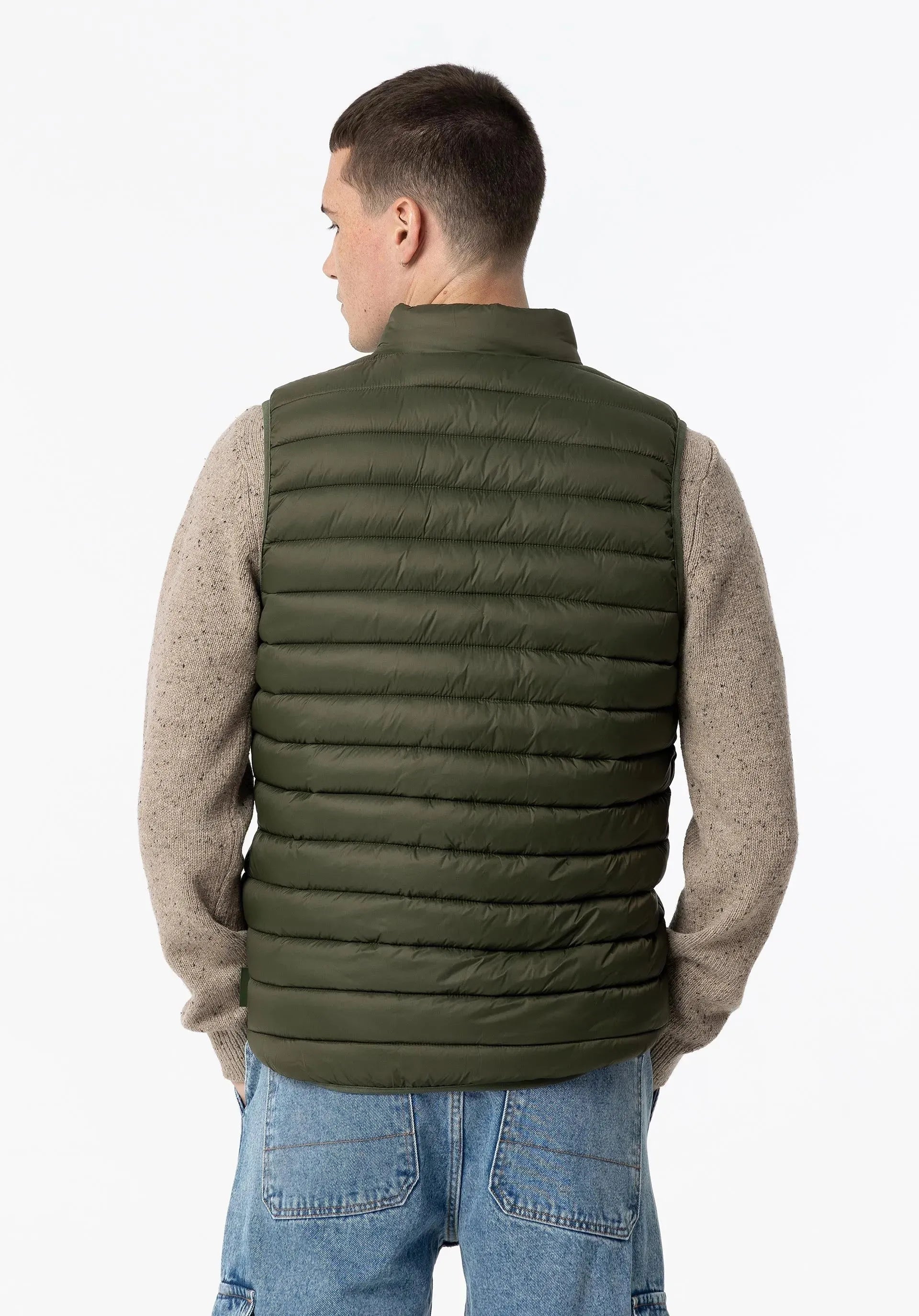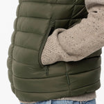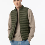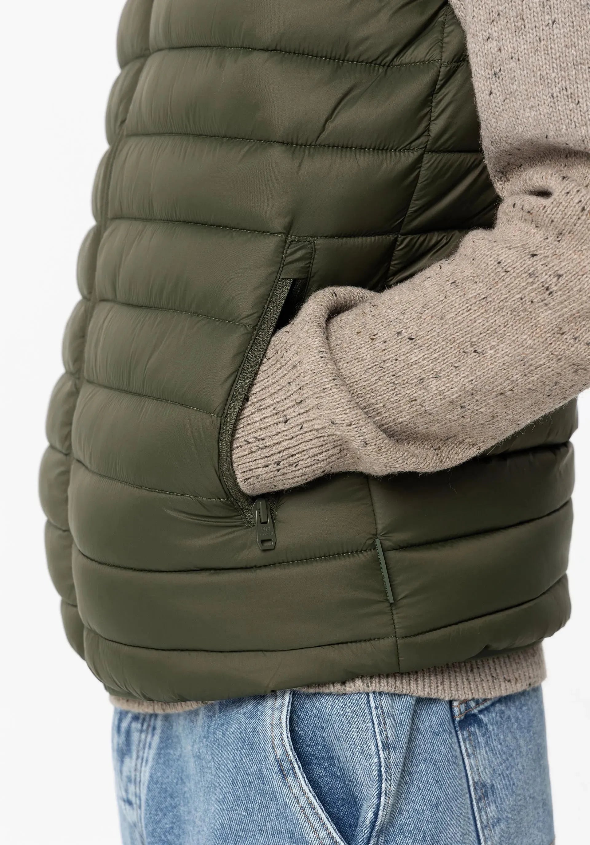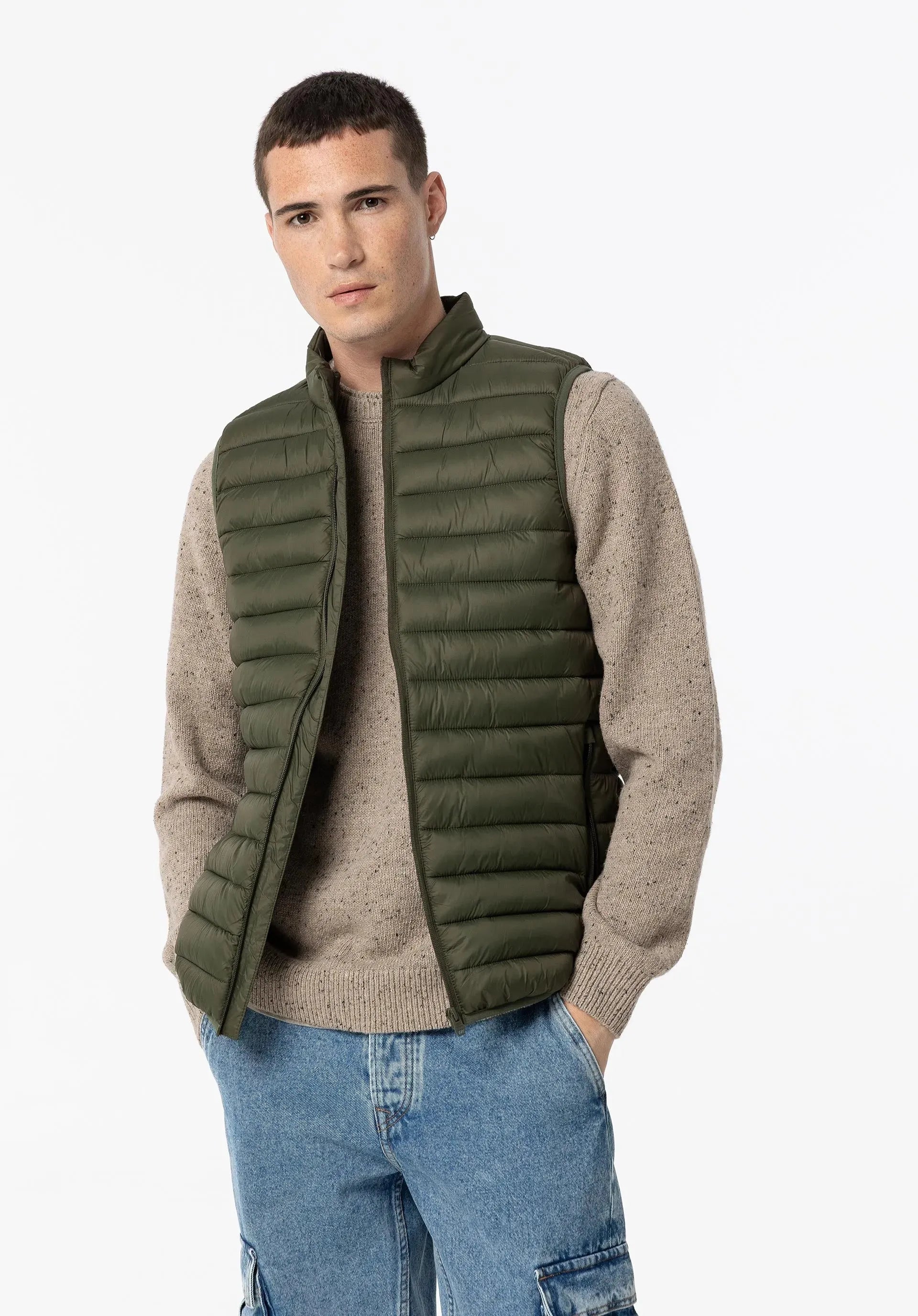 Weste mit Stehkragen und ärmellos. Reißverschluss vorne. Seitentaschen.