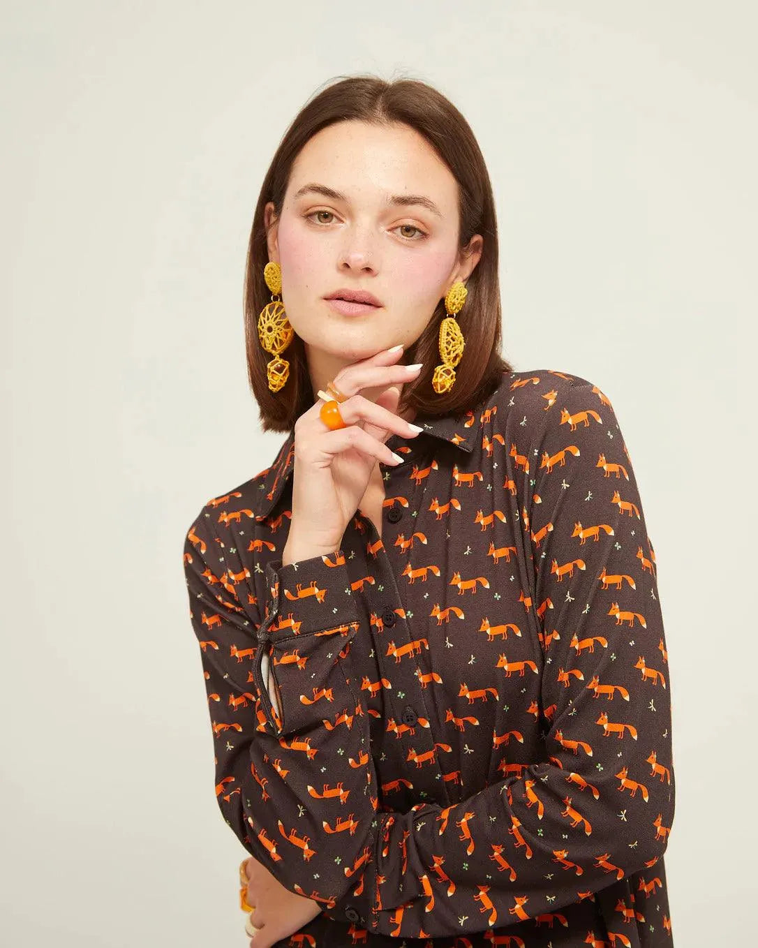 Midi-Hemdkleid mit Herbstprint. V-Ausschnitt und kurze Ärmel.