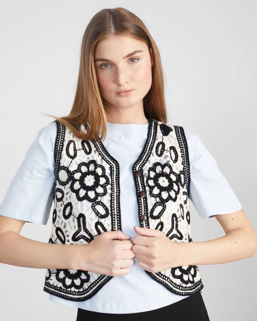 Verleihen Sie Ihrem Look mit der schwarz-weiß bedruckten Weste von 24colours einen Hauch von Stil. Hergestellt aus hochwertigen Materialien ist diese Weste nicht nur stylisch, sondern auch bequem. Perfekt für jeden Look – ergänzen Sie Ihre Garderobe noch heute!
