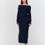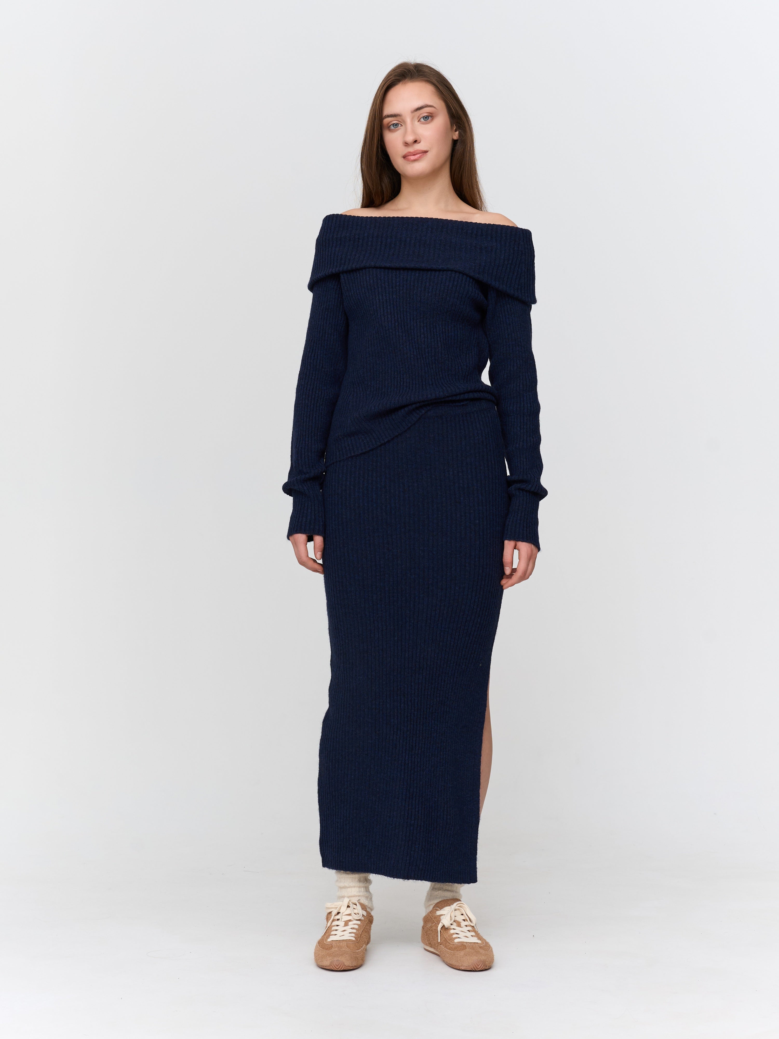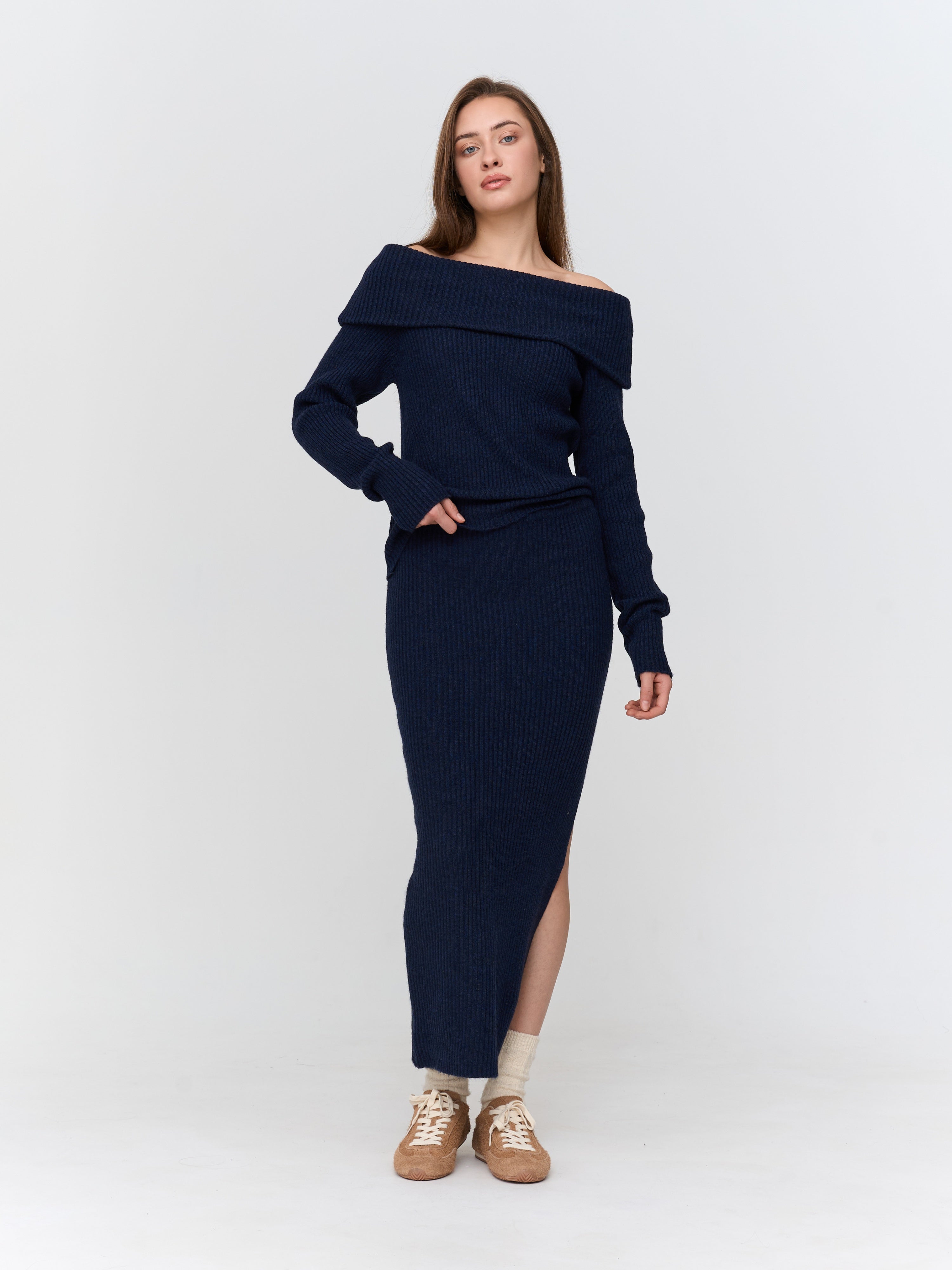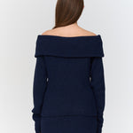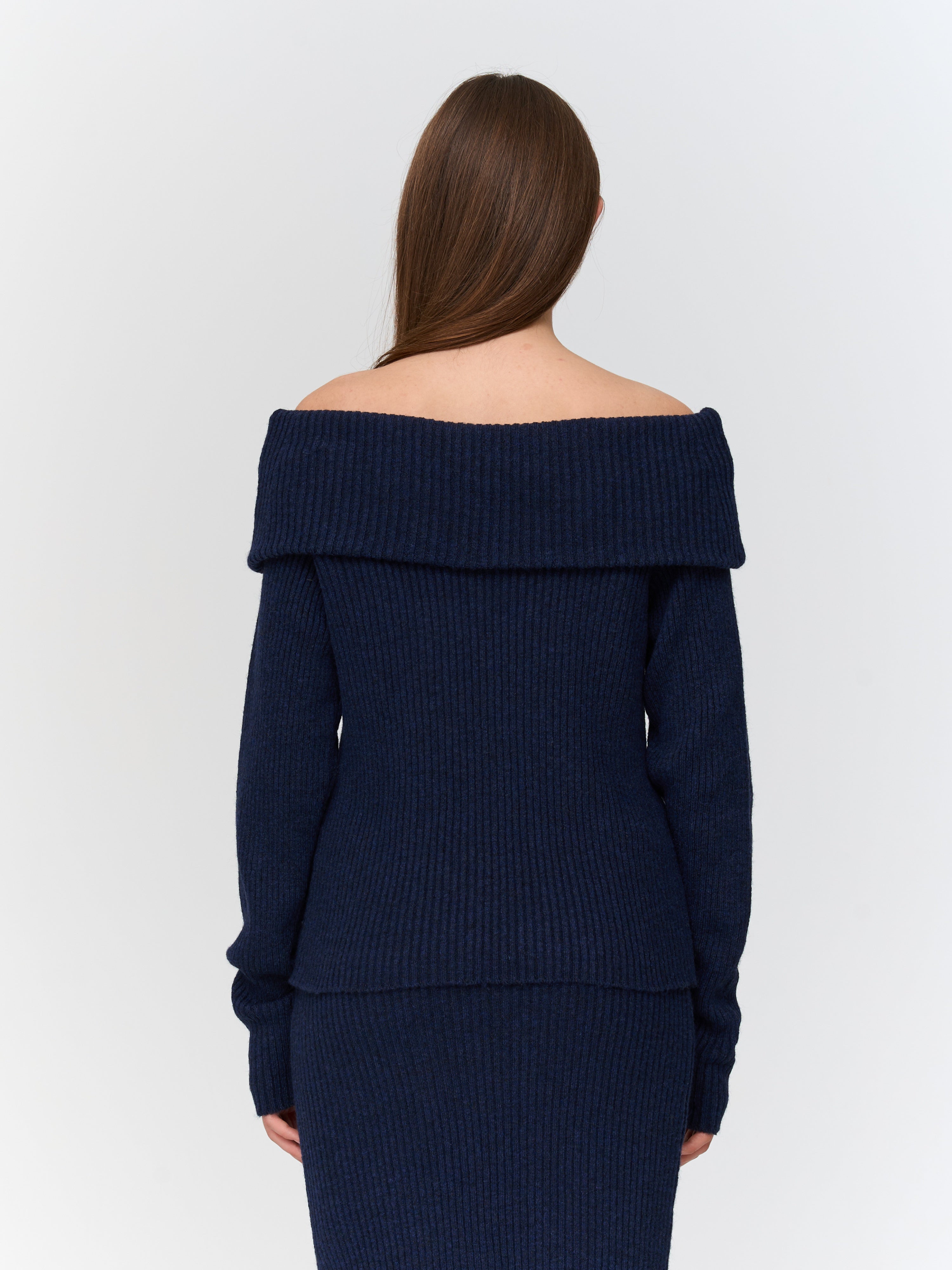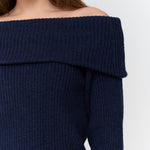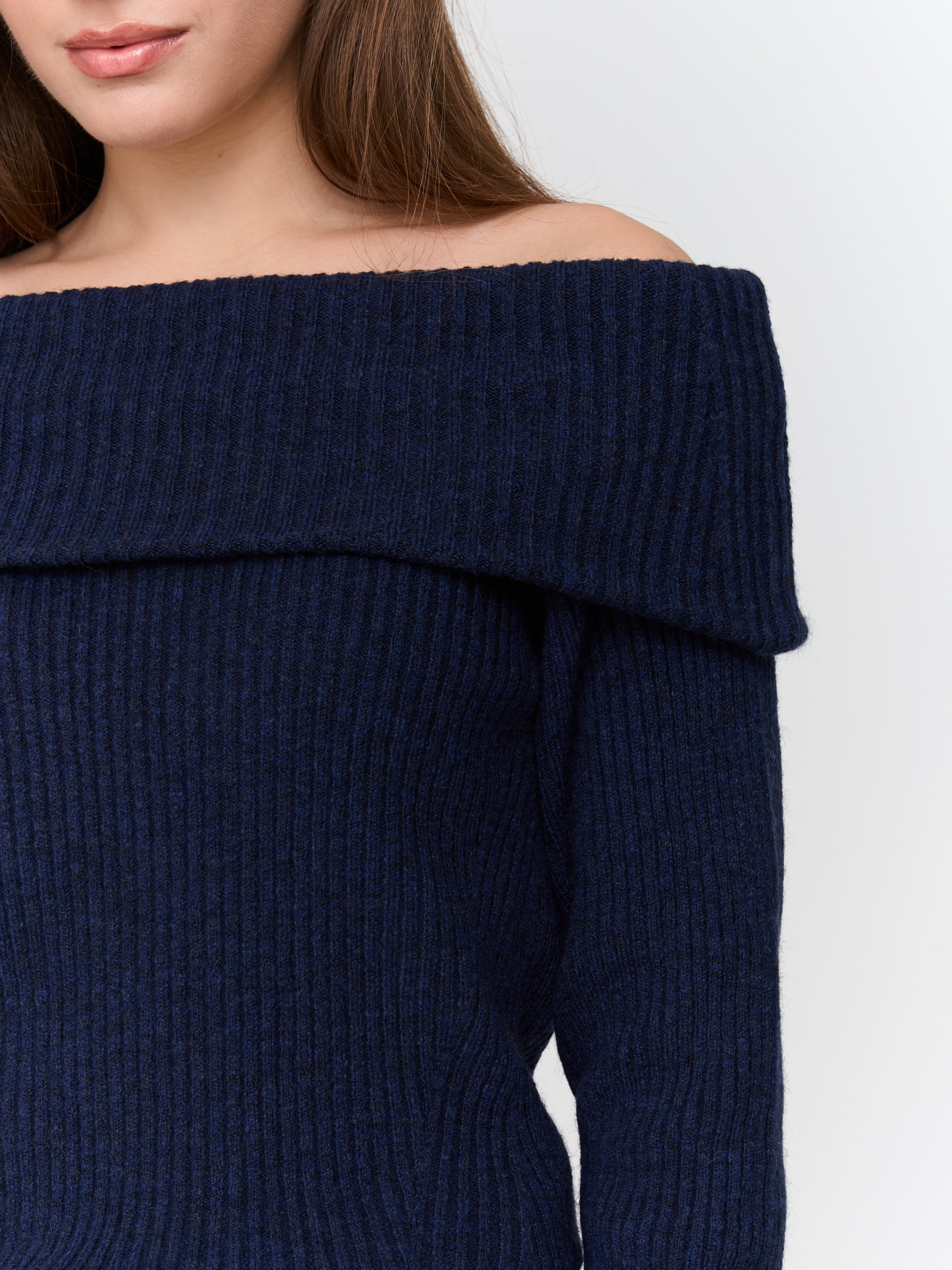 Este jersey azul marino de 24colours combina elegancia y comodidad en una sola prenda. Confeccionado en un punto acanalado suave y elástico, destaca por su diseño con escote bardot y hombros descubiertos, un detalle femenino y sofisticado perfecto para looks de día o de noche.