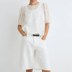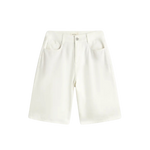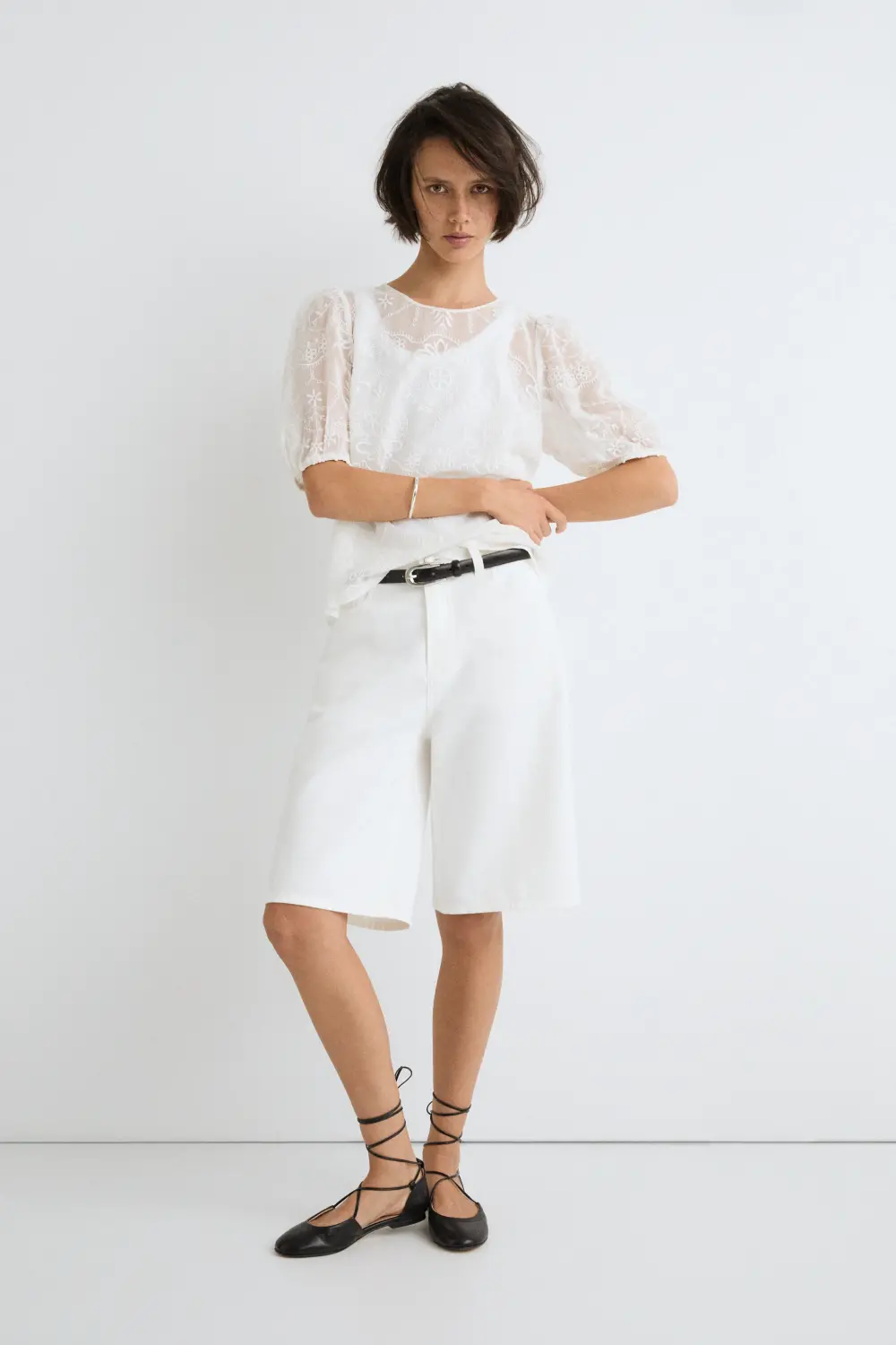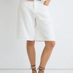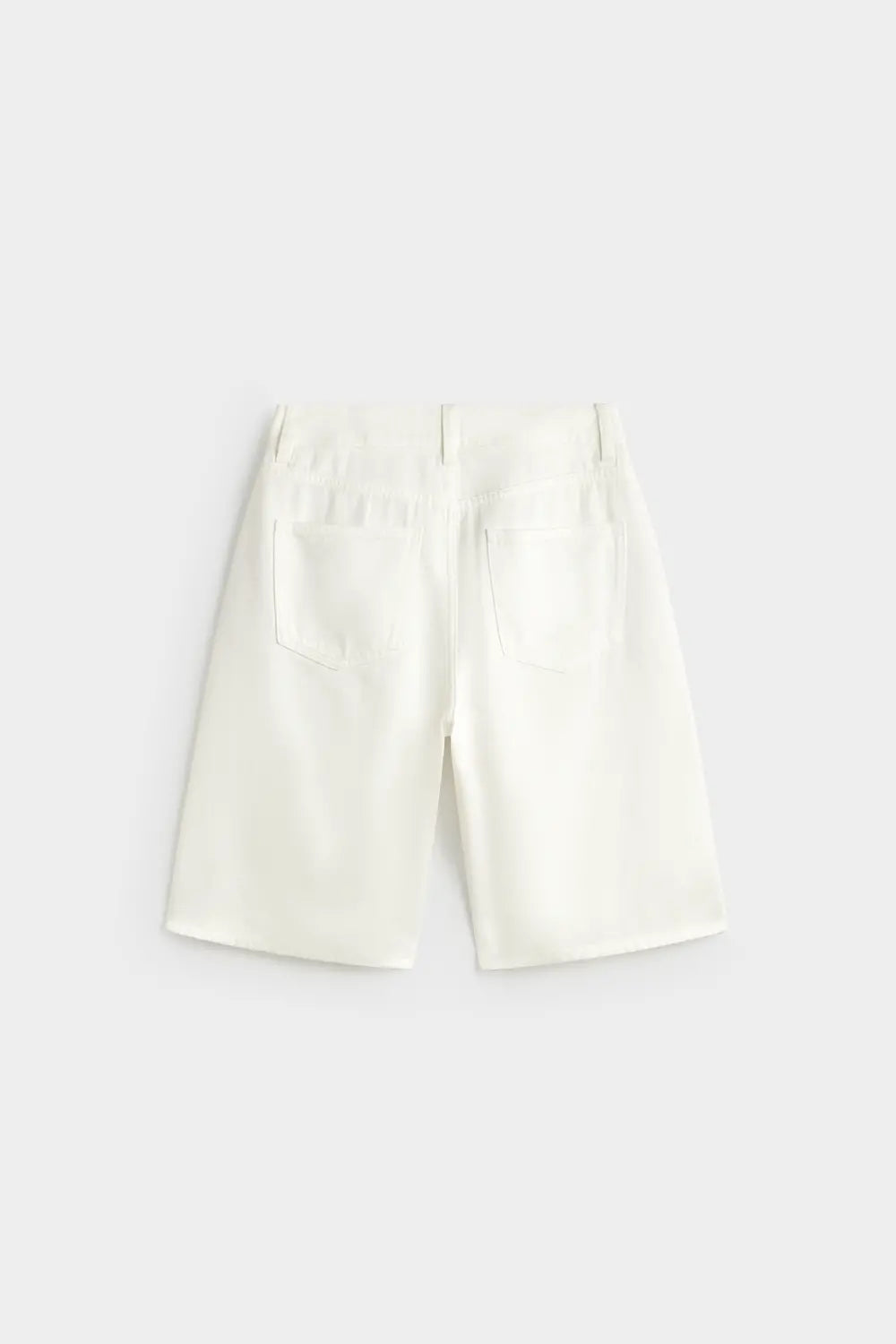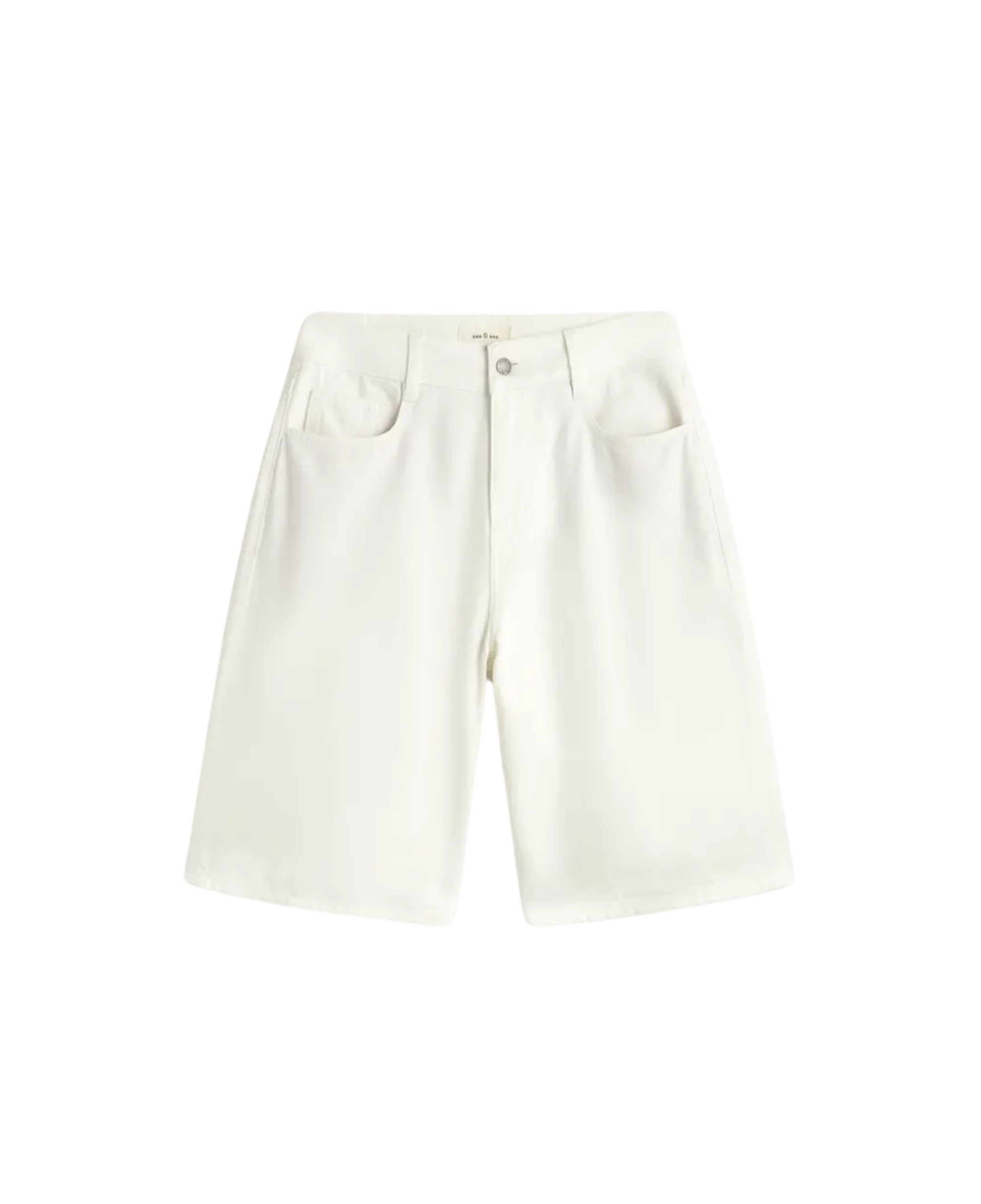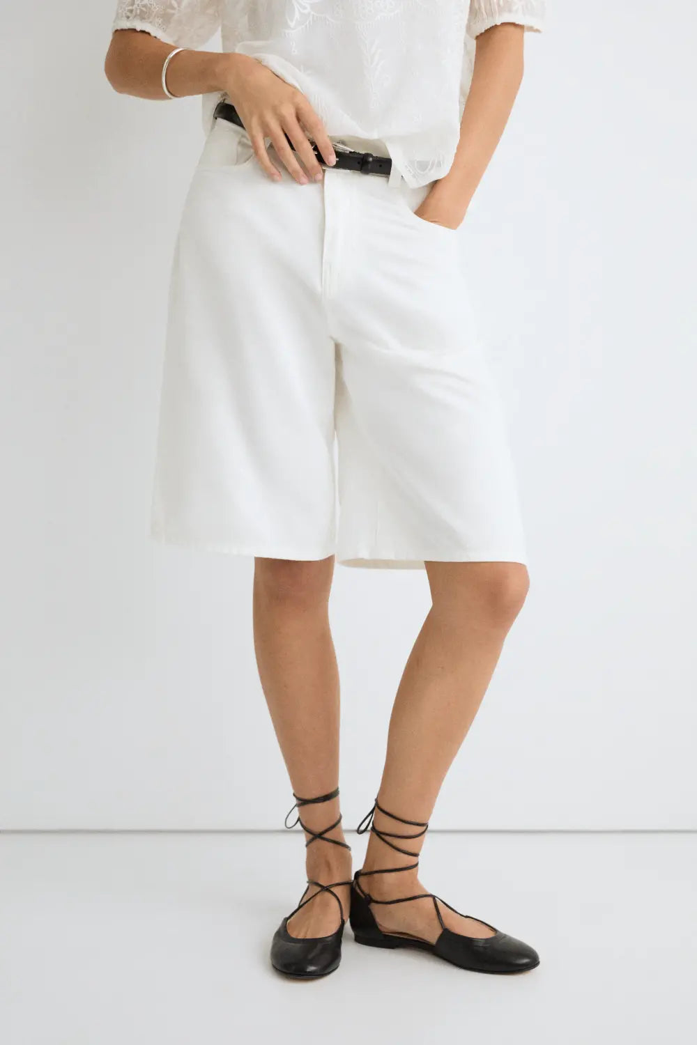 Lange, fließende Jeans-Bermudashorts in Weiß. 100 % Baumwollmischung. Hohe Leibhöhe. 5-Pocket-Design. Gürtelschlaufen. Knopf- und Reißverschluss. Leicht lockere Passform. Länge bei Größe S: 55,5 cm.