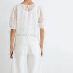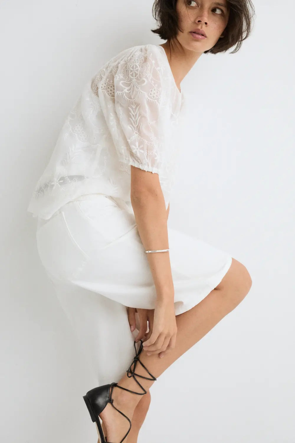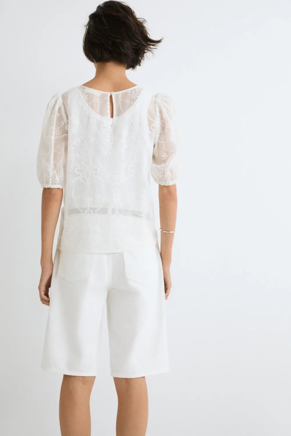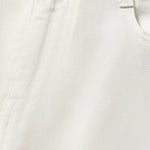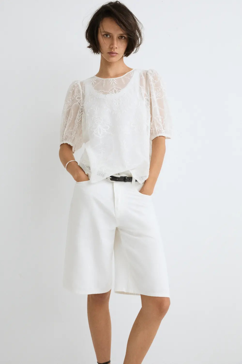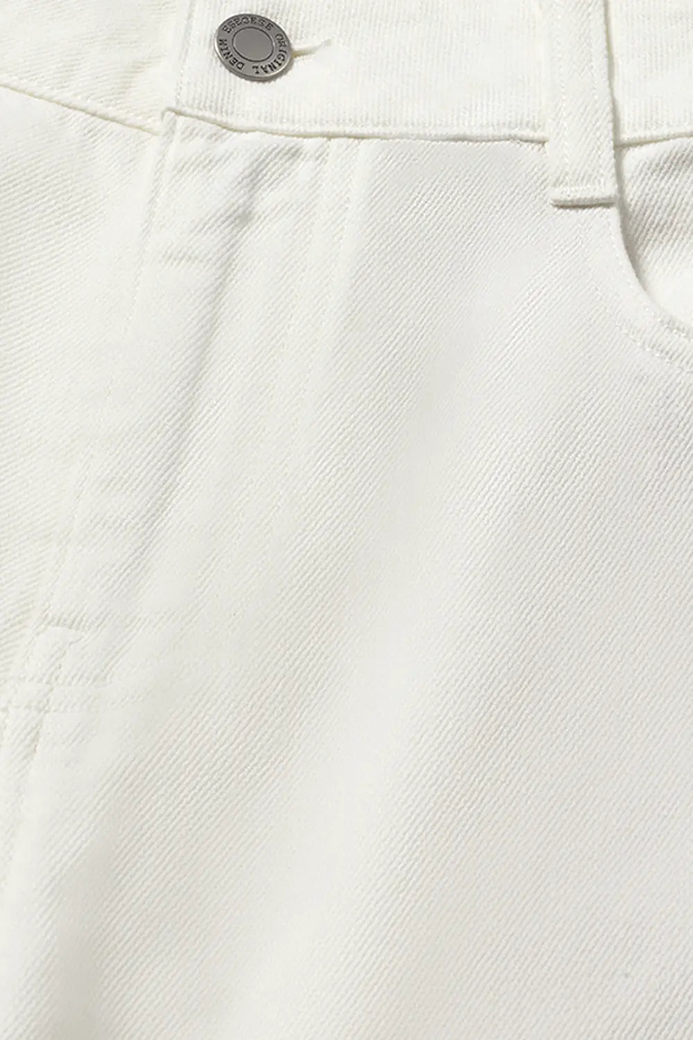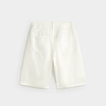 Lange, fließende Jeans-Bermudashorts in Weiß. 100 % Baumwollmischung. Hohe Leibhöhe. 5-Pocket-Design. Gürtelschlaufen. Knopf- und Reißverschluss. Leicht lockere Passform. Länge bei Größe S: 55,5 cm.