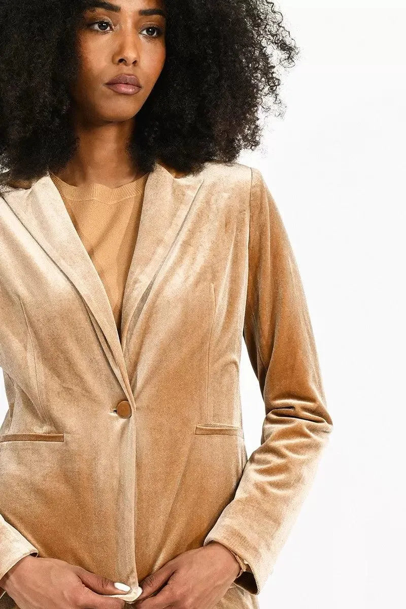 Langärmliger Blazer mit Kragen und Revers. Modell aus Samtstoff, Vordertaschen und Knopfverschluss.