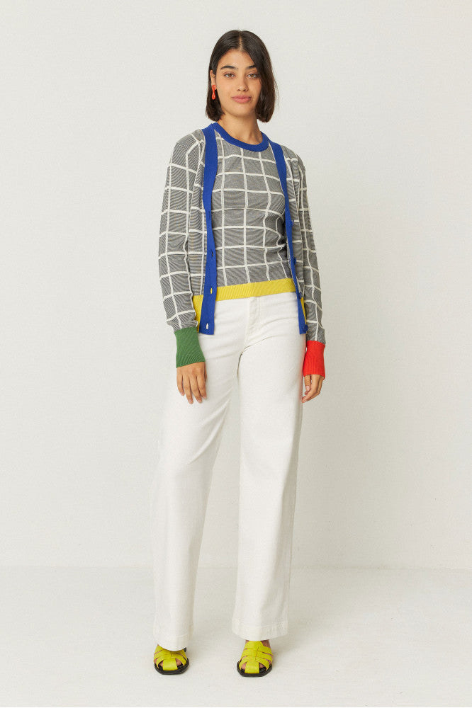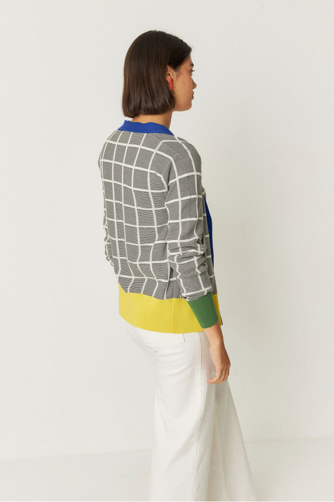 Strickjacke mit V-Ausschnitt und Knopfverschluss, verziert mit Rippstrickbesatz an Hals, Bündchen und Taille.