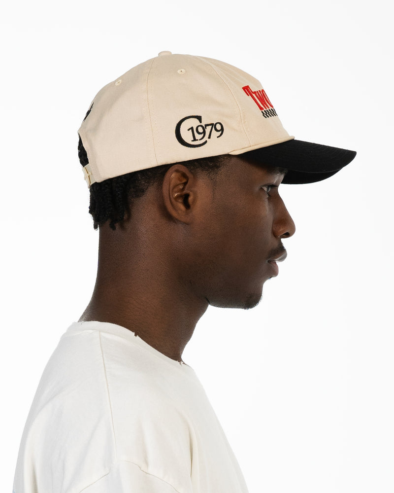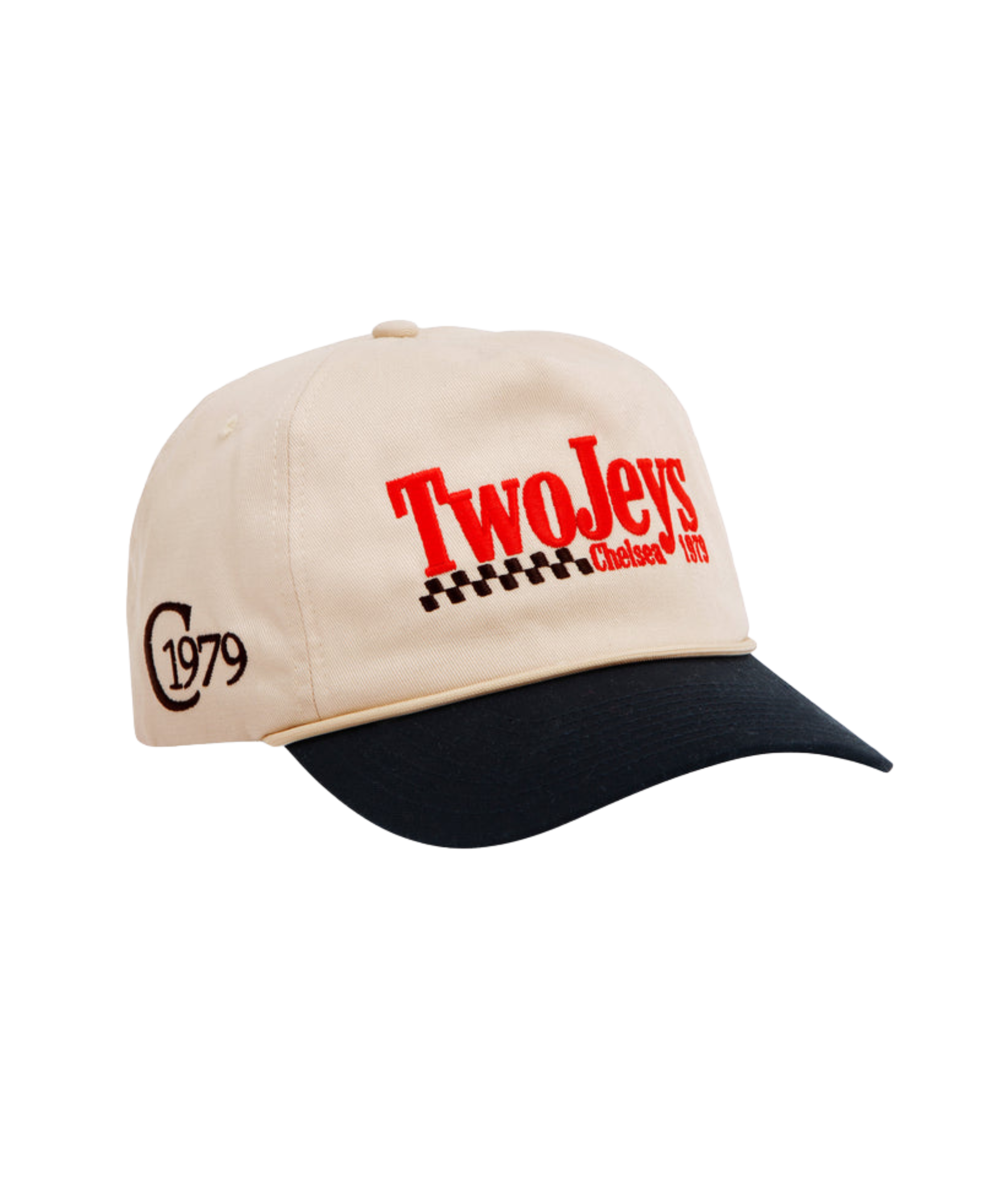 Die Checkered Cream-Kappe, die in Zusammenarbeit mit Chelsea 1979 entstand, ist eine neue klassische Sonderform von TwoJeys. Sie verfügt über ein individuell gesticktes Design auf der Vorderseite und einen verstellbaren Riemen.