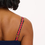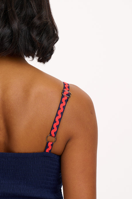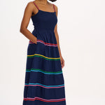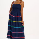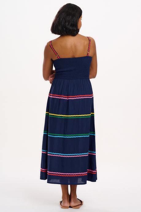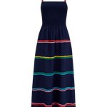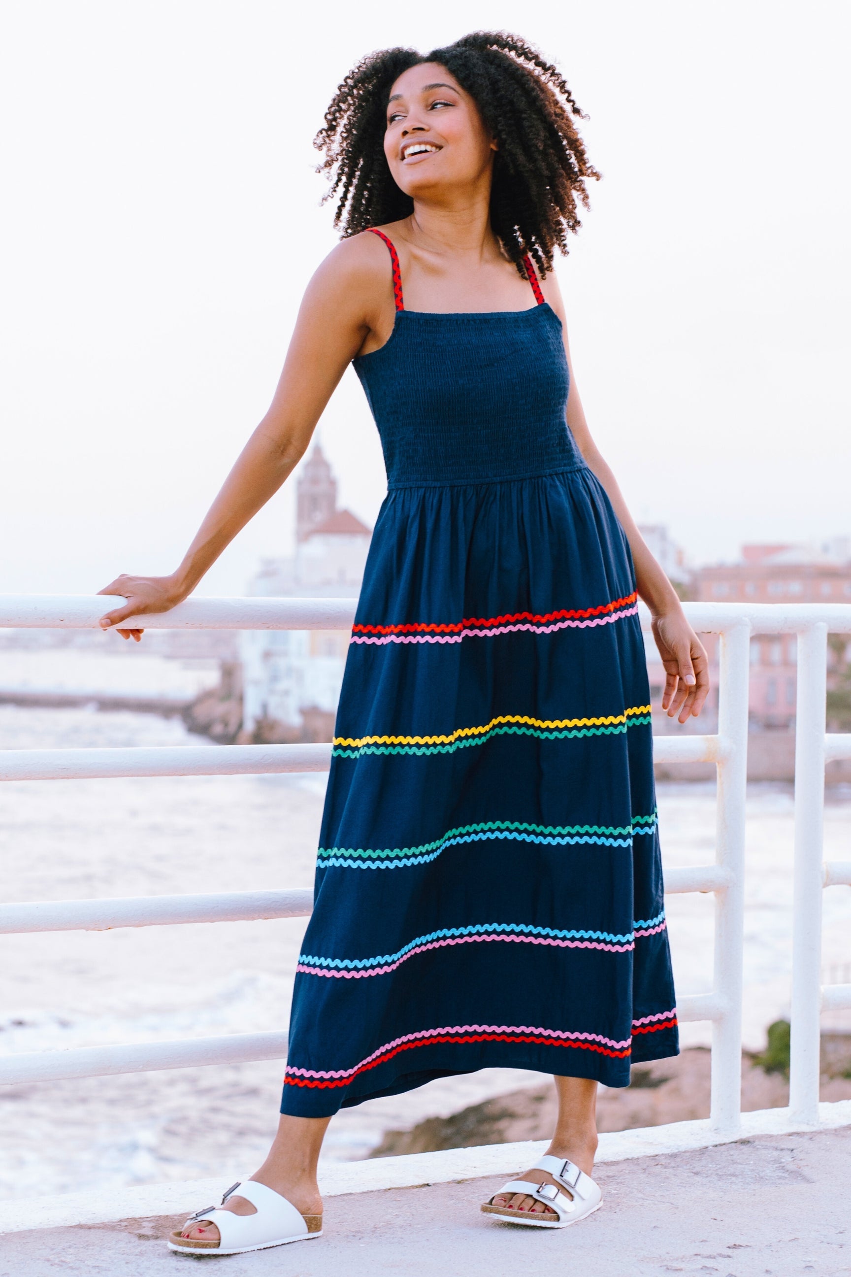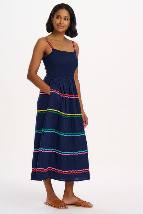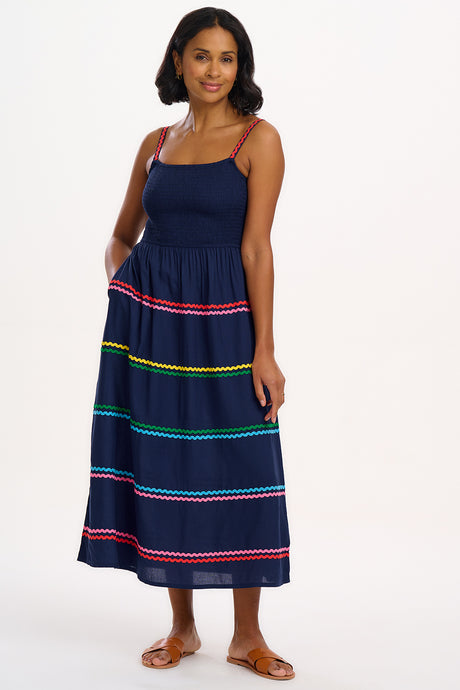 Ein bezauberndes Sommerkleid in Midilänge mit zart gerafftem Oberteil und verstellbaren Trägern, ergänzt durch einen weiten, fließenden Rock. Saum und Träger sind mit regenbogenfarbenen Zickzackbändern verziert.