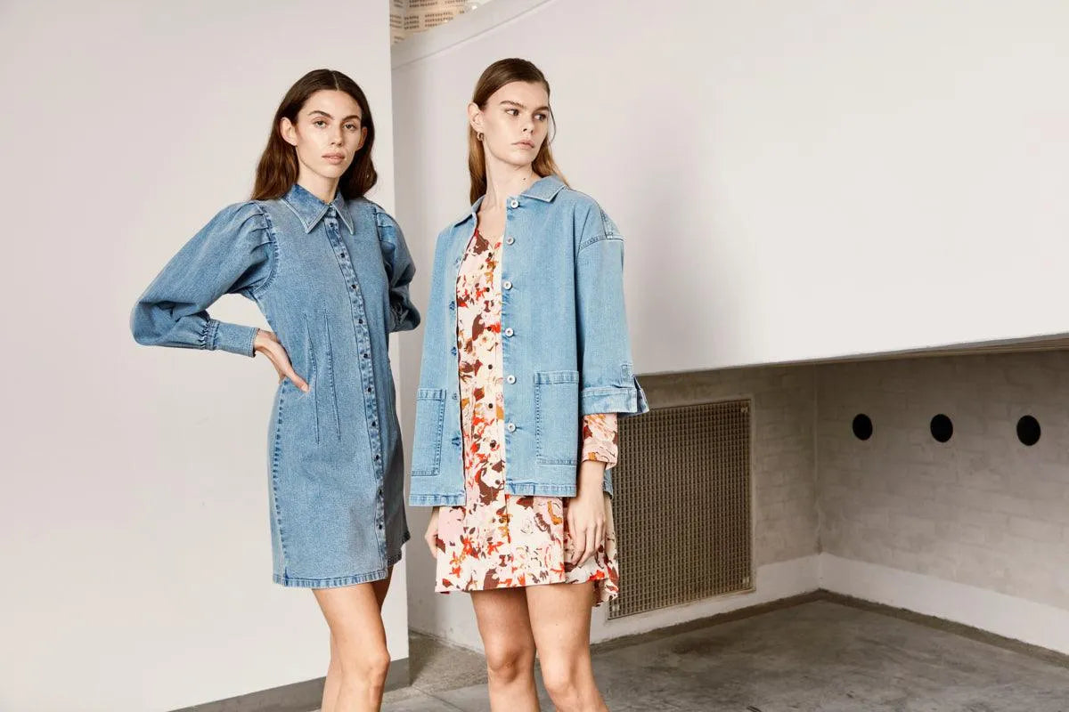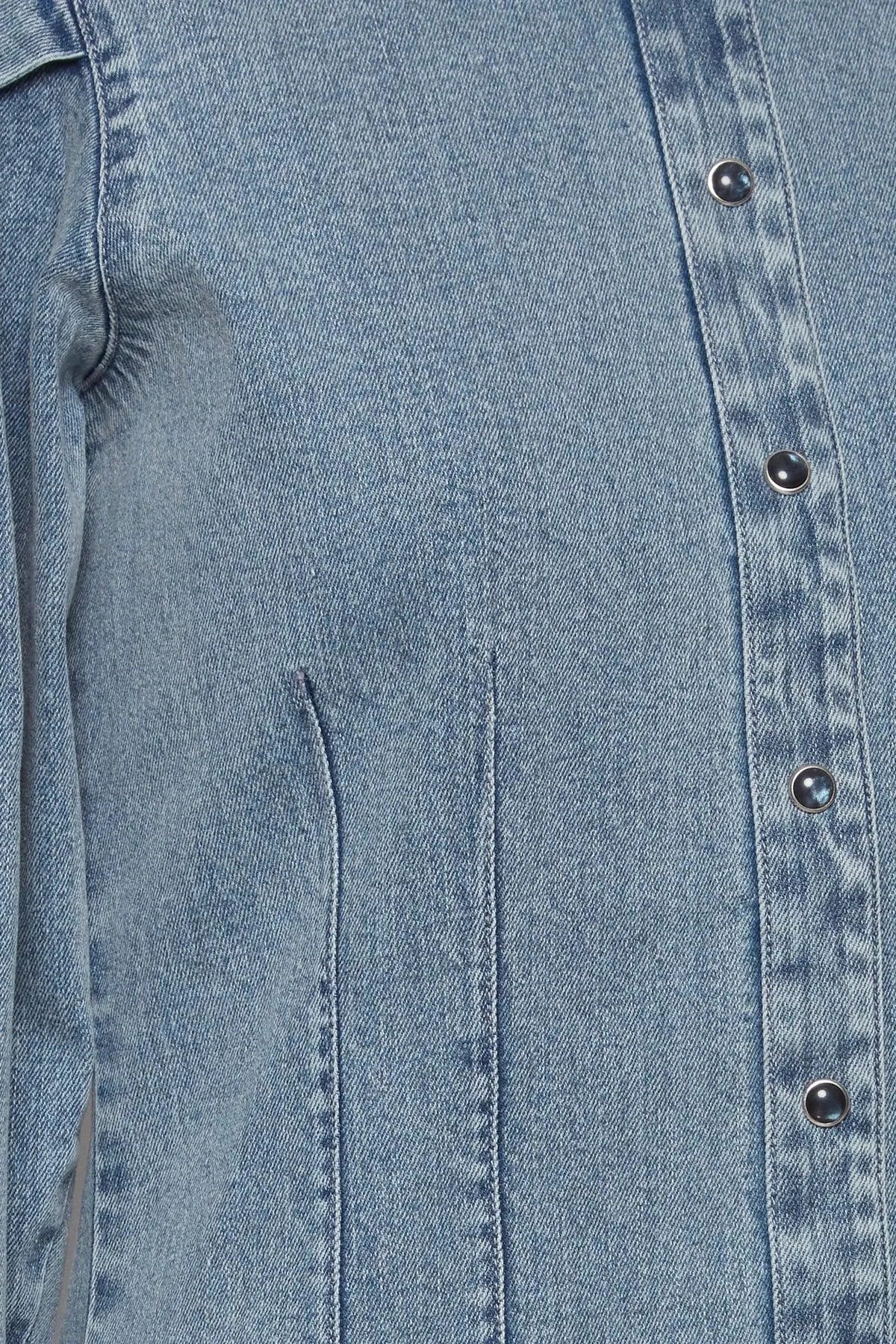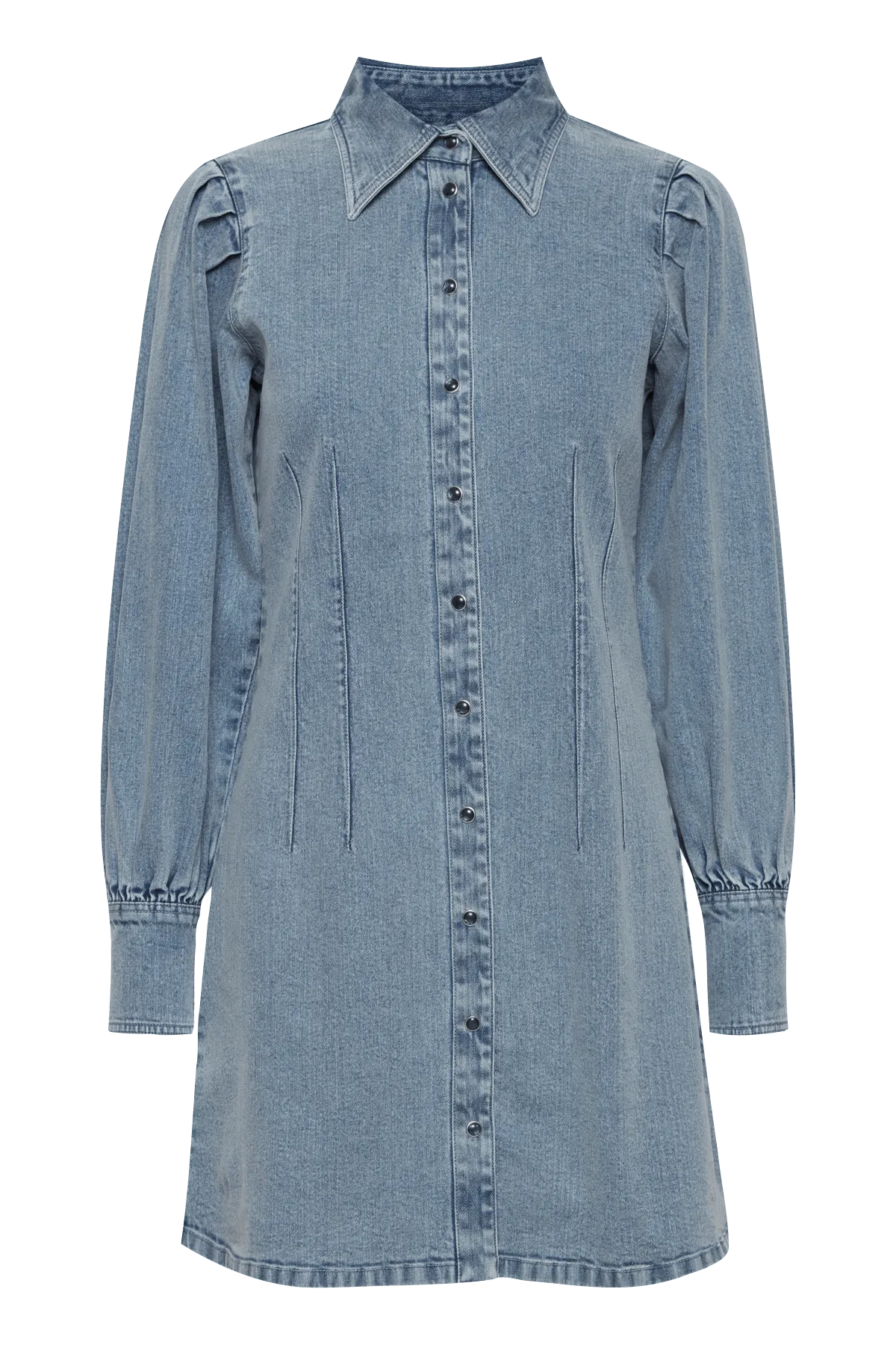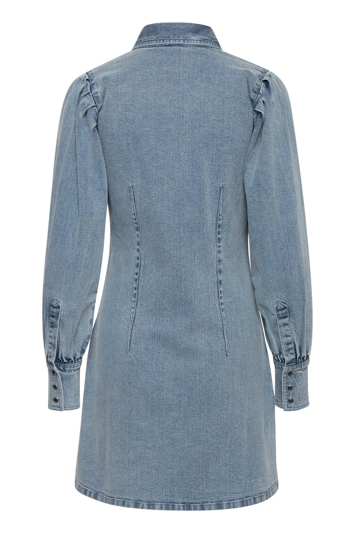 Langärmeliges Jeanskleid mit Druckknöpfen und Puffärmeln.
