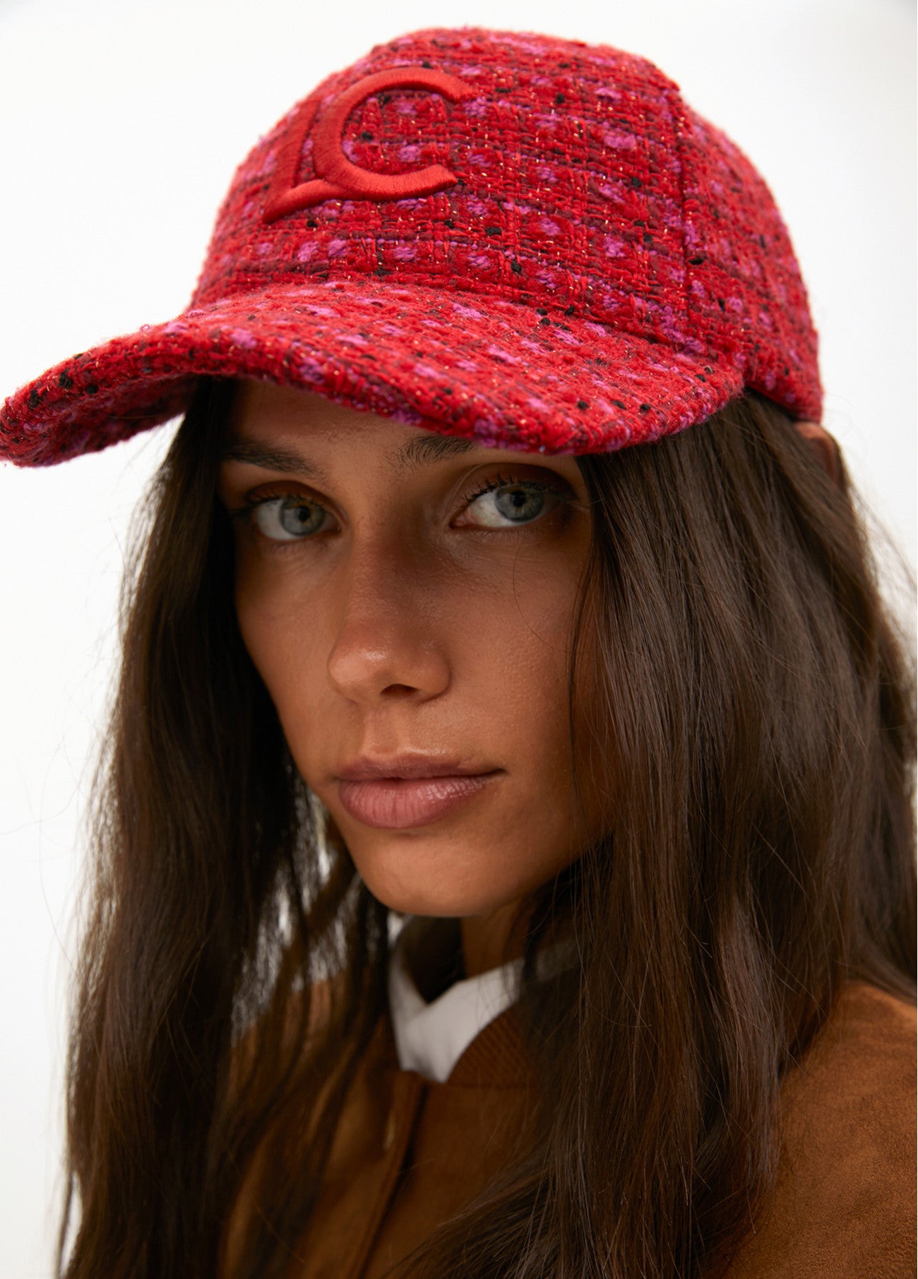 Visera en tejido tweed rojo con un diseño exclusivo que incorpora el logotipo bordado en el frontal. Ajuste regulable para mayor comodidad. Perfecta para dar un toque chic a tu estilo casual.
