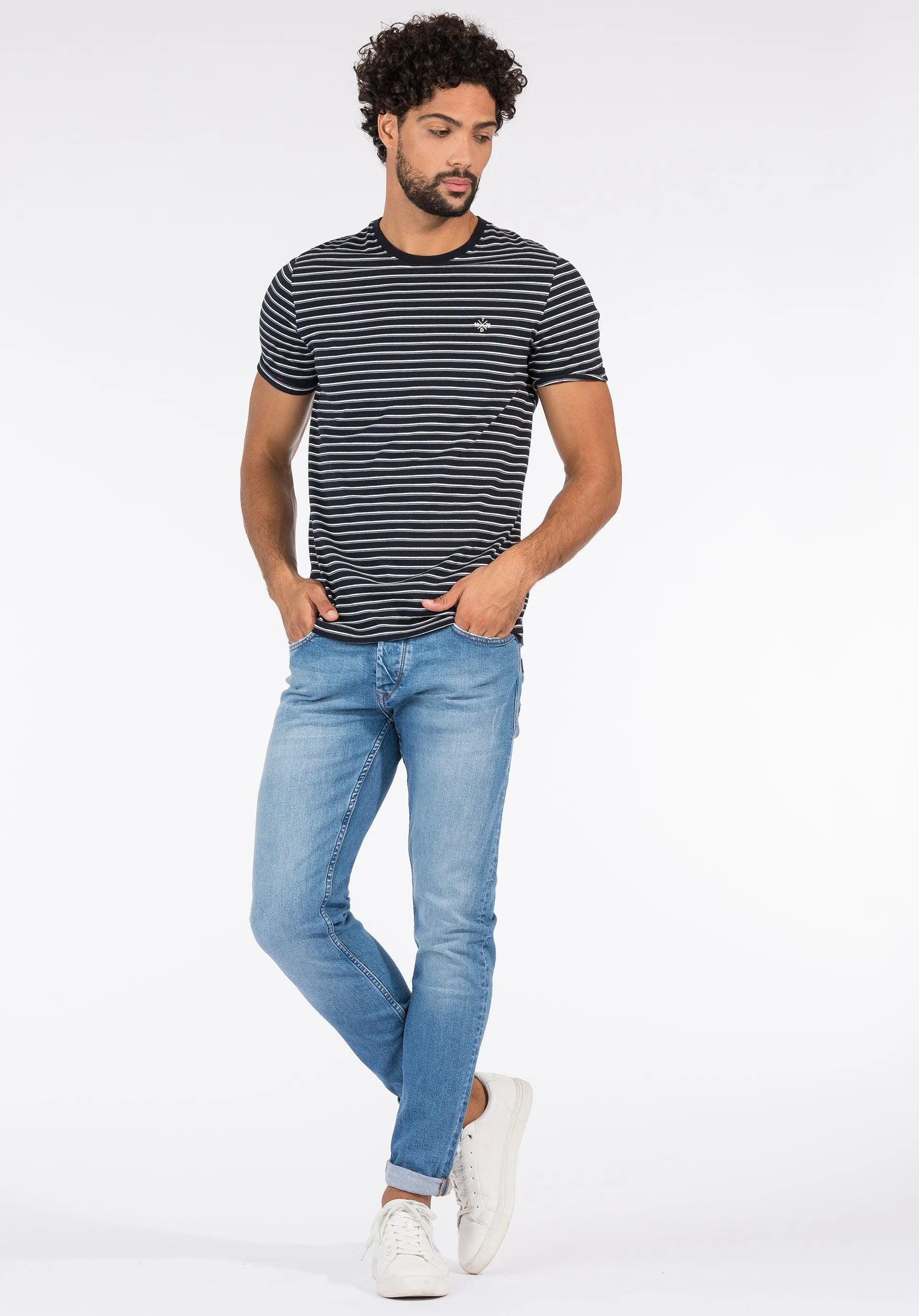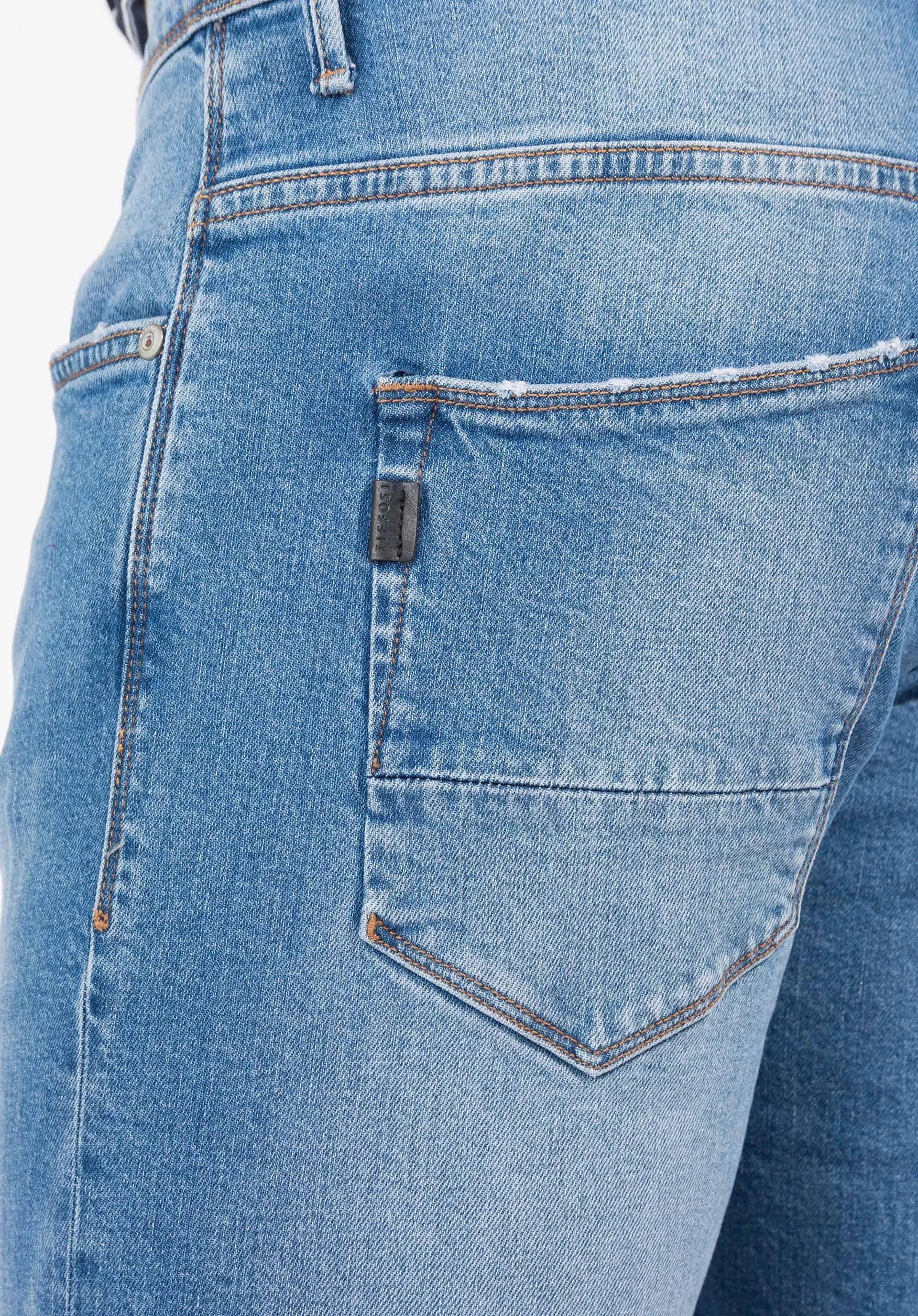 Gerade geschnittene Jeans bis zum Knie, von dort verjüngen sie sich zum Knöchel