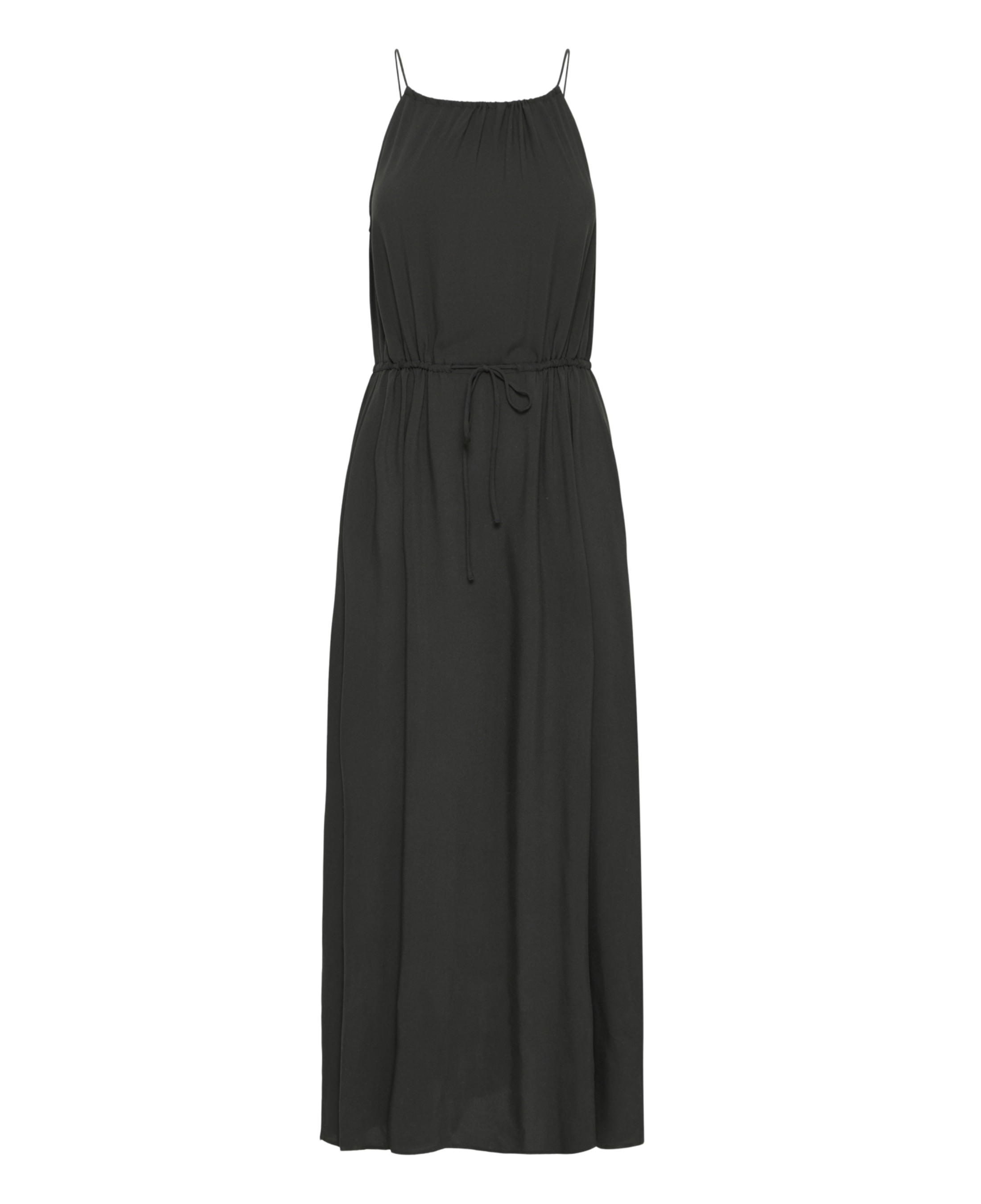 Vestido largo con lazo ajustable en la cintura, corte holgado y delicados tirantes finos. Presenta un escote alto y una silueta larga que aporta comodidad y estilo en cualquier ocasión. Ideal tanto para ocasiones informales como formales.