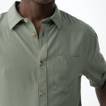Es una camisa de hombre de manga corta, pensada para un uso casual y de temporada cálida.