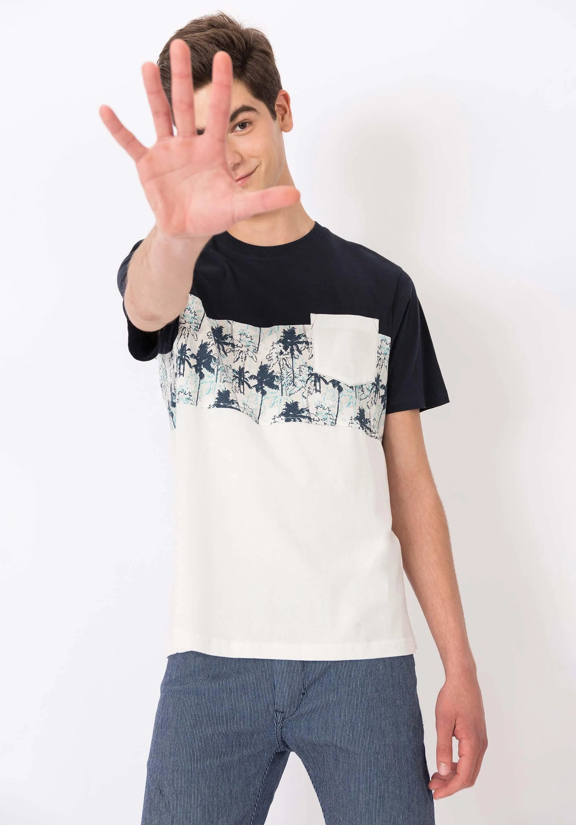 Regular Fit T-Shirt mit Rundhalsausschnitt und kurzen Ärmeln. Vordertasche. Gerippter Hals. Schnittdetails mit Aufdruck.