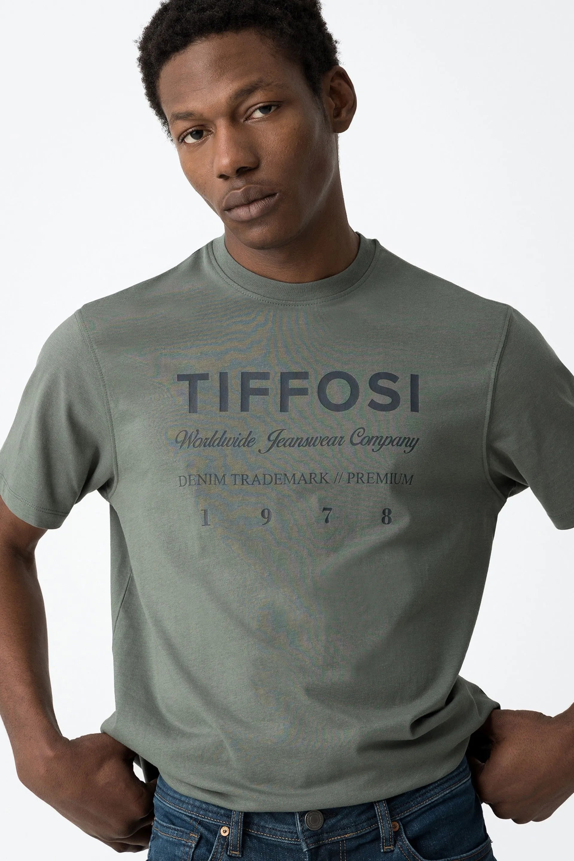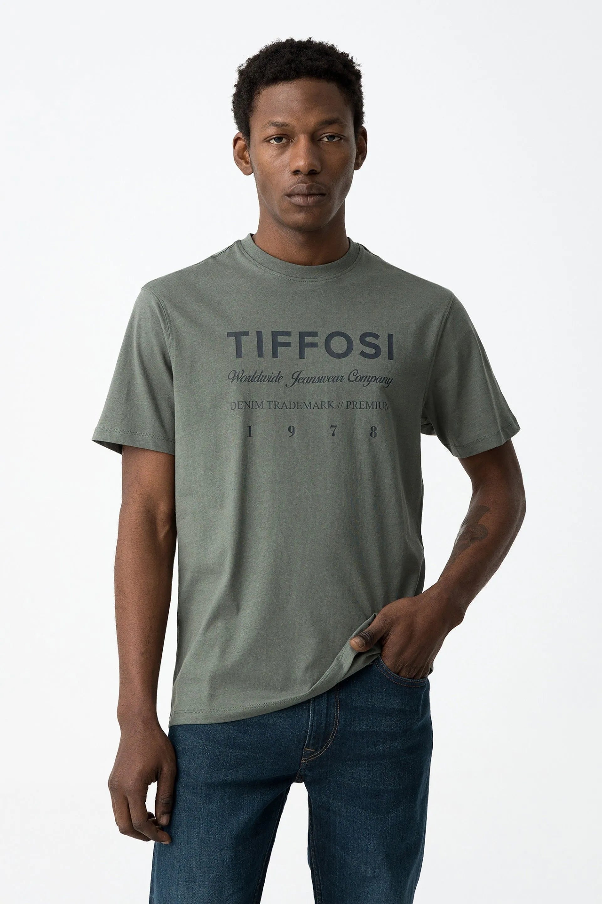 T-Shirt mit Rundhalsausschnitt und kurzen Ärmeln. Aufdruck auf der Vorderseite. Gerippter Halsausschnitt.