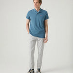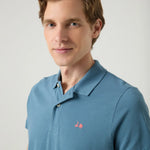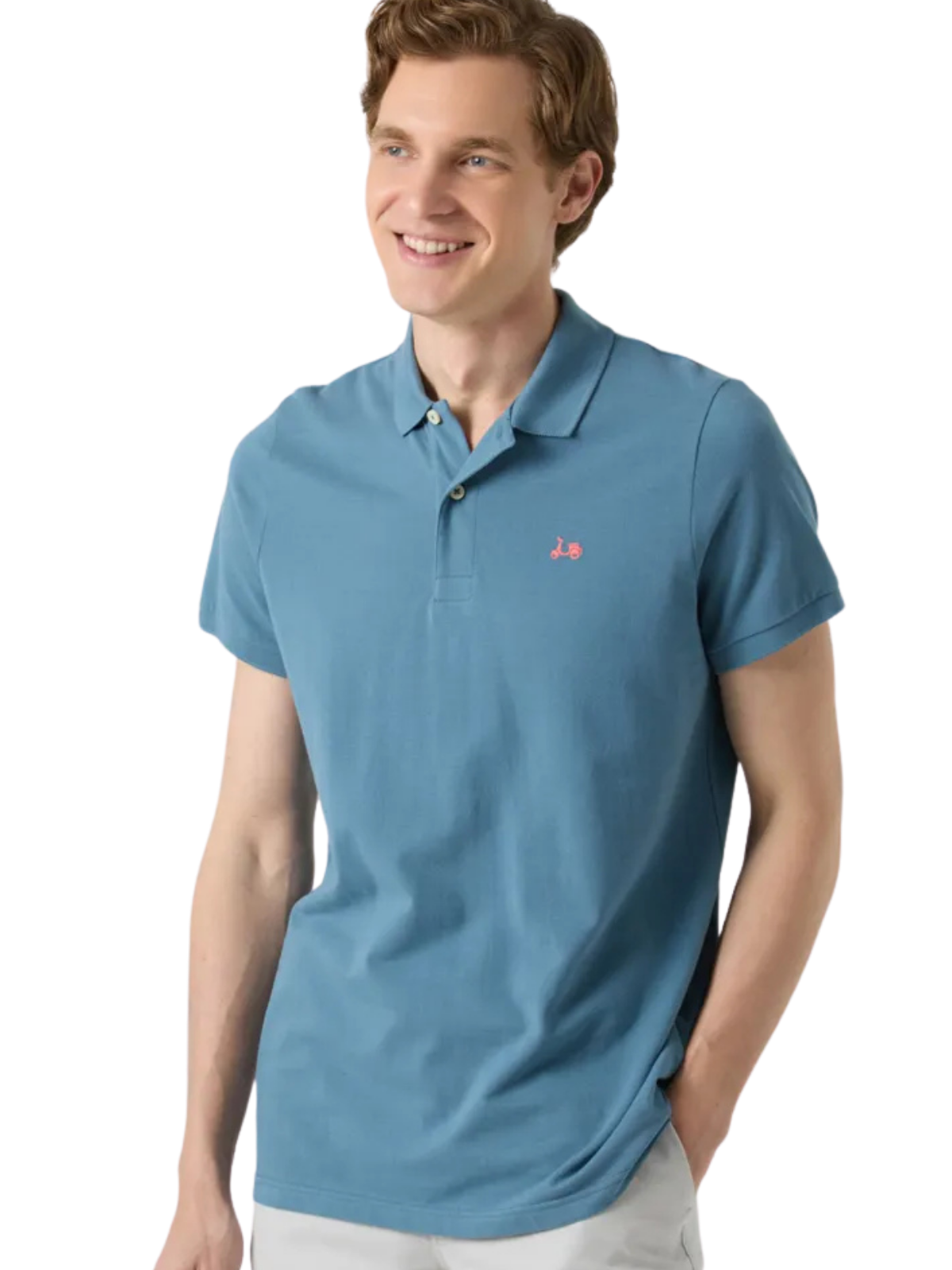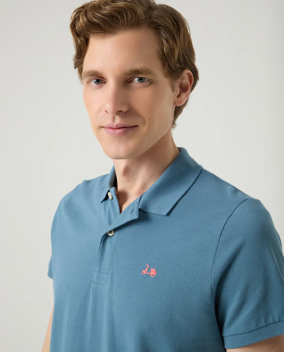 Su diseño de manga corta y cuello con cierre de botones mantiene la esencia clásica del polo, mientras que el bordado a contraste en el pecho aporta un detalle distintivo y discreto. El tono denim refuerza su carácter casual y hace que combine fácilmente con pantalones chinos, vaqueros o bermudas.