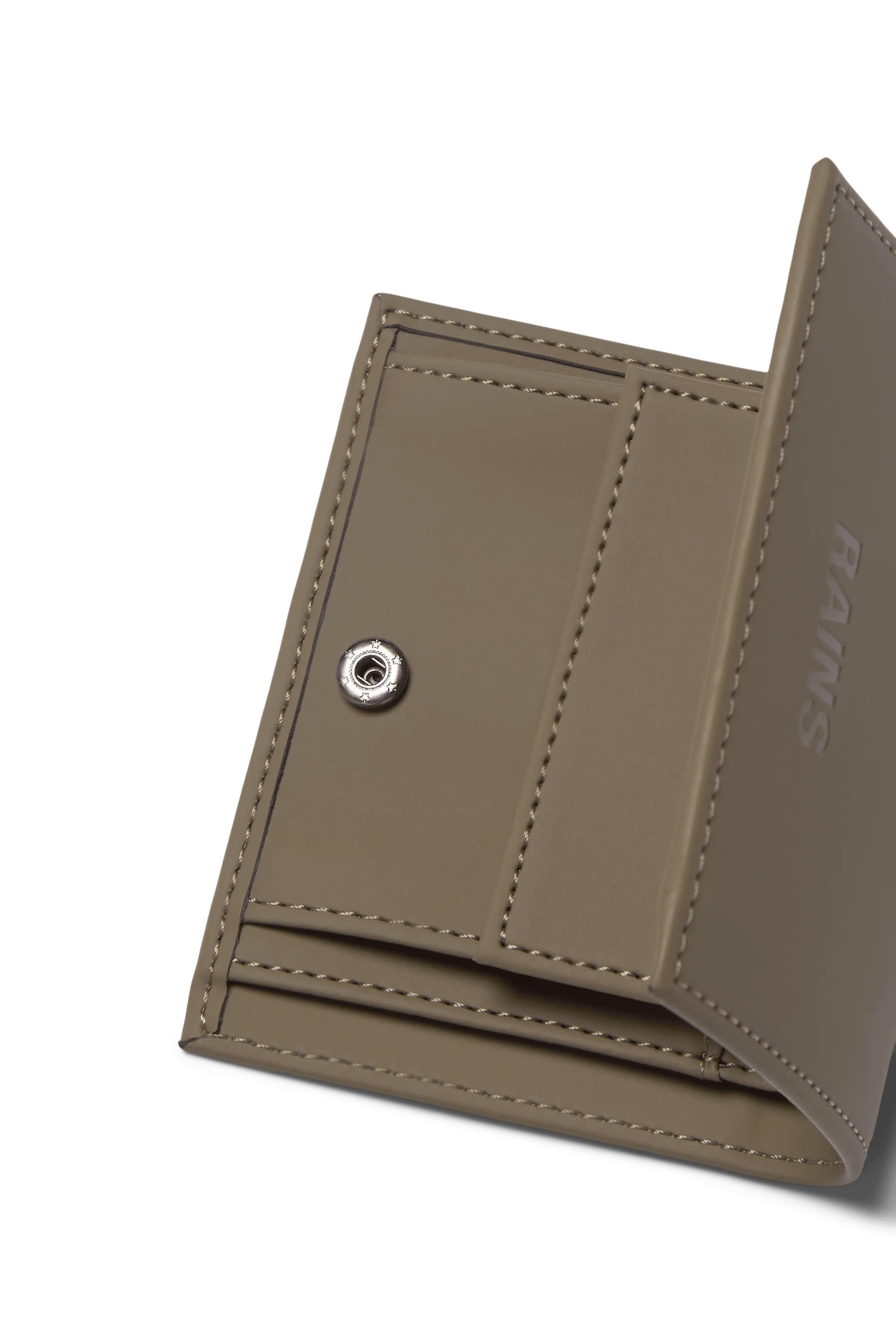 Das Rains Bifold Wallet ist ein Portemonnaie für acht Karten, das außerdem über zwei große Fächer für Bargeld und Quittungen und ein Münzfach mit Druckknopf verfügt. Die gefaltete Brieftasche ist aus dem charakteristischen wasserdichten Stoff von Rains gefertigt.