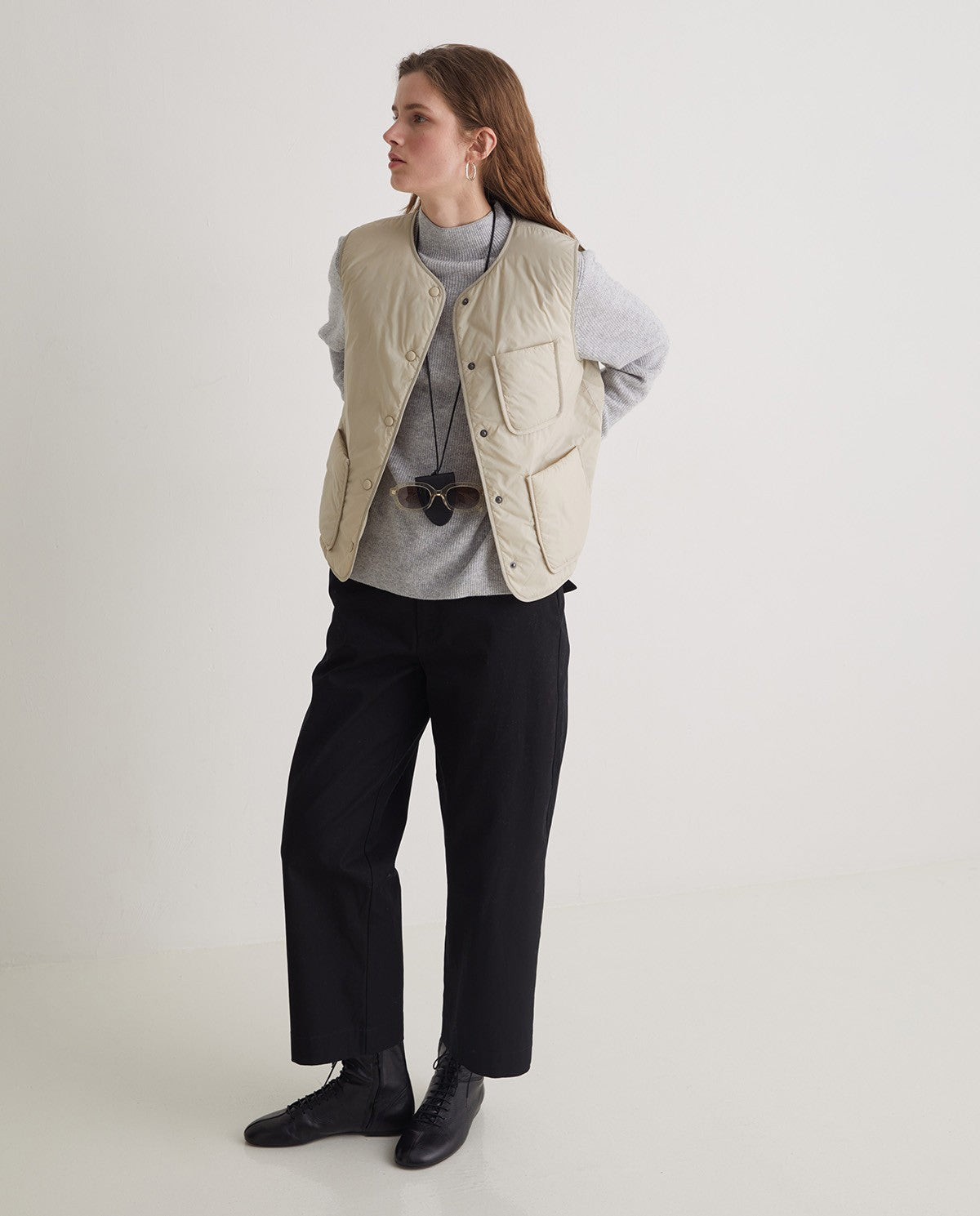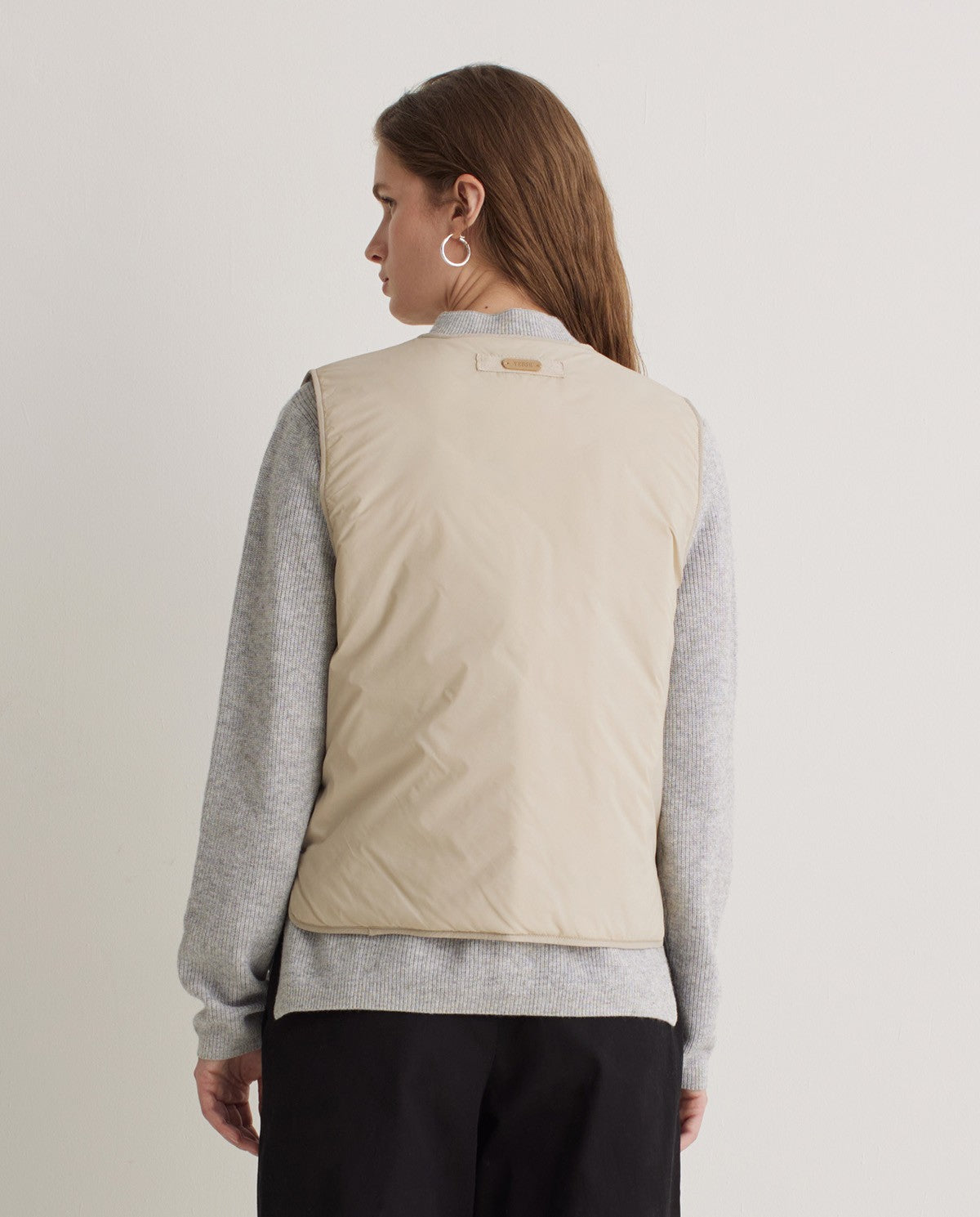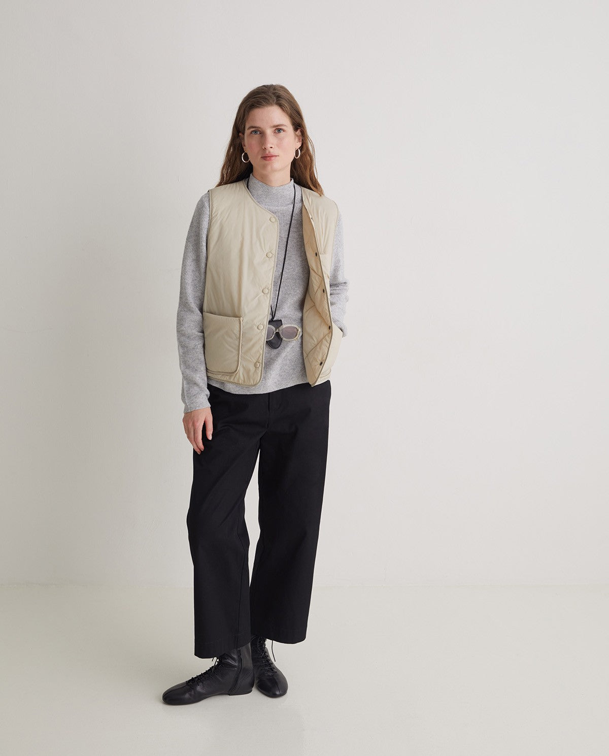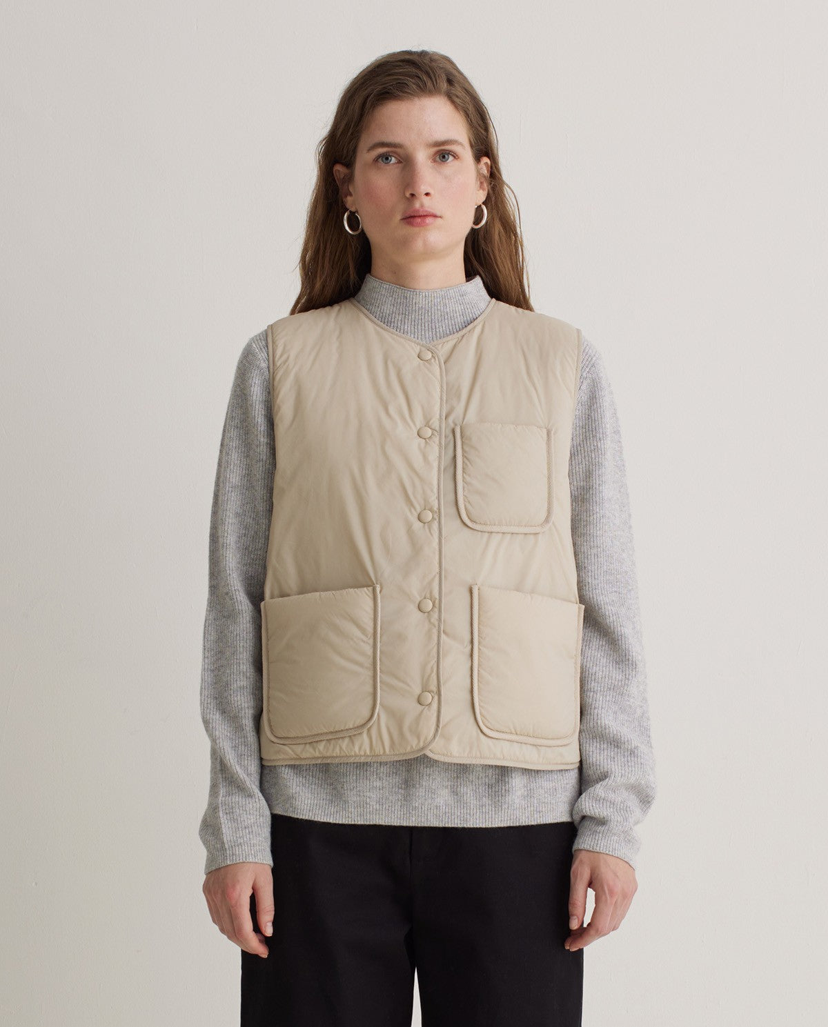 Chaleco water repellent. Tejido con fibras recicladas. Regular fit. Cuello redondo. Sin mangas. Cierre con botones a presión. Aberturas laterales en bajos. 3 bolsillos plastrón con ribete delante y 1 bolsillo interior con cierre de velcro.