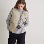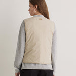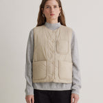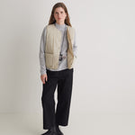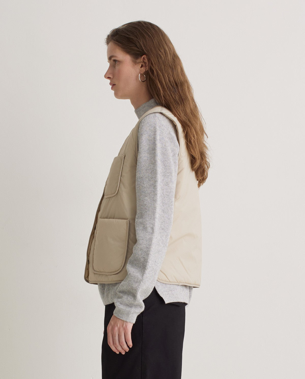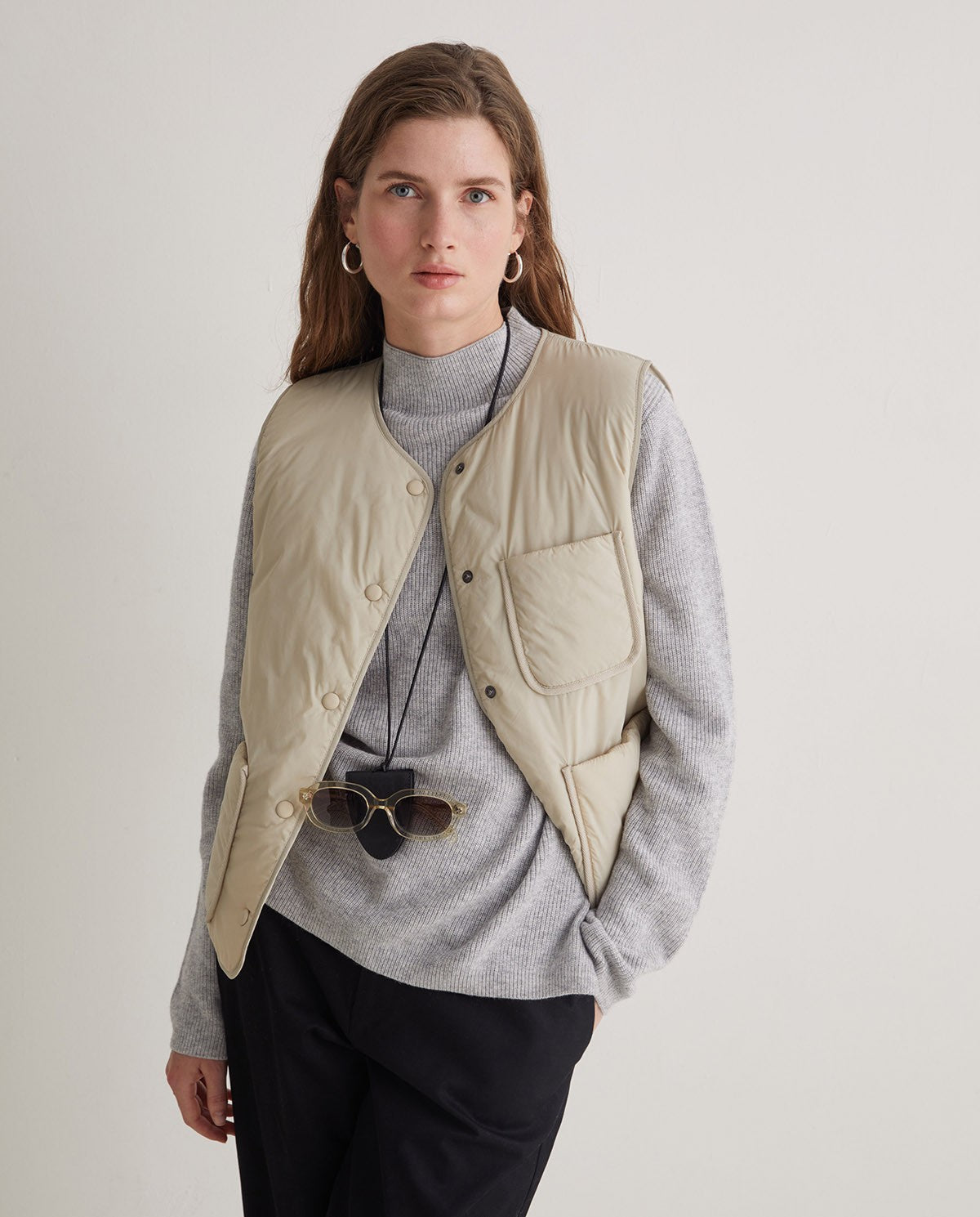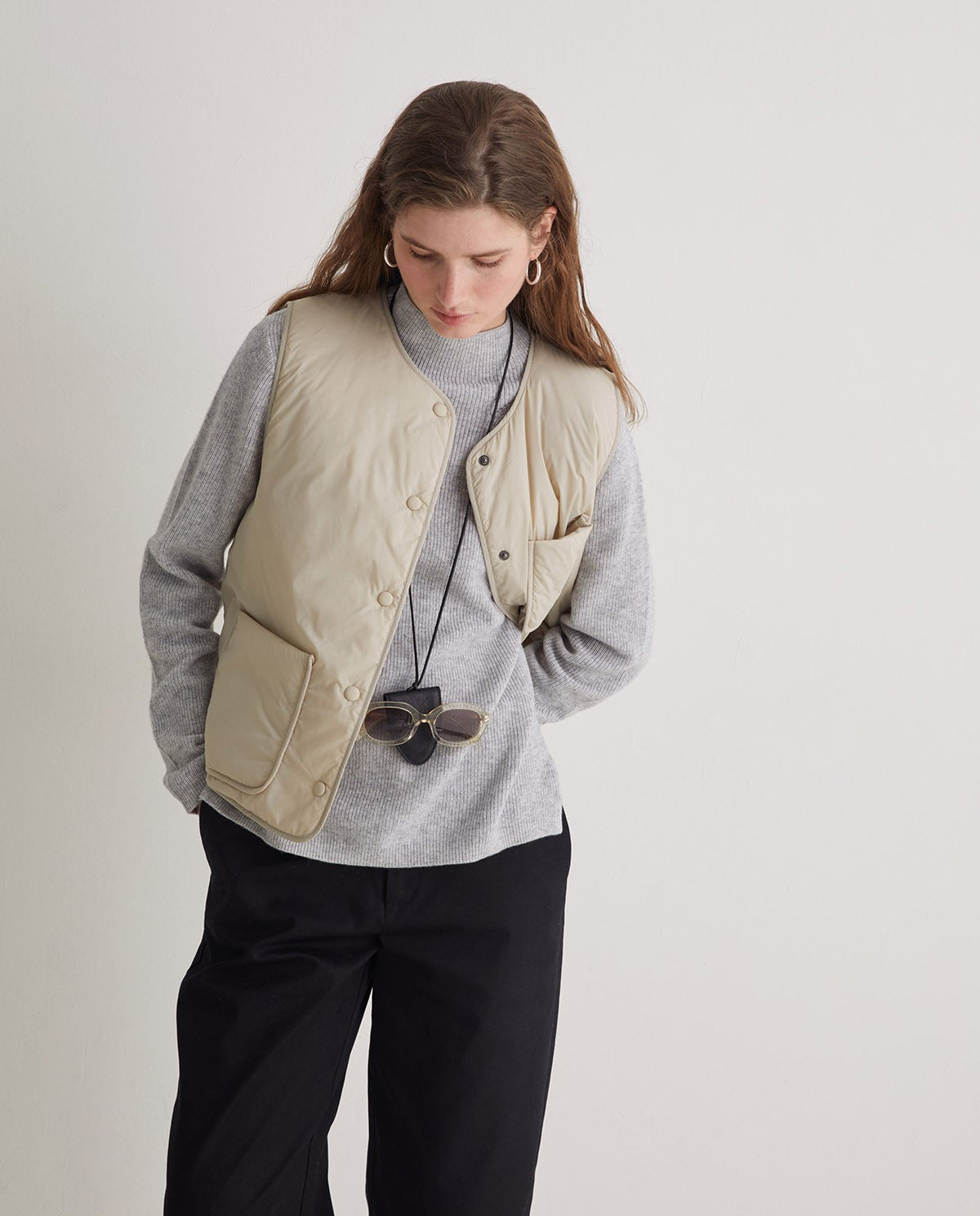 Chaleco water repellent. Tejido con fibras recicladas. Regular fit. Cuello redondo. Sin mangas. Cierre con botones a presión. Aberturas laterales en bajos. 3 bolsillos plastrón con ribete delante y 1 bolsillo interior con cierre de velcro.