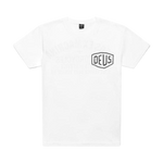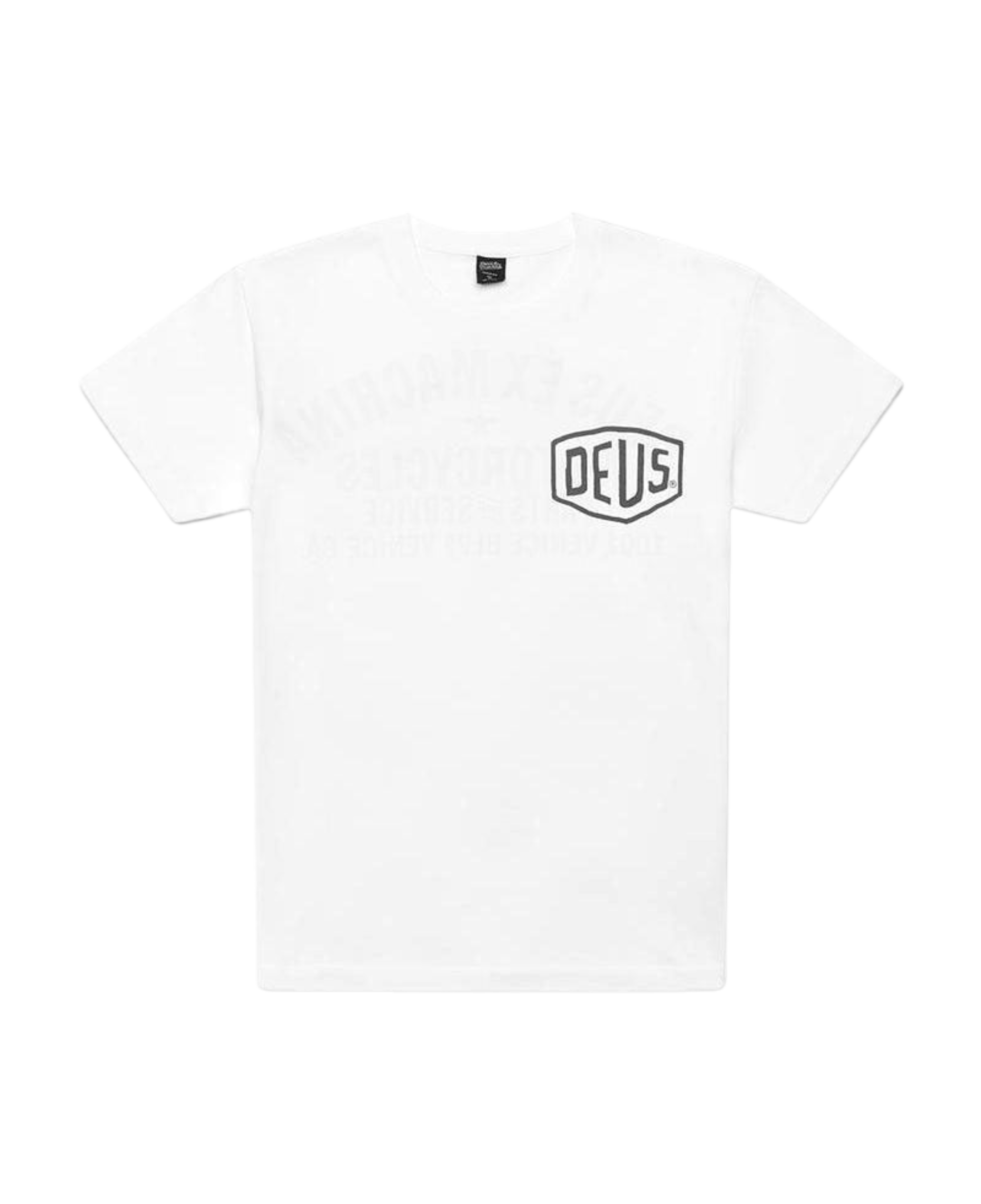 Dieses weiße Herren-T-Shirt mit normaler Passform verfügt über einen originalen Deus-Aufdruck auf der Vorder- und Rückseite und ist aus weichem 190-g/m²-Baumwolljersey gefertigt.