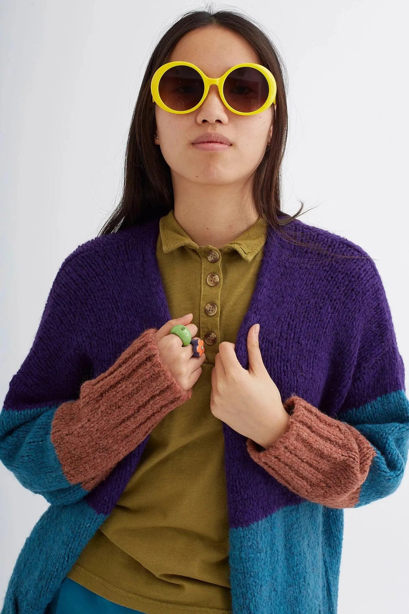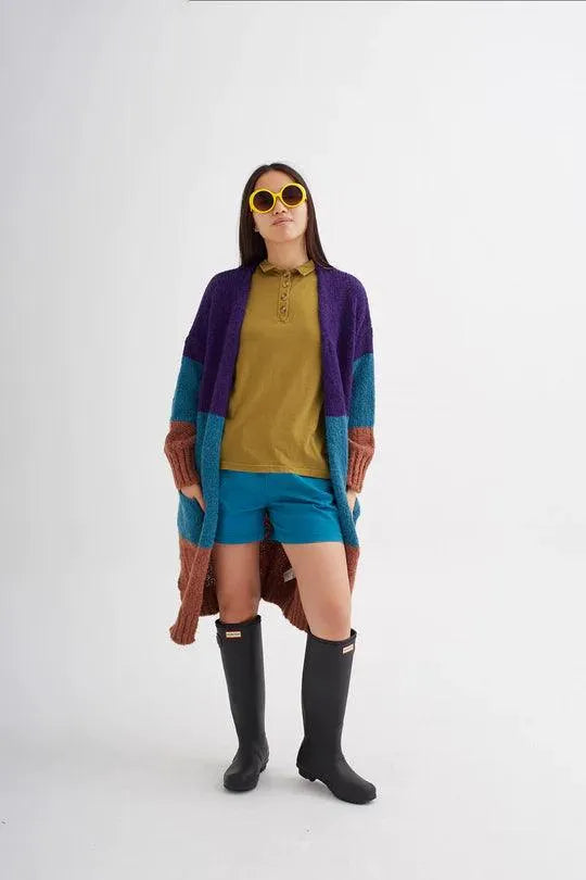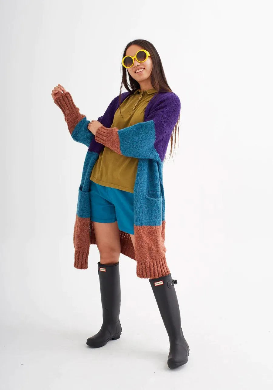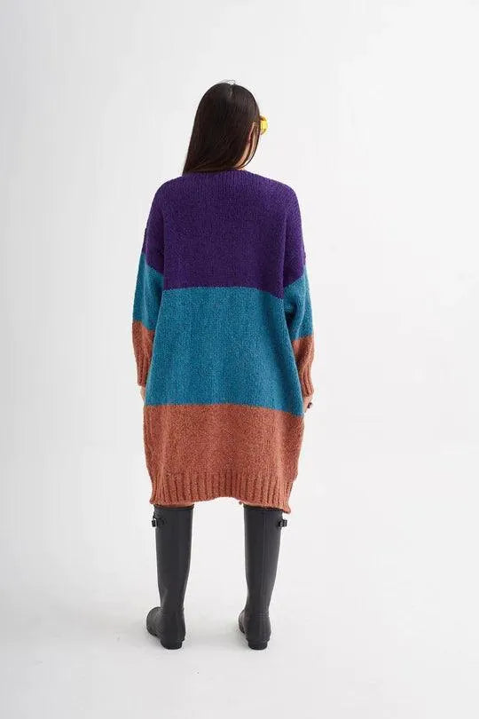 Dreifarbiger, langer, offener Cardigan.