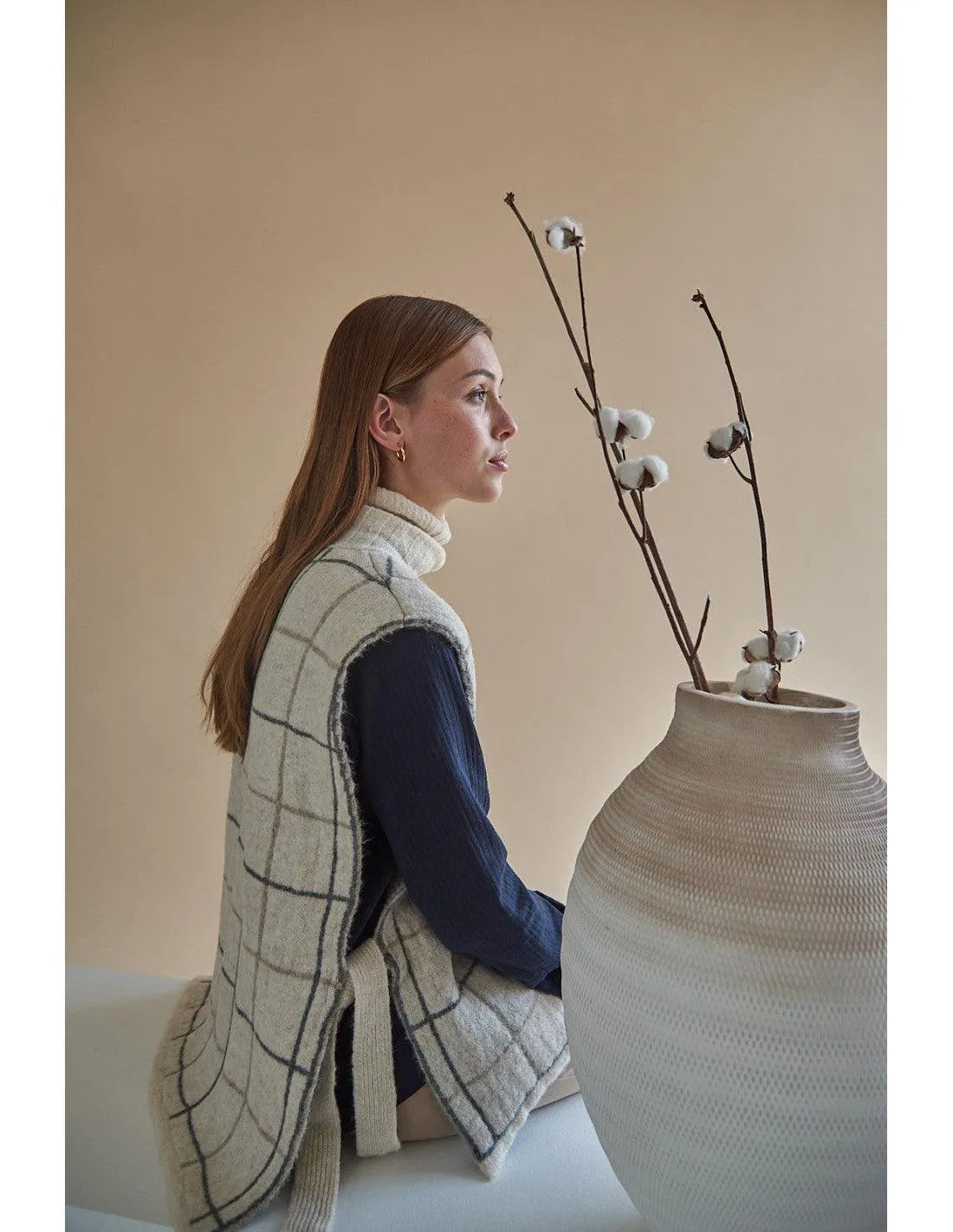 Stehkragen und gewebte Karos mit seitlicher Schnürung.