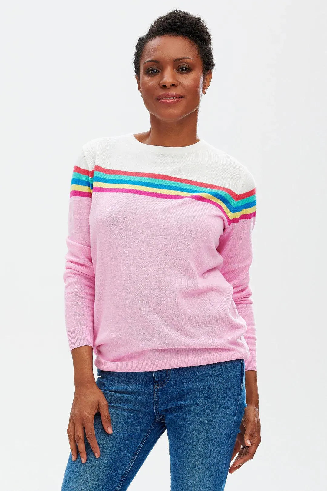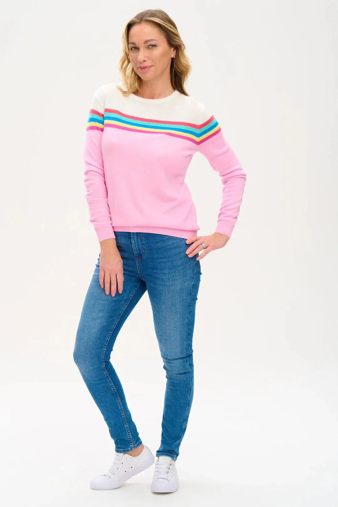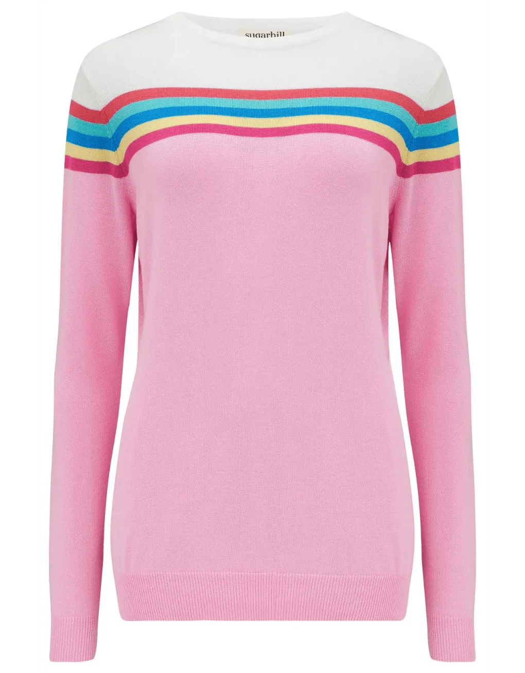 Unser meistverkaufter halb taillierter Rita Pullover hat eine leichte Baumwollmischung, einen Rundhalsausschnitt und endet in der Mitte der Hüfte. Unsere Auswahl an Designs bietet eine einfache Möglichkeit, Ihrer Garderobe etwas Spaß und Farbe zu verleihen. Das Regenbogen-Split-Design ist lebendig und retro, mit einem Regenbogenband, das eine cremefarbene und rosa Basis schneidet.