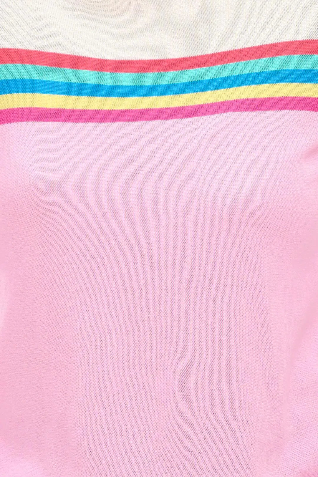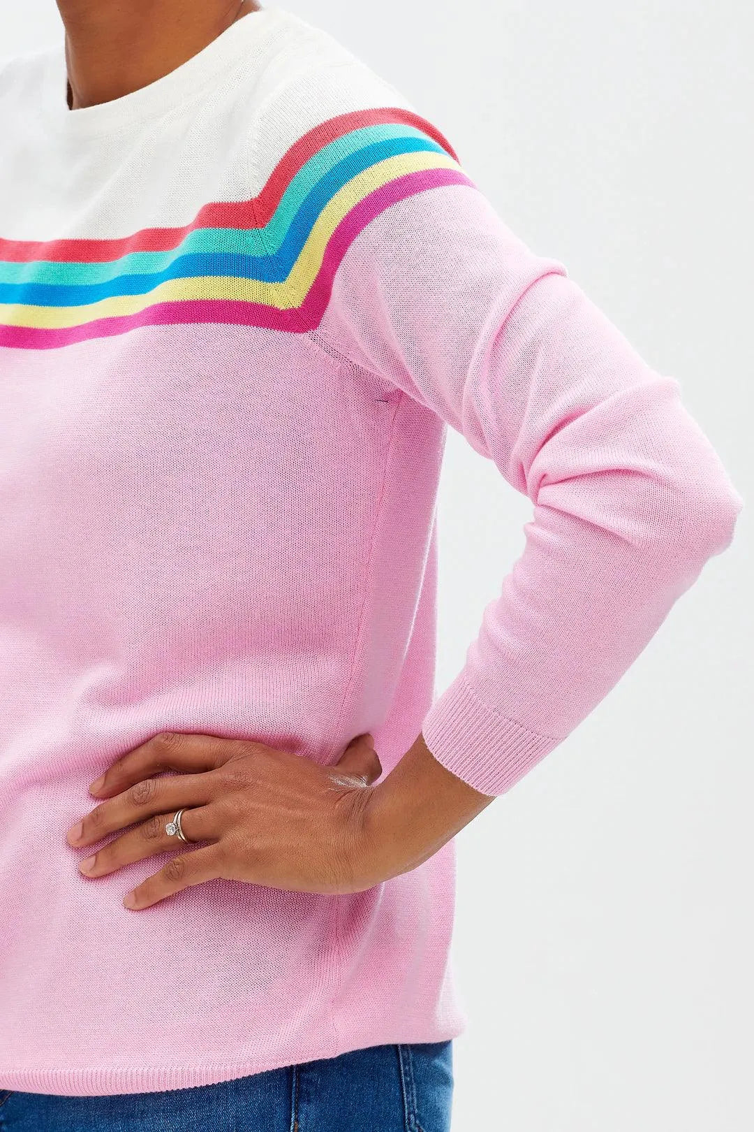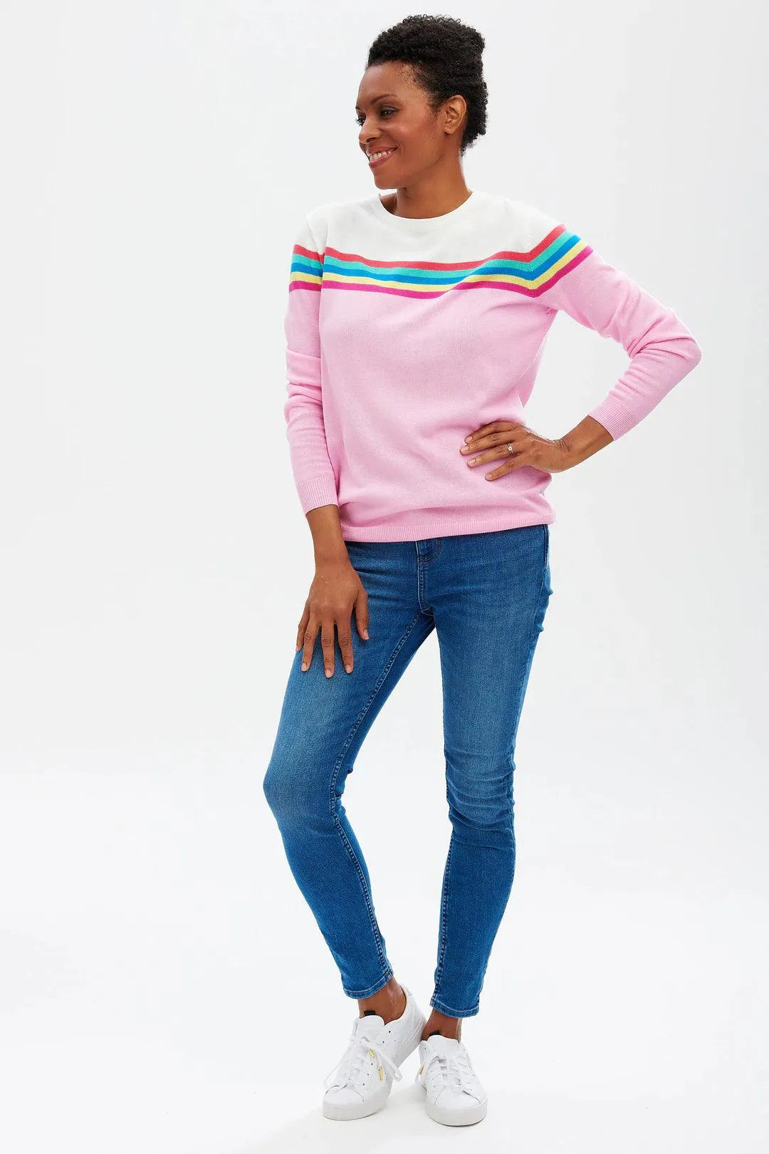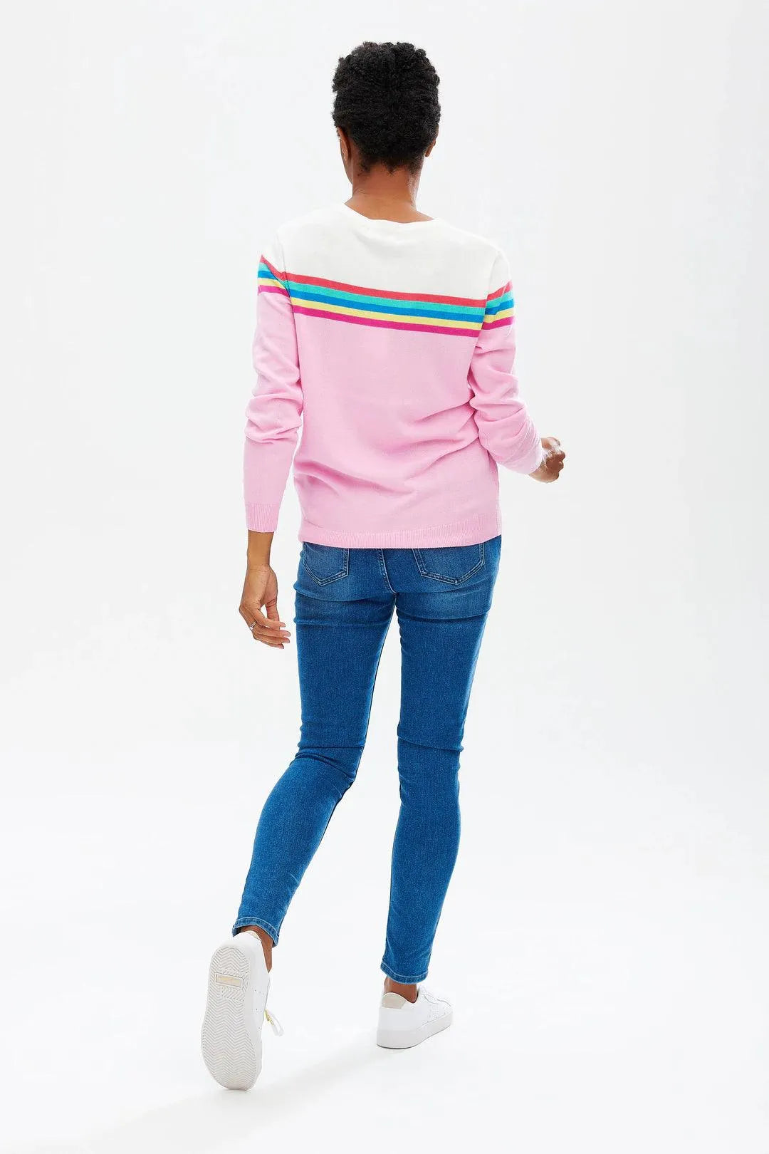 Unser meistverkaufter halb taillierter Rita Pullover hat eine leichte Baumwollmischung, einen Rundhalsausschnitt und endet in der Mitte der Hüfte. Unsere Auswahl an Designs bietet eine einfache Möglichkeit, Ihrer Garderobe etwas Spaß und Farbe zu verleihen. Das Regenbogen-Split-Design ist lebendig und retro, mit einem Regenbogenband, das eine cremefarbene und rosa Basis schneidet.