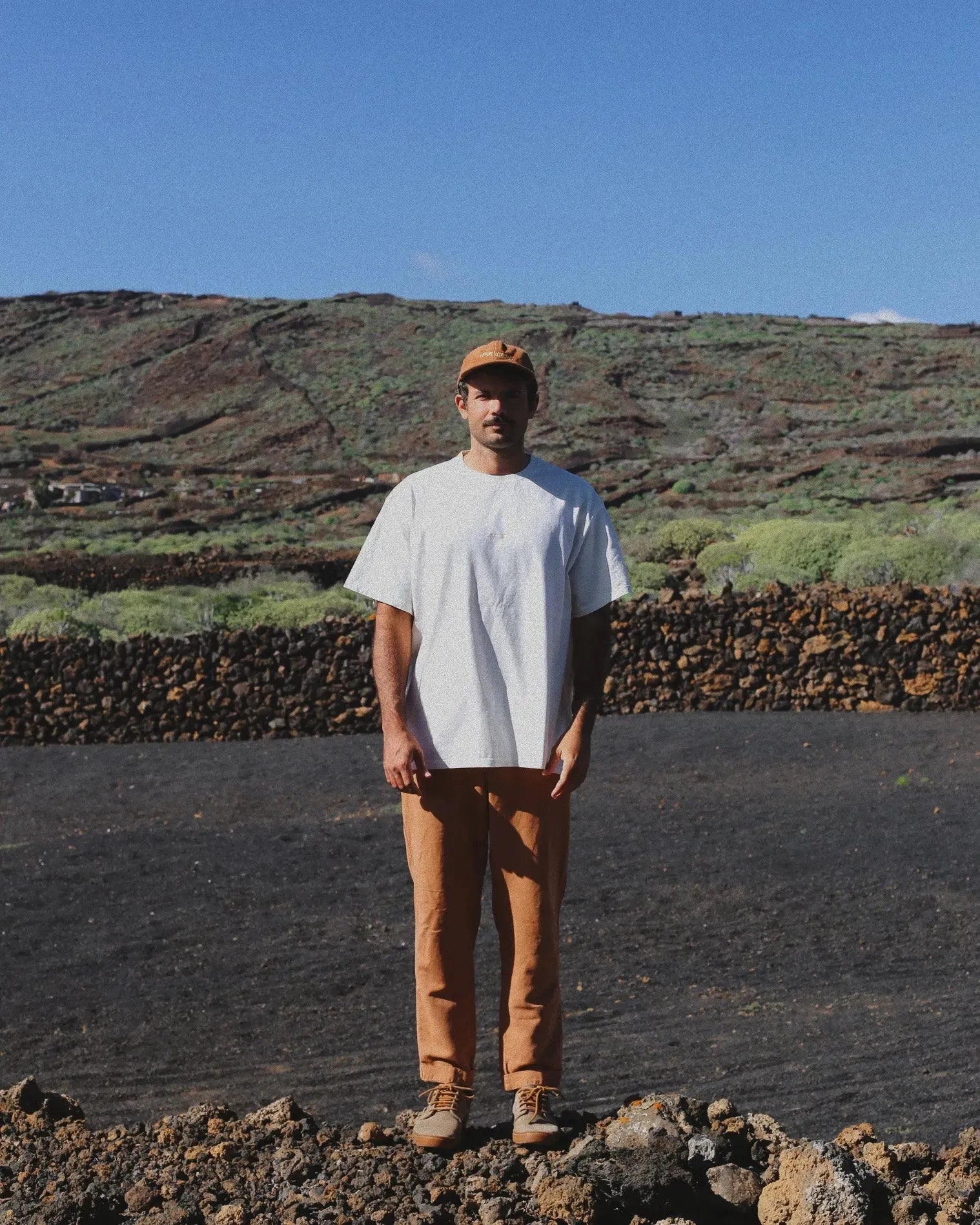 Stückfärbung mit natürlichen Pigmenten und Stonewashing. Traditioneller Siebdruck mit wasserbasierten Tinten. Zertifizierungen: Bio-Baumwolle, GOTS, Öko-Tex Standard 100 und REACH-Konformität. Der Versand erfolgt in kompostierbaren Beuteln aus Kartoffelstärke zum Schutz der Kleidungsstücke.