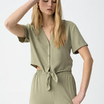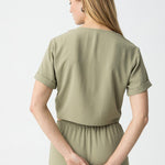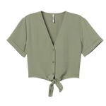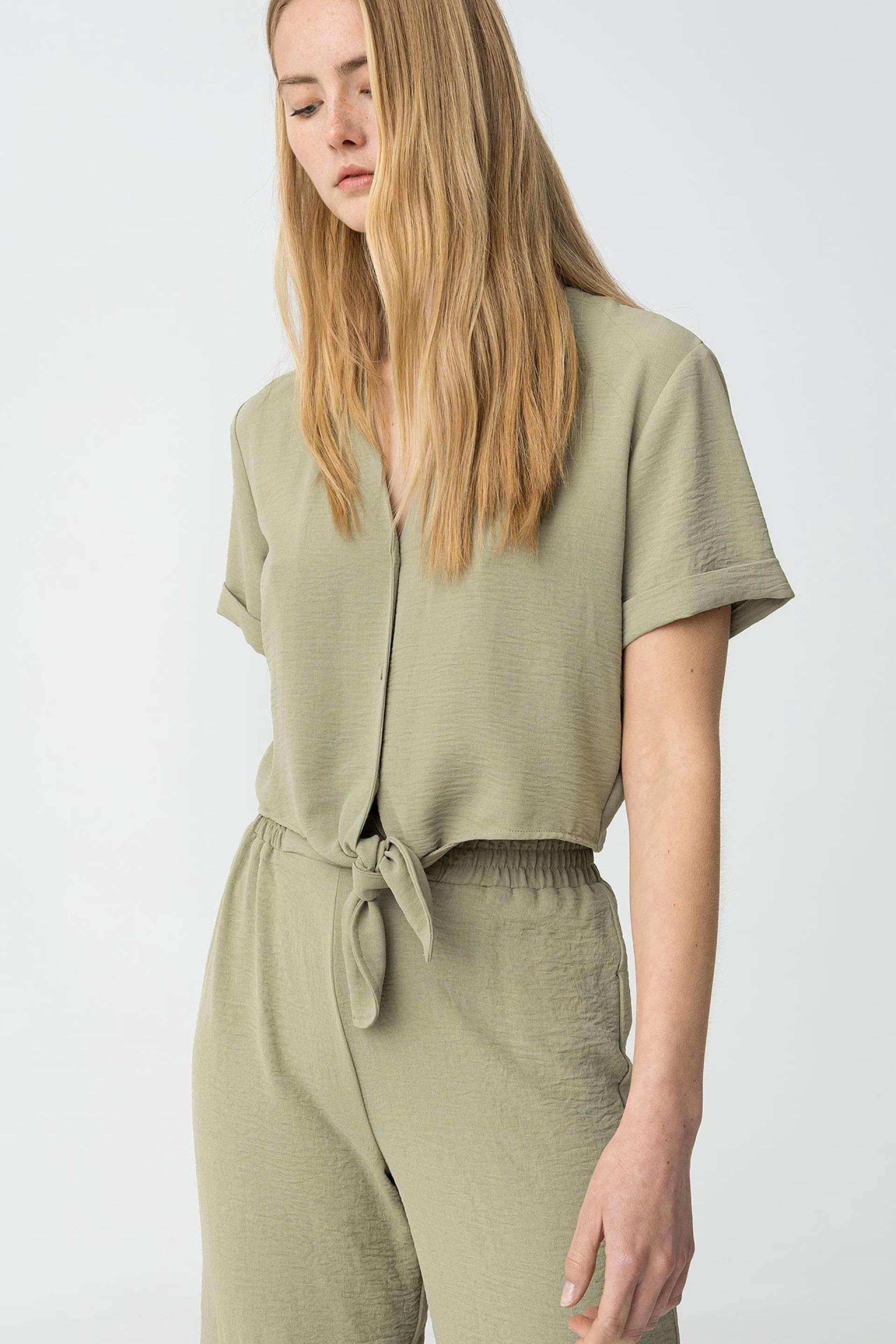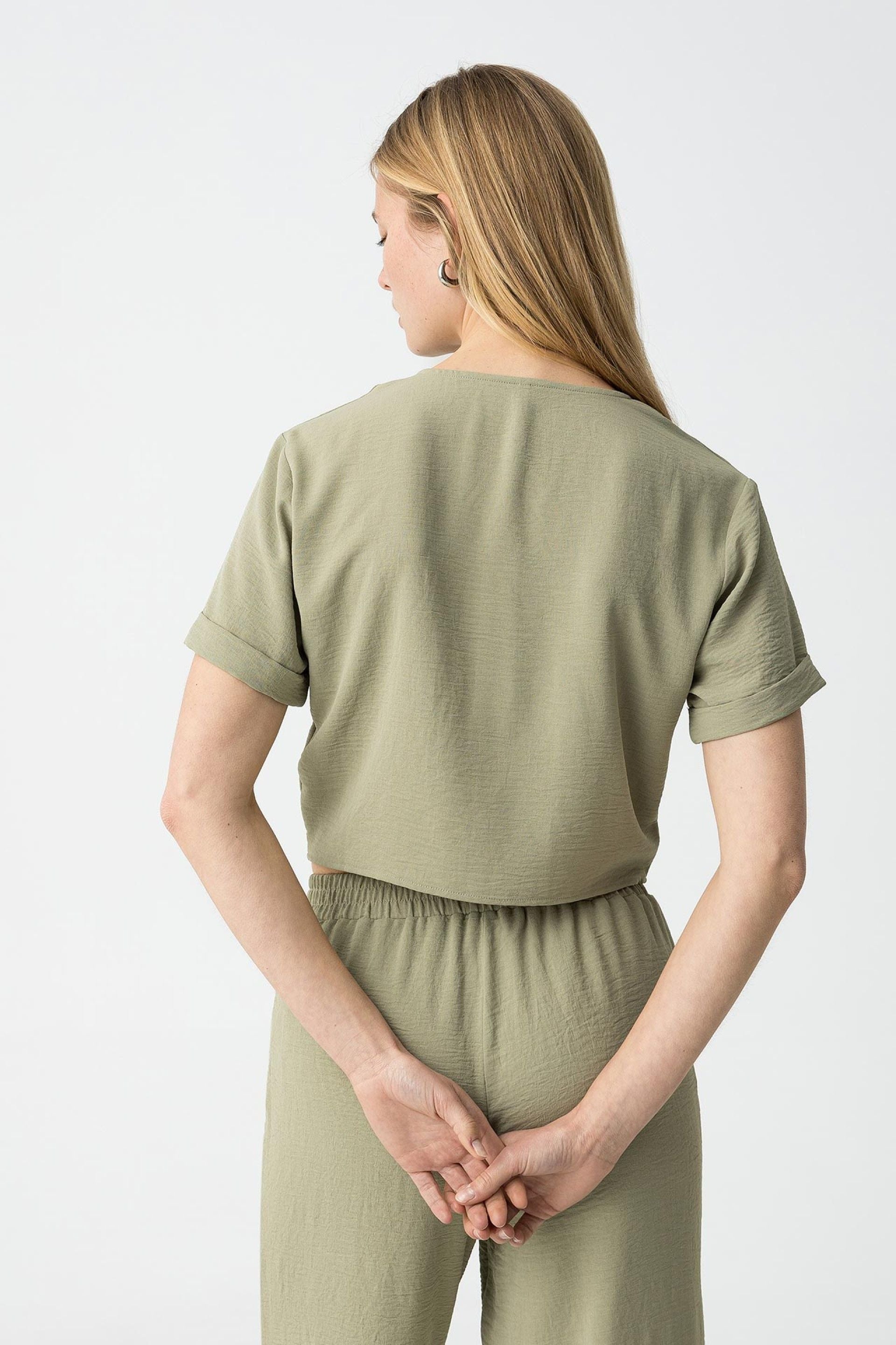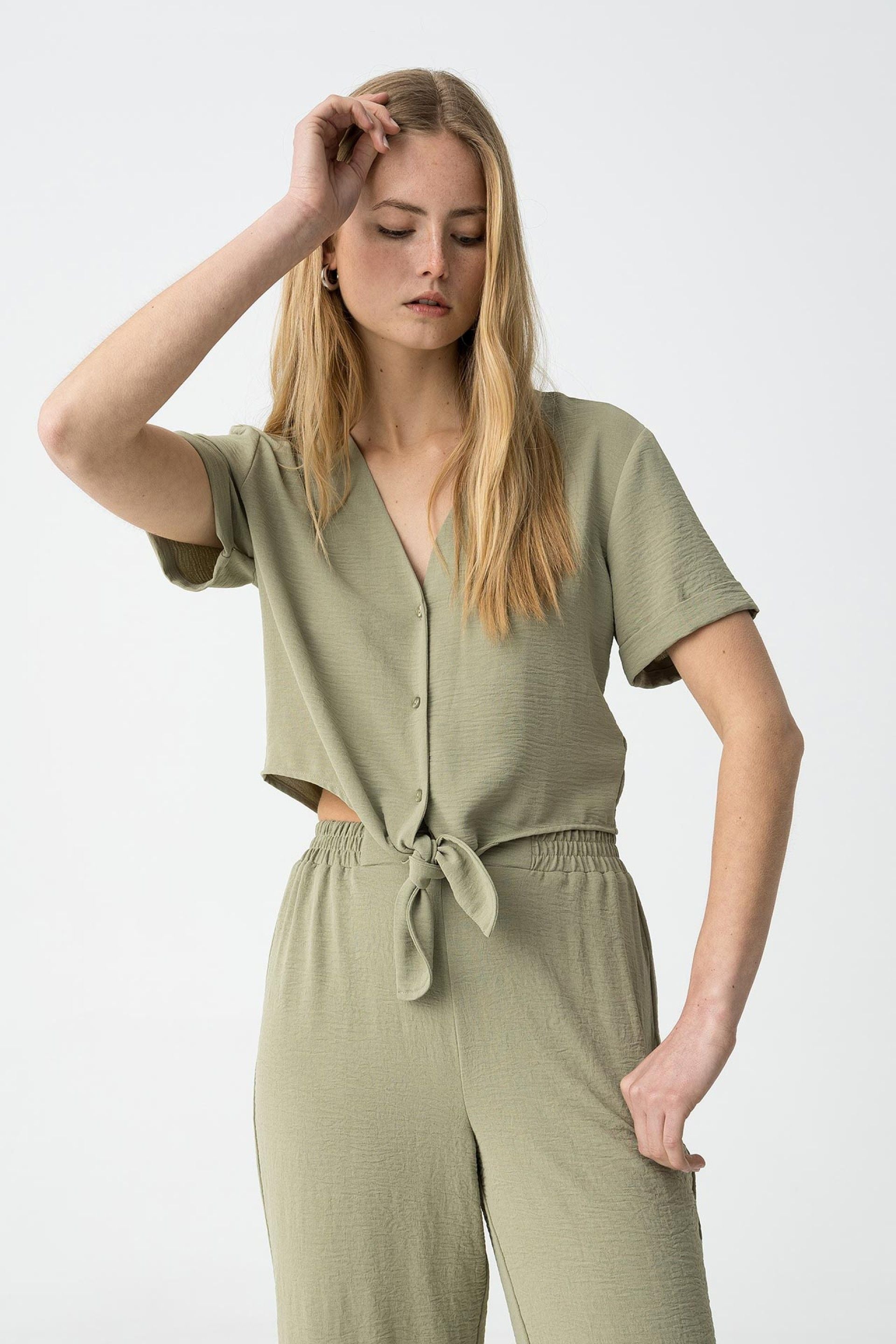 Kurze Bluse mit V-Ausschnitt und kurzen Ärmeln. Knopf- und Schleifenverschluss vorne.