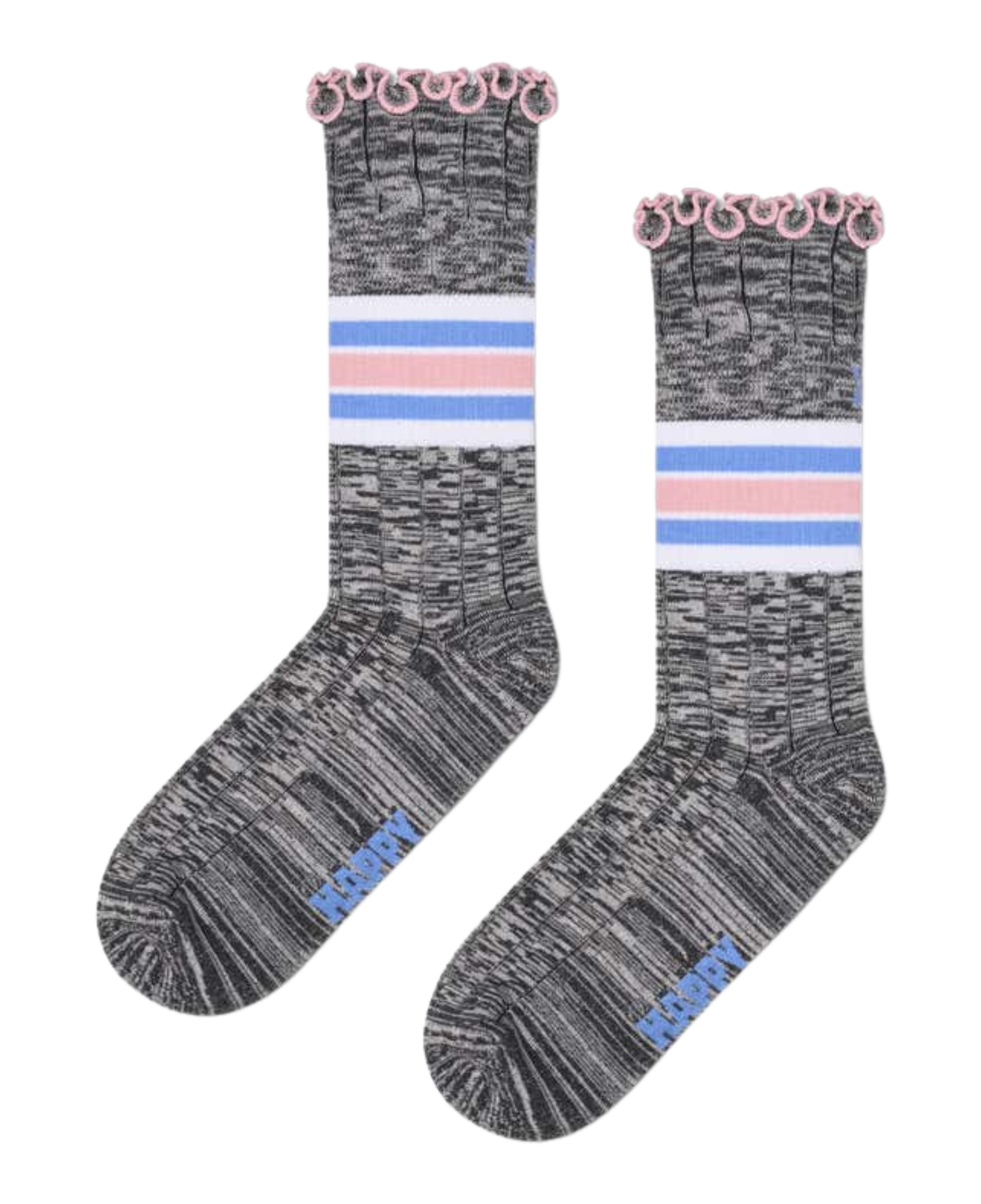 Los Fairy Socks P003129 de Happy Socks combinan un diseño divertido con materiales de alta calidad. Confeccionados principalmente en algodón, ofrecen un tacto suave, gran comodidad y durabilidad gracias al refuerzo en el talón y la puntera. Su diseño con rayas delicadas y un acabado de volante en el puño aporta un toque femenino y original. El tono gris neutro los convierte en un complemento versátil que encaja tanto en looks casuales como más elegantes.