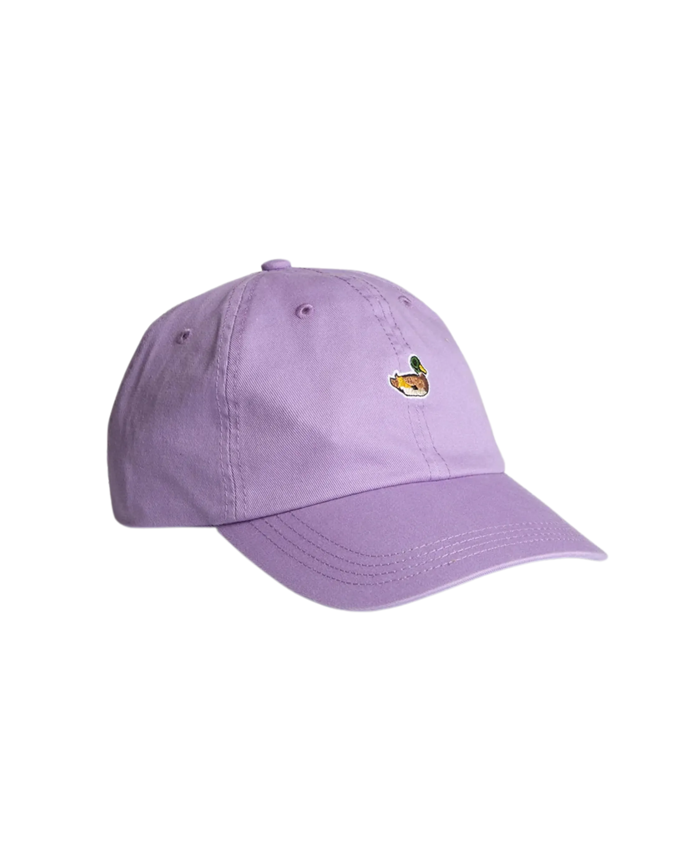 Klassische hellviolette Kappe aus 100 % Baumwolle. Mit unserer neuen gestickten Ente auf der Vorderseite und einem verstellbaren Verschluss auf der Rückseite.