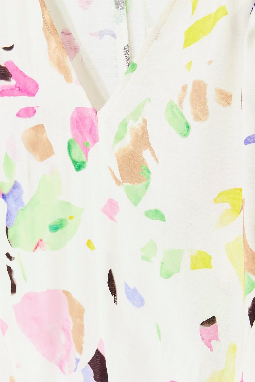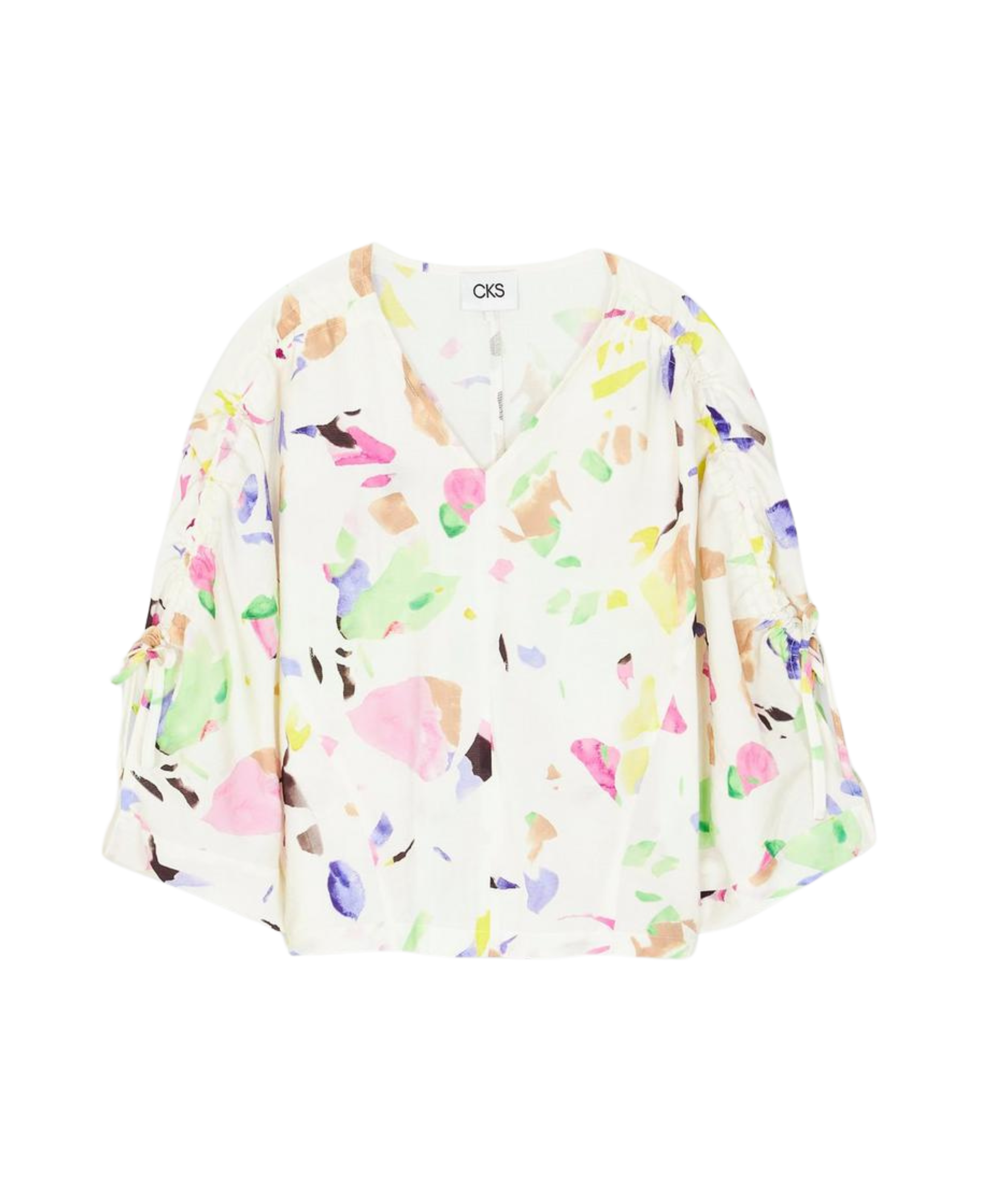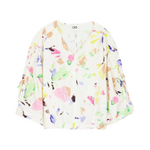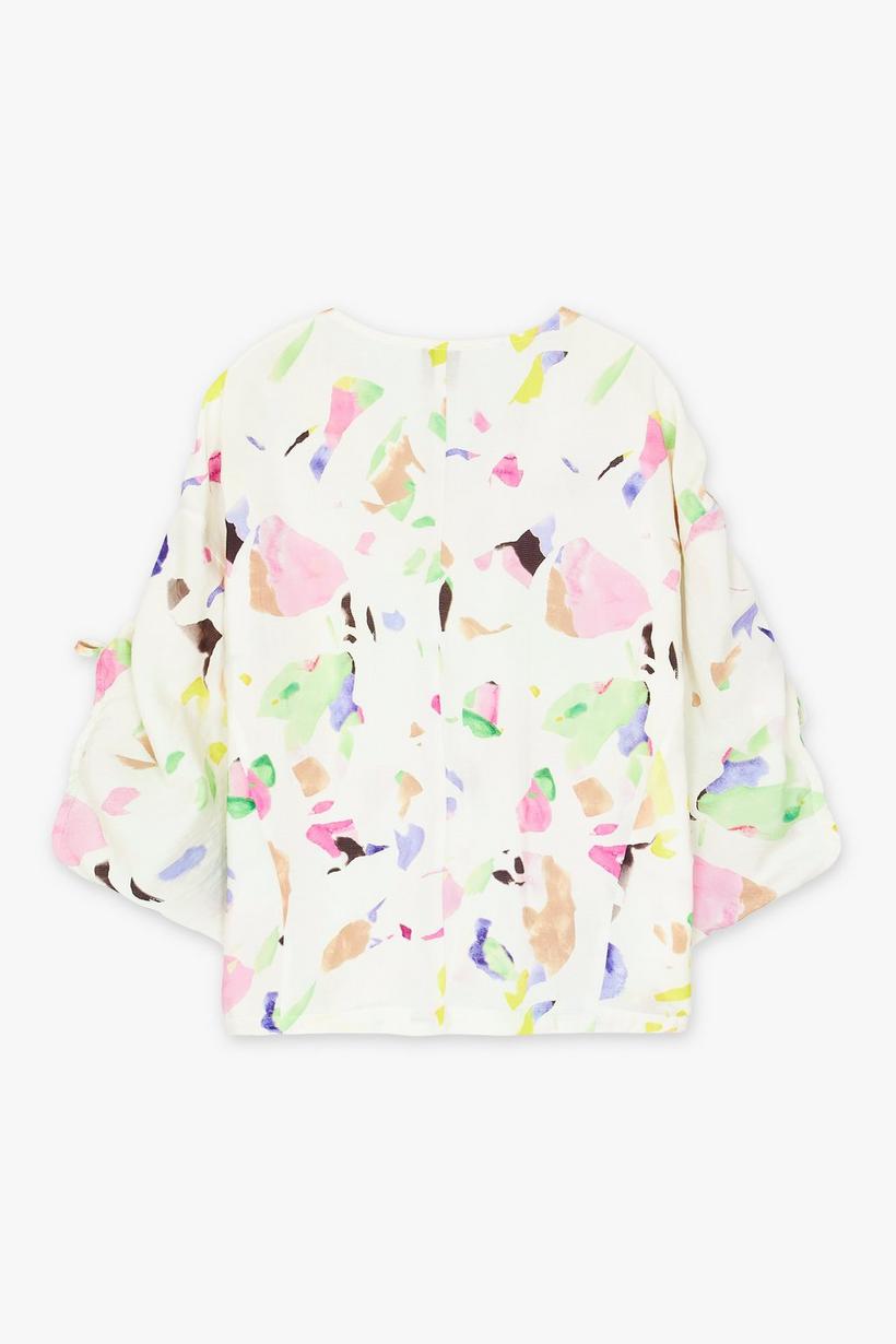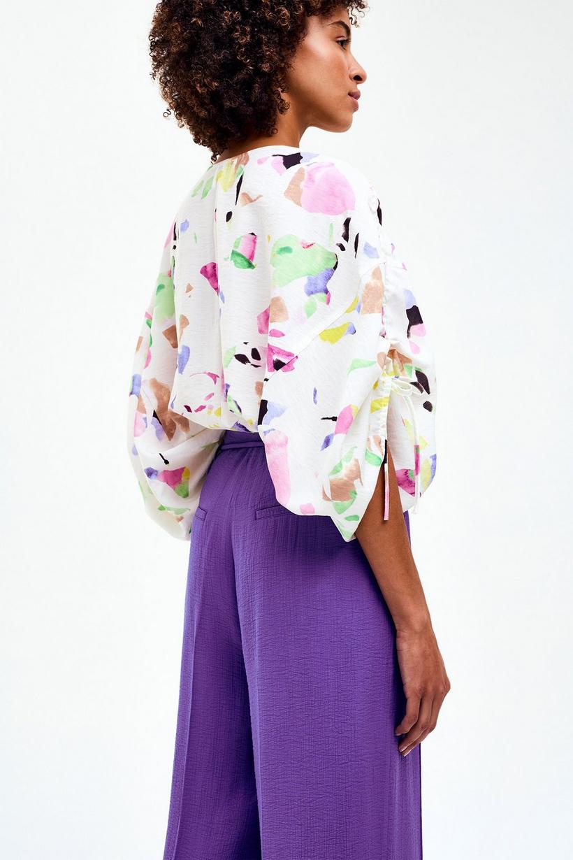 Für Süßigkeiten-Vibes! Diese weiße Damenbluse mit V-Ausschnitt und halblangen Ärmeln mit Kordelzug sorgt für einen eleganten Look. Der farbenfrohe Print erinnert an No-Nut-Hole-Bonbons und peppt Ihr Outfit sofort auf. Hergestellt aus 76 % LENZING™ ECOVERO™ und weiteren Materialien.