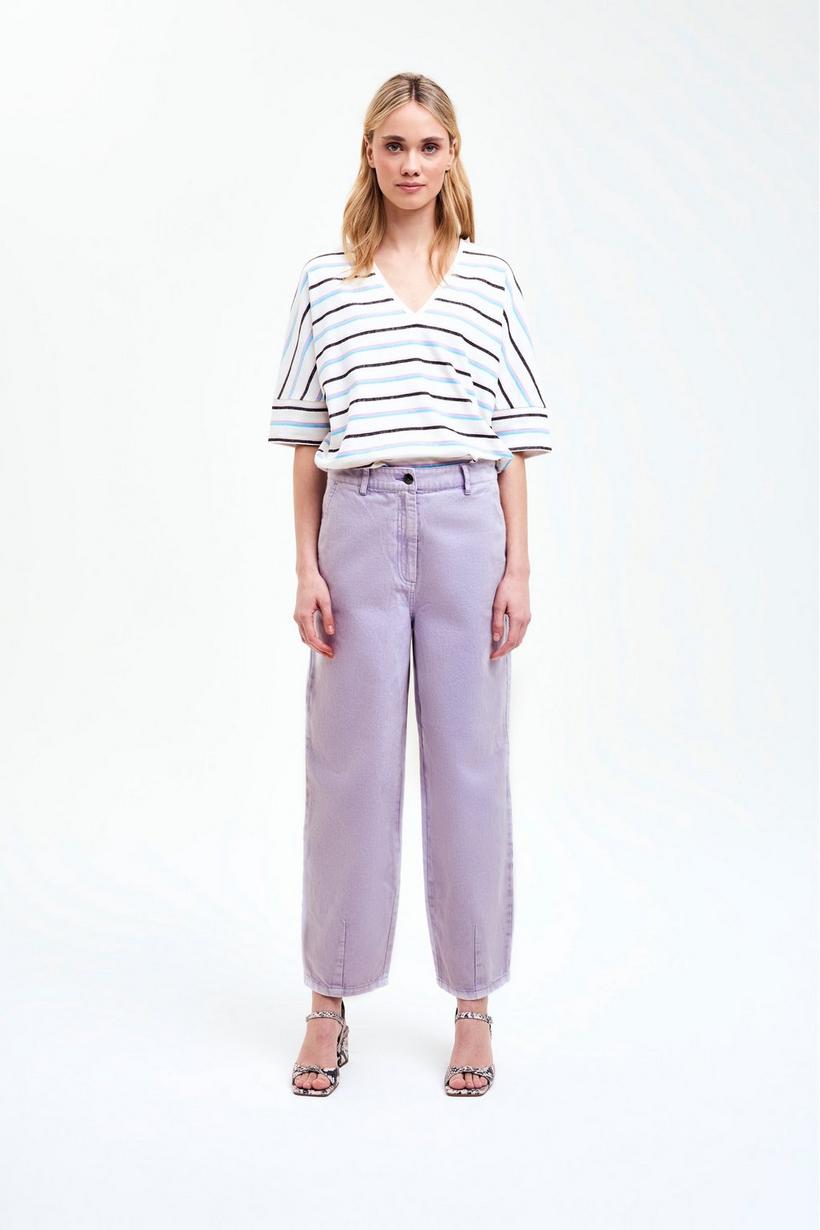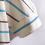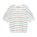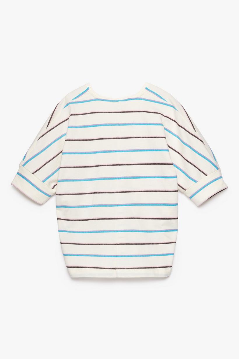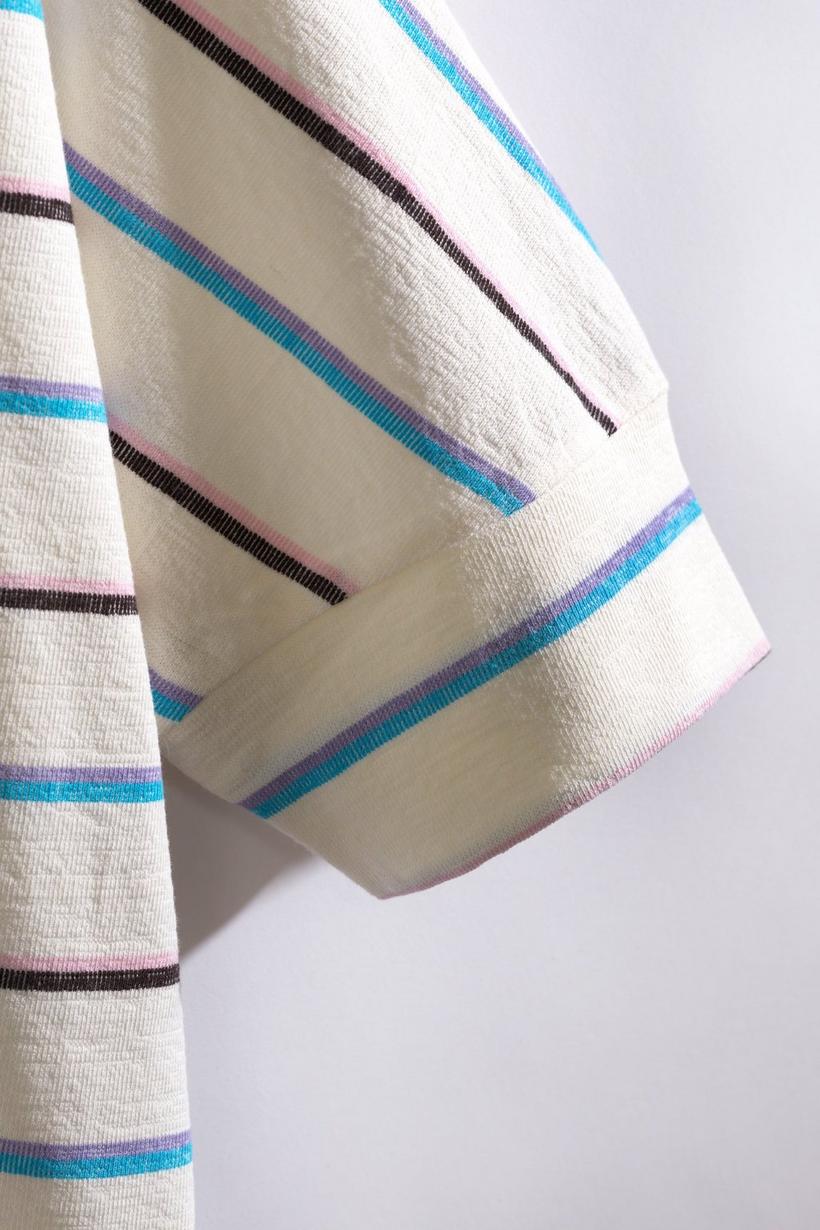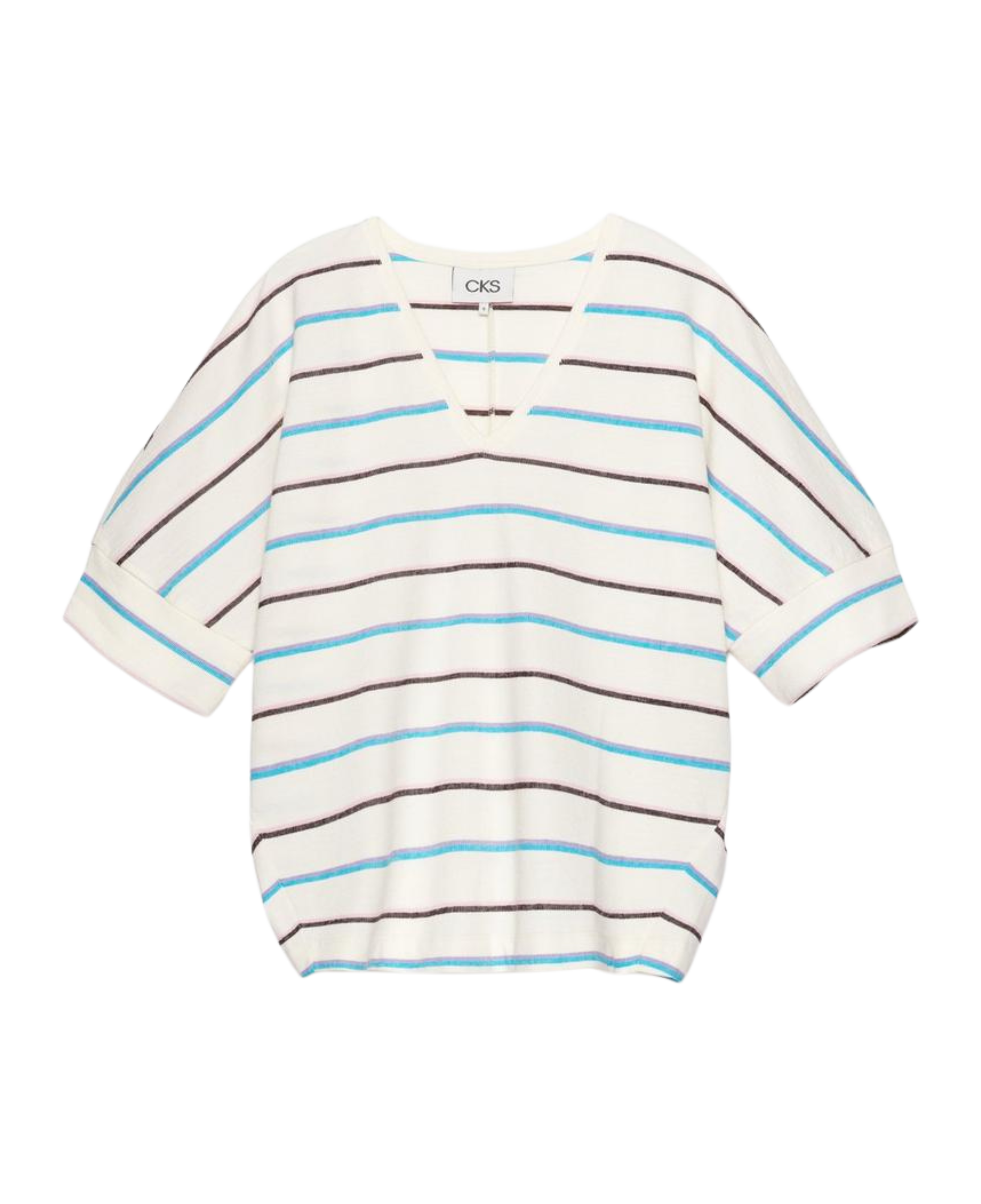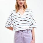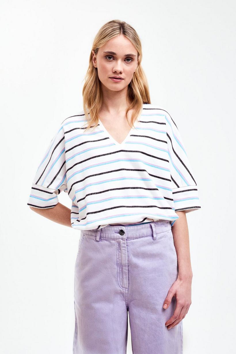Kennen Sie schon das beliebte ELDODEEP T-Shirt? Dieses weiß gestreifte Damen-T-Shirt hat kurze Ärmel mit Saum, einen V-Ausschnitt und eine Farbmischung aus Blau, Grün und Pink. Kombinieren Sie es vielseitig mit einem bunten Jeansrock, Shorts, Anzughosen oder Jeans.