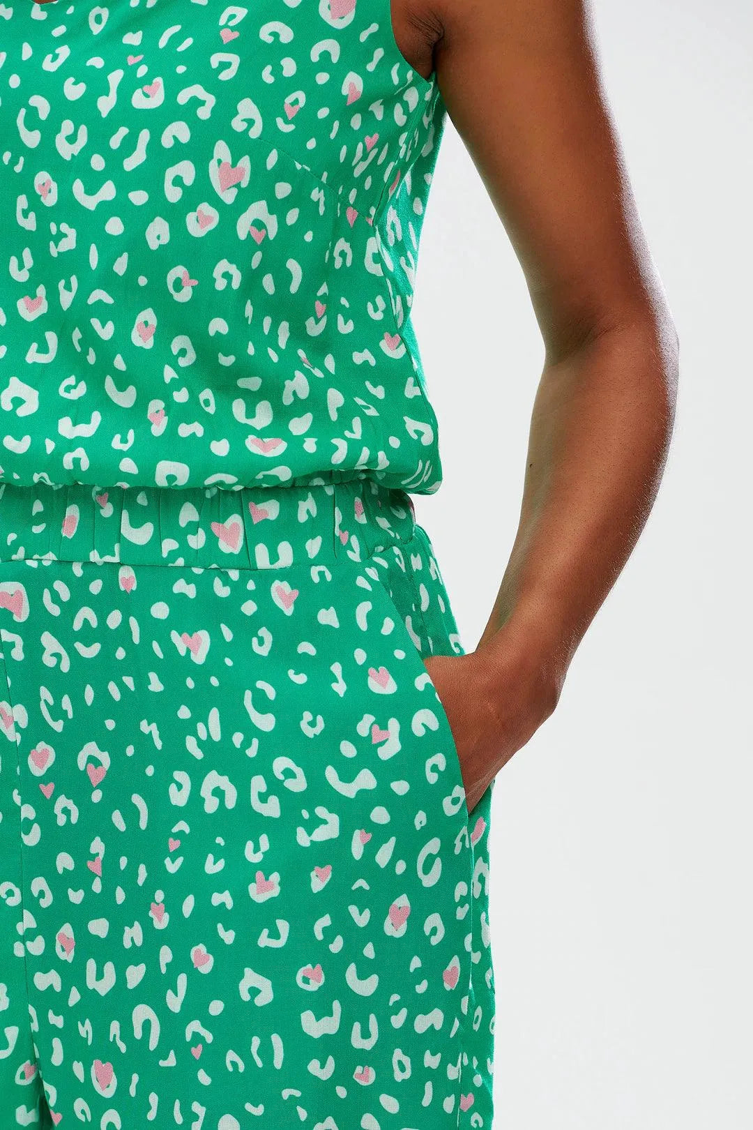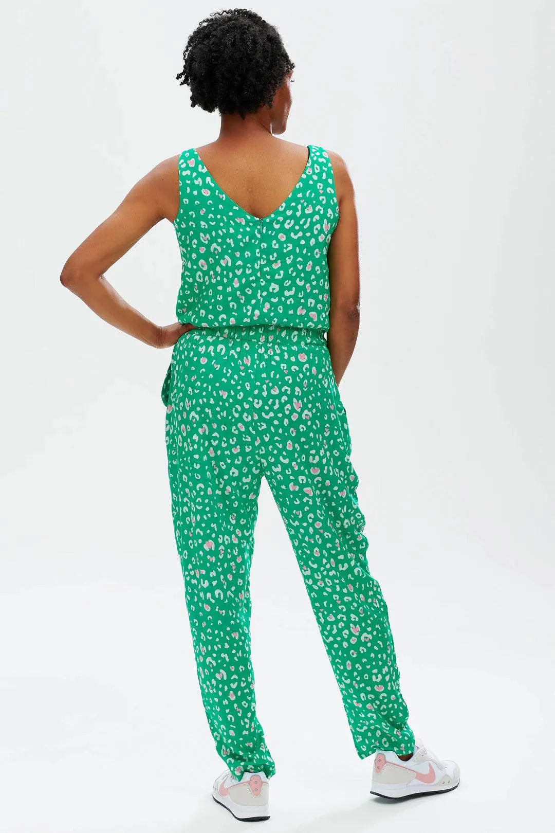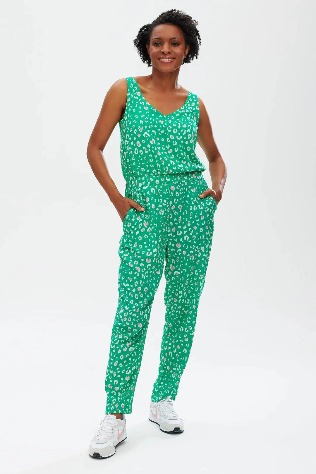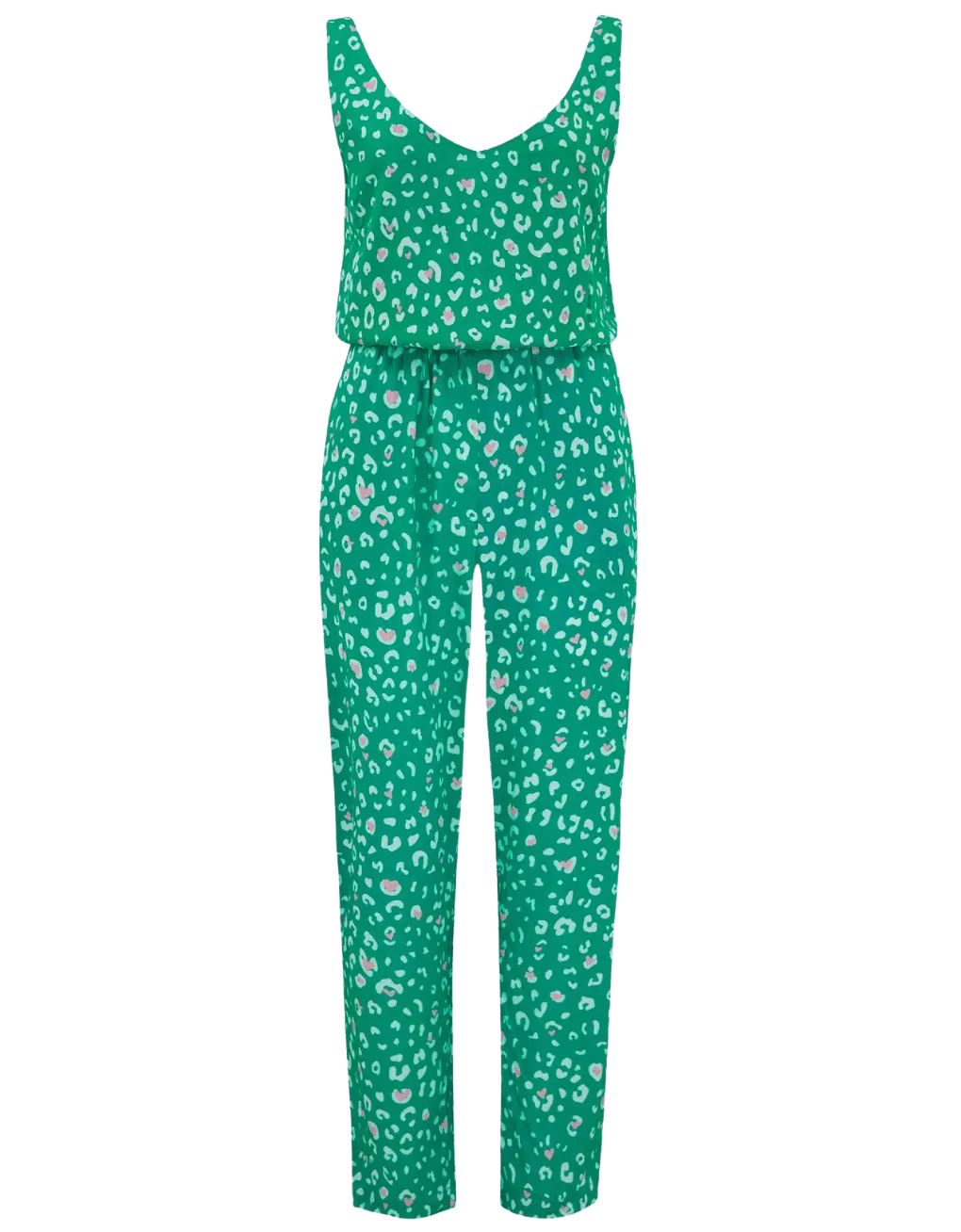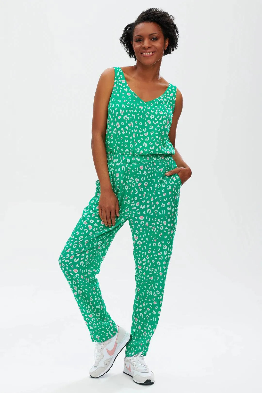 Dieser frische grüne Overall ist leicht und luftig und ideal für wärmere Tage. Der Carly Jumpsuit hat einen V-Ausschnitt, einen V-Rücken und einen gerafften, elastischen Bund. Schmal zulaufende Beine verleihen diesem Modell eine schmeichelnde Form, die sich wunderbar mit Ihren Lieblingsturnschuhen oder Sandalen kombinieren lässt. Dieser grüne Overall hat einen Animal-Print in Cremeweiß und Pink.