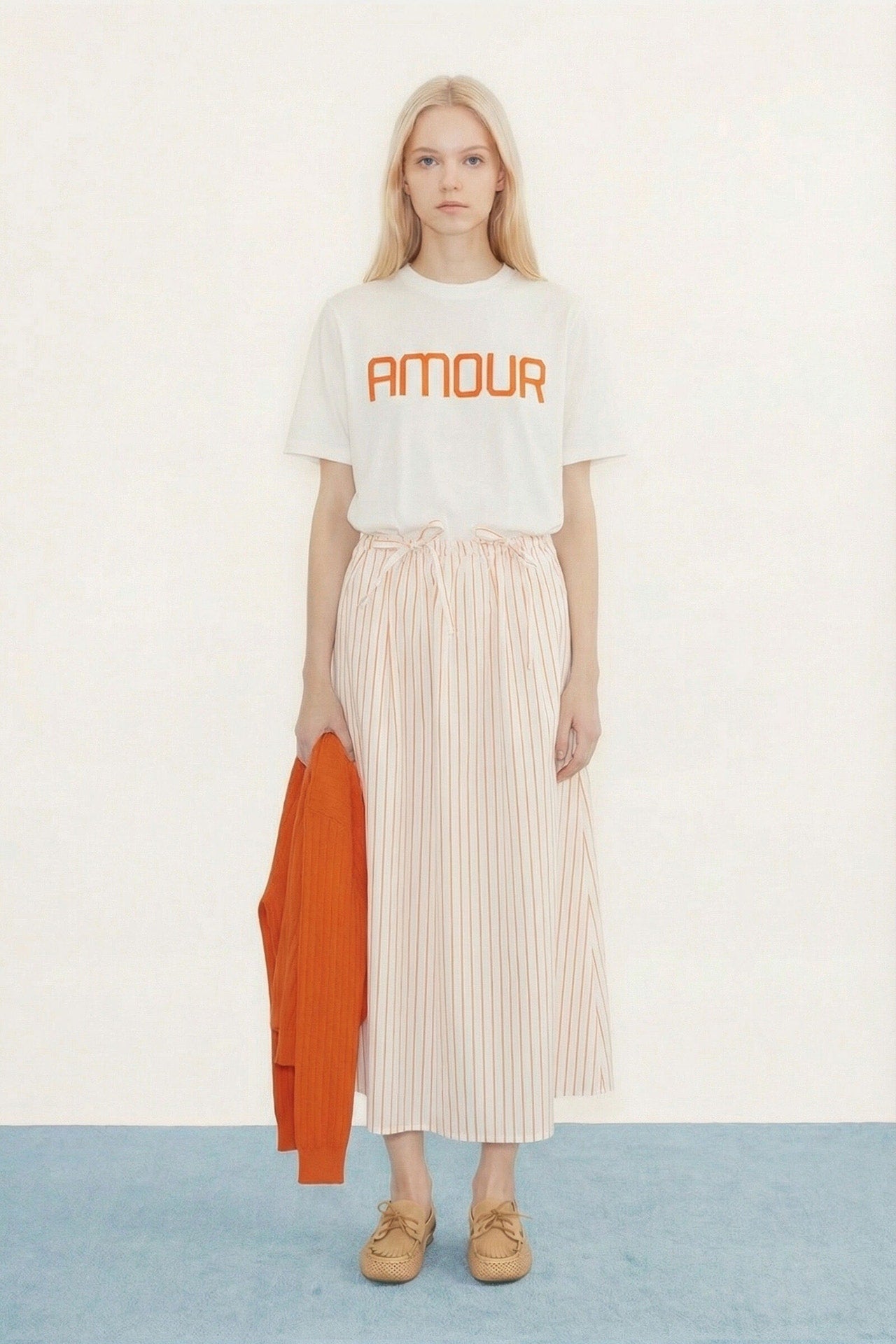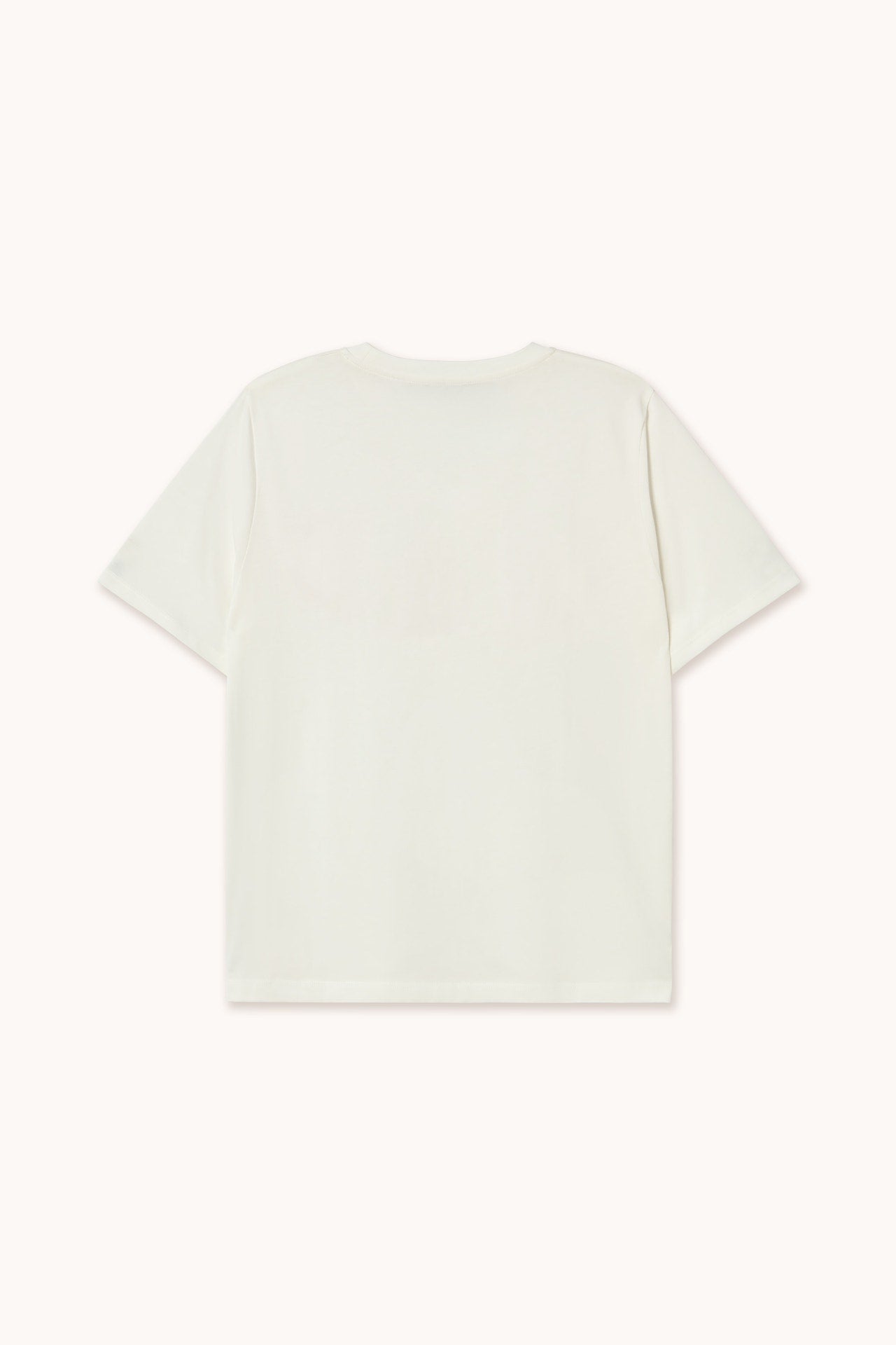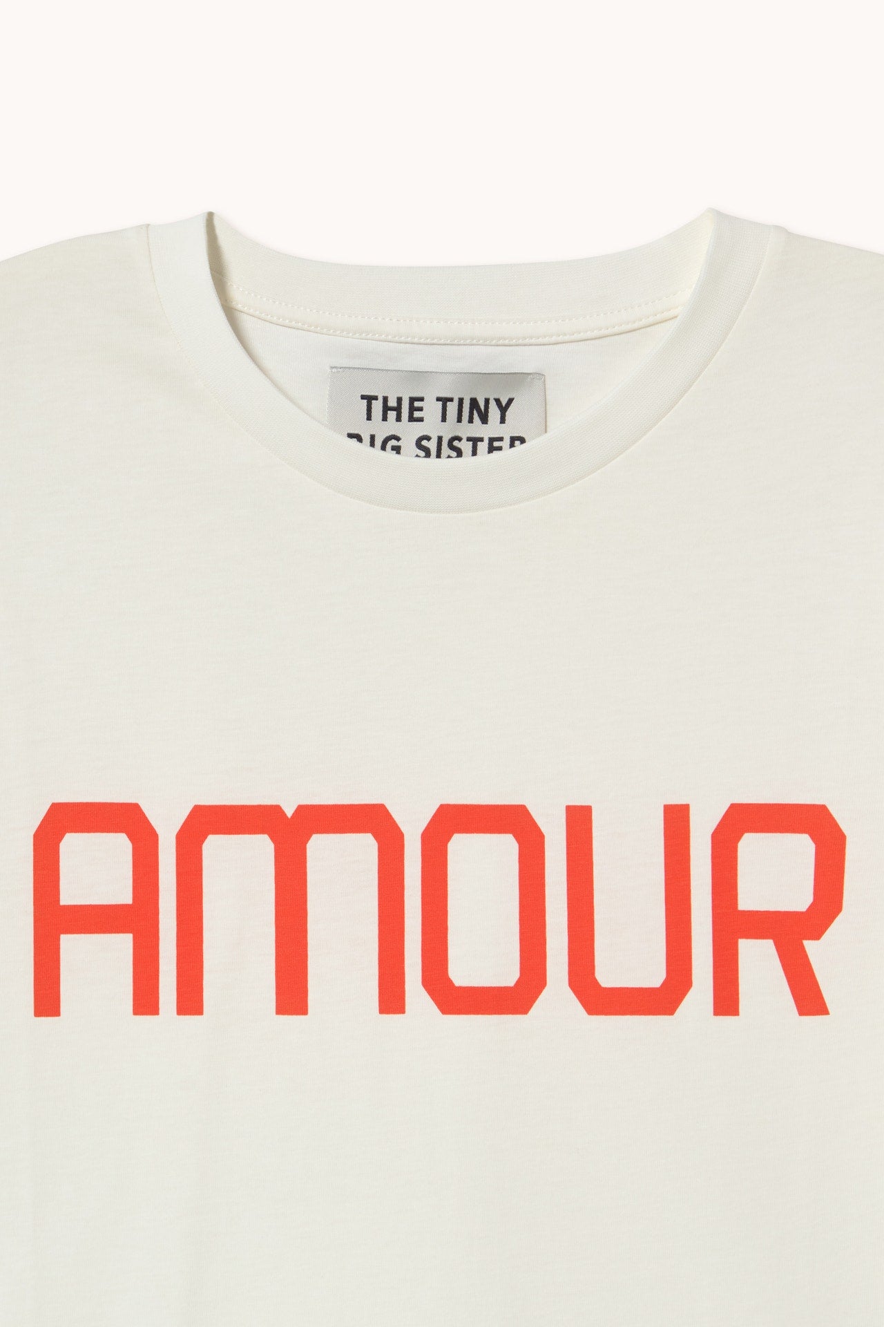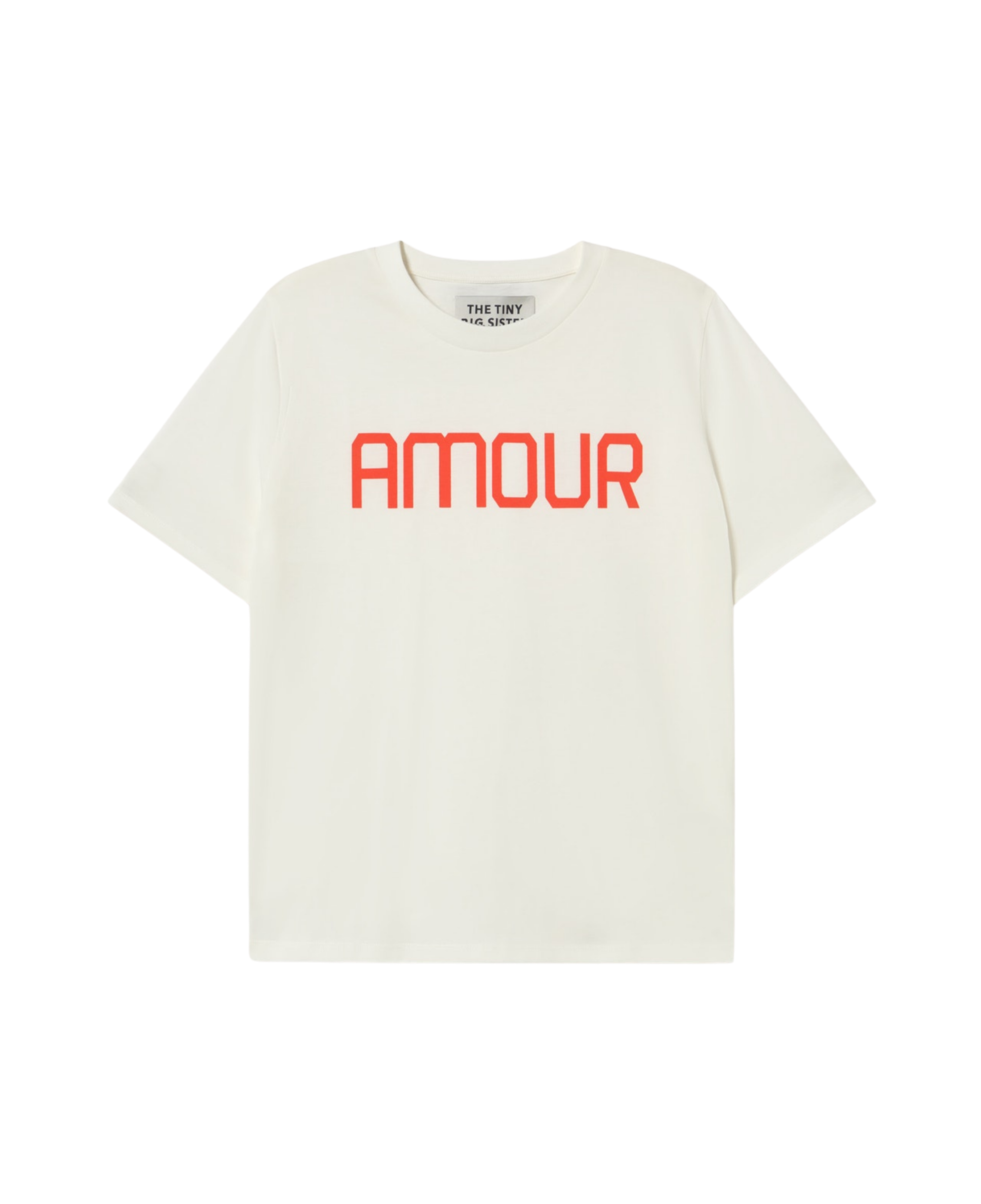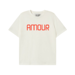 Camiseta de corte relajado confeccionada en algodón orgánico de punto liso, con estampado llamativo “AMOUR”. Sobre una base color blanco roto.