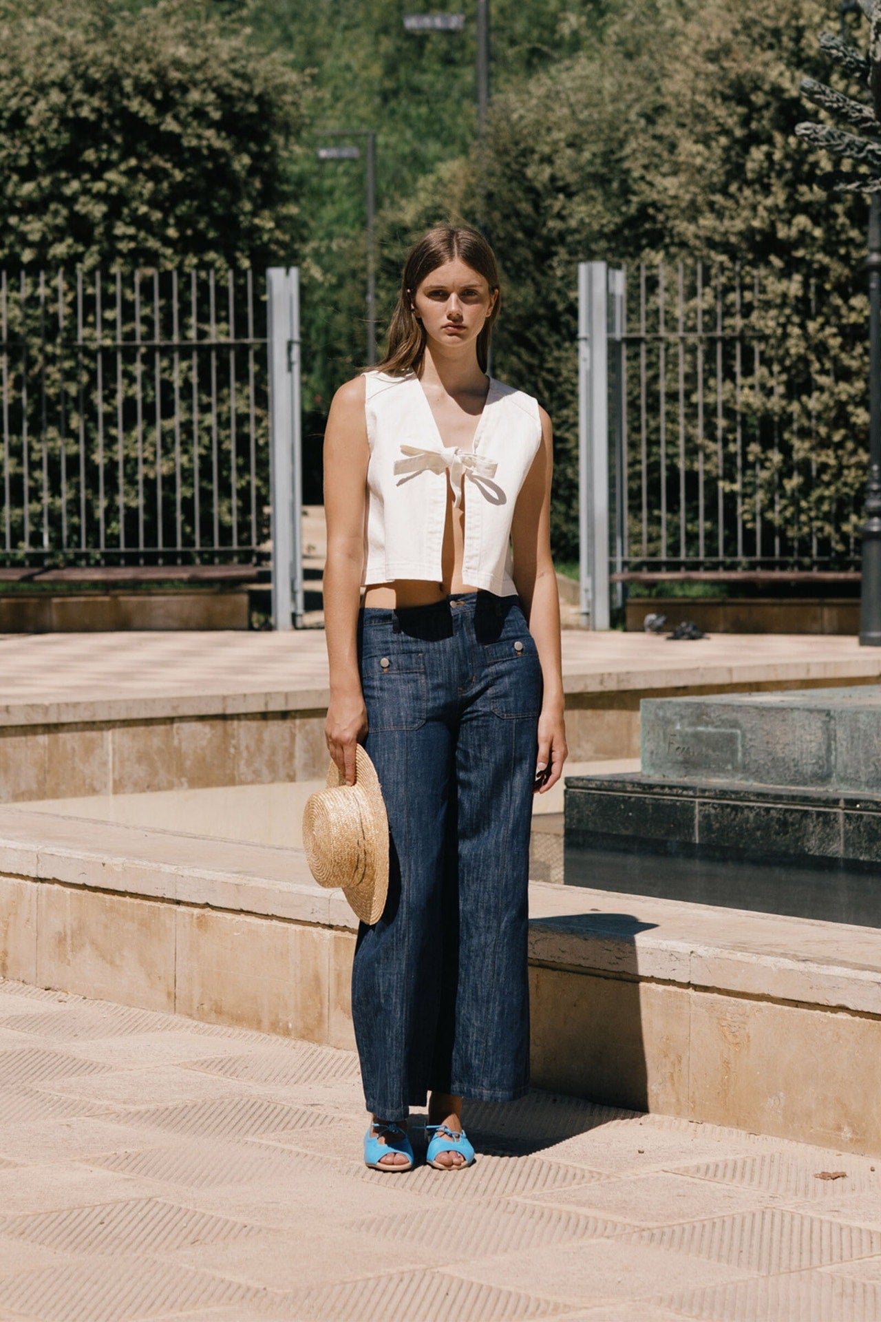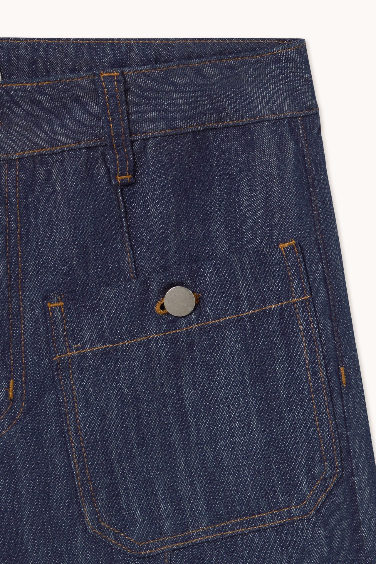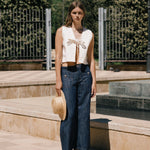 Vaquero confeccionados en mezcla de lino y algodón con acabado efecto denim, ligeros y transpirables. De base azul marino, presentan corte recto, bolsillos parche delanteros y cierre frontal con cremallera y boton. Combínalos con el top a conjunto para un look coordinado.