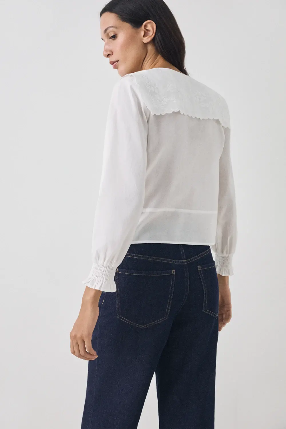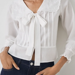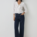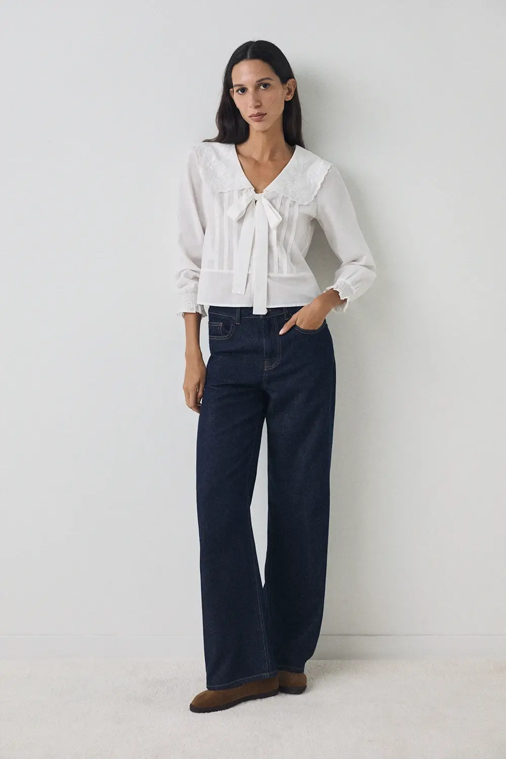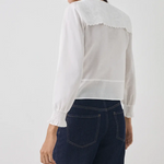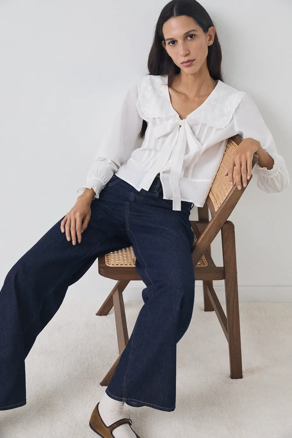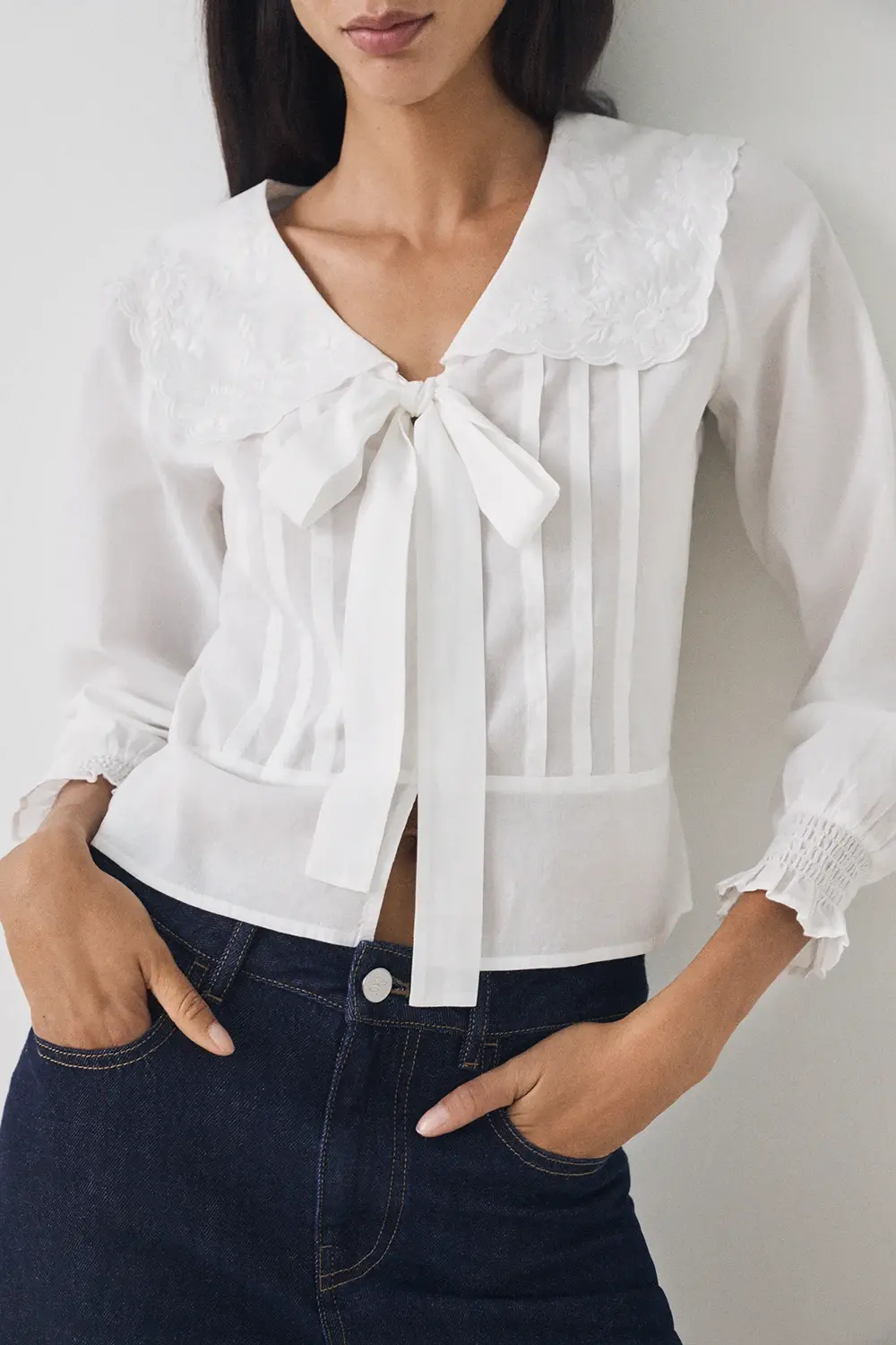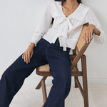 La Camisa Algodón Lazo Agatha en color blanco de eseOese es una prenda femenina de diseño refinado y aire romántico. Confeccionada en 100 % algodón BCI, ofrece ligereza y una textura suave al tacto. Destaca por su cuello con lazo, los pliegues decorativos en el delantero y los puños con goma y volante, que aportan movimiento y un toque elegante. Su corte recto la hace cómoda y versátil, perfecta tanto para looks casuales como para combinar con prendas más formales.