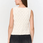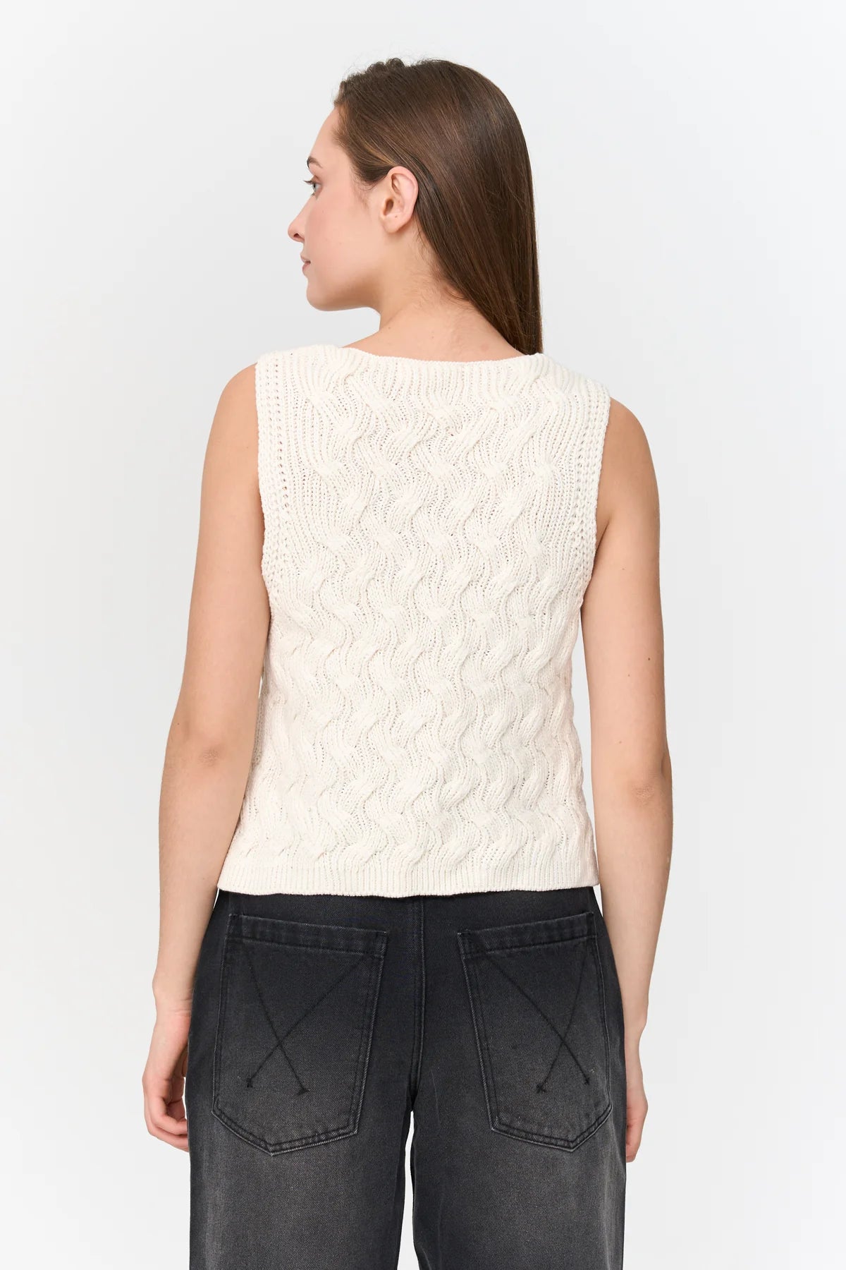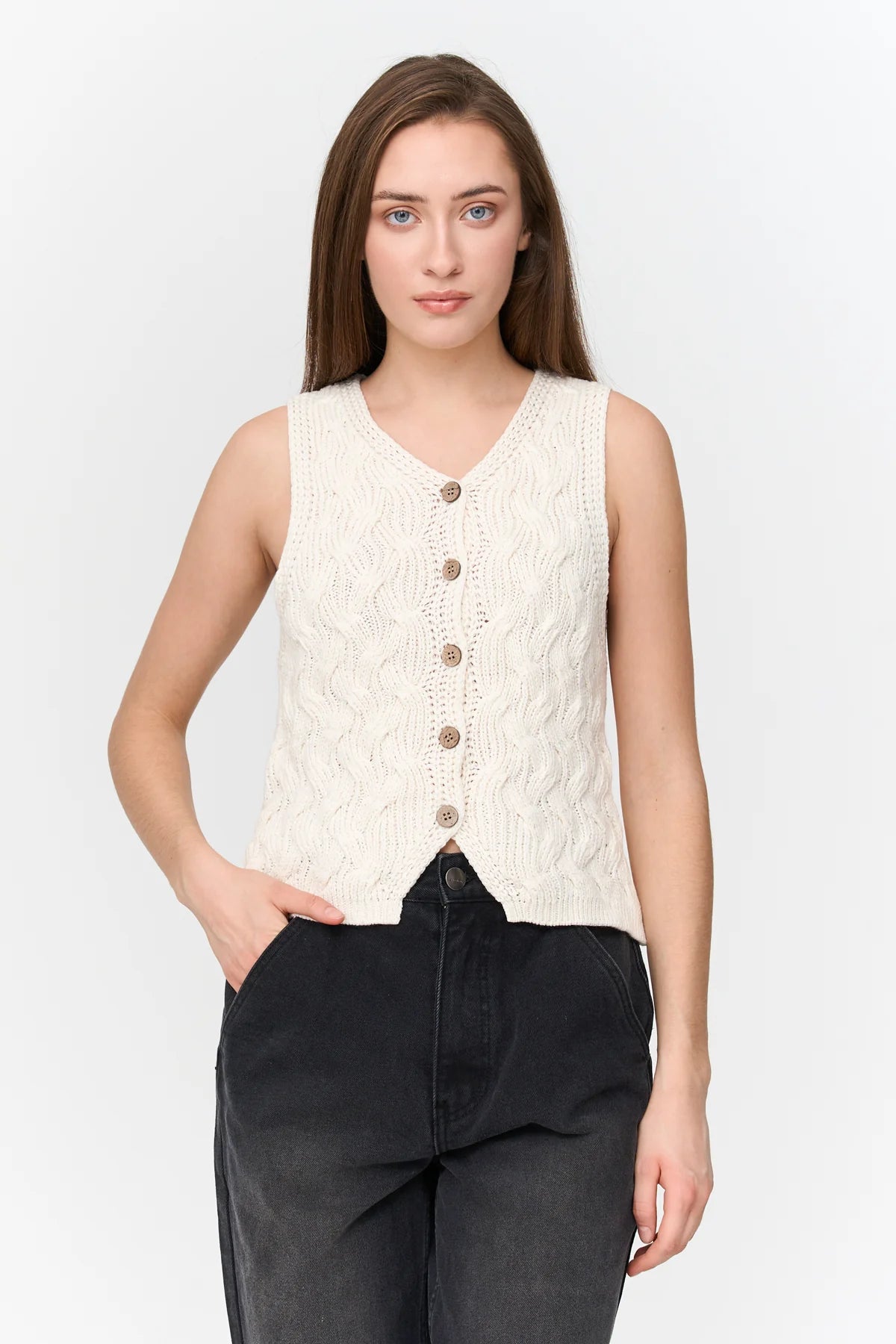 Este chaleco de punto en color crudo de 24colours es la prenda versátil que no puede faltar en tu armario esta temporada. Confeccionado en un tejido trenzado de canalé con un diseño clásico de ochos, combina a la perfección el estilo atemporal con un toque moderno.