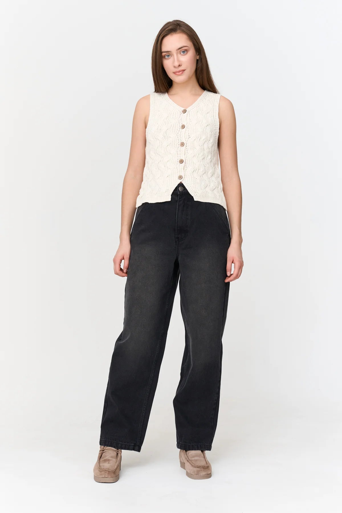 Ideal para combinar con pantalones vaqueros, faldas midi o sobre vestidos, este chaleco de punto crudo es una apuesta segura para crear looks con capas, siguiendo la tendencia layering.