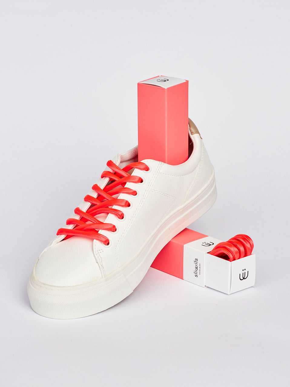 Cordones de color rosa coral vivo, parte de la gama “NEON”, que aportan un acento de color atrevido y moderno a tus zapatillas. Fabricados con técnica al bies para asegurar resistencia, ofrecen diseño original y acabado pensado para destacar.