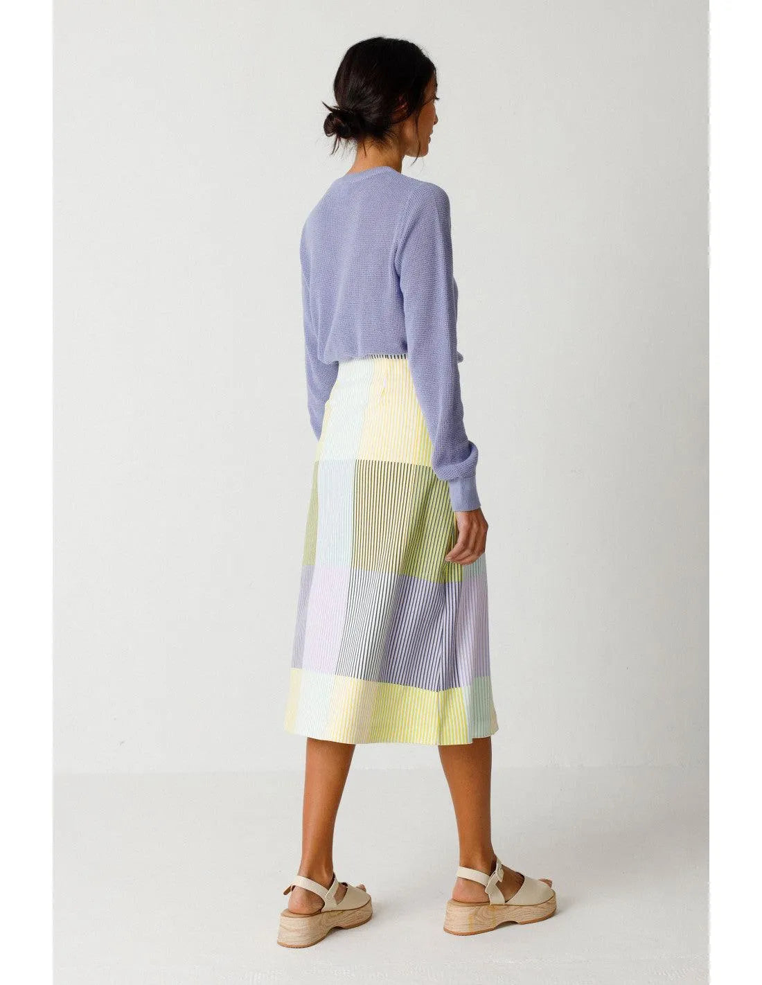 Rock aus GOTS-zertifizierter Bio-Baumwolle. Unterhalb des Knies lang mit vorderer Öffnung und ausgestellter Form. Bequemer, elastischer Bund und Stretch-Strickstoff. Karierter Druck.